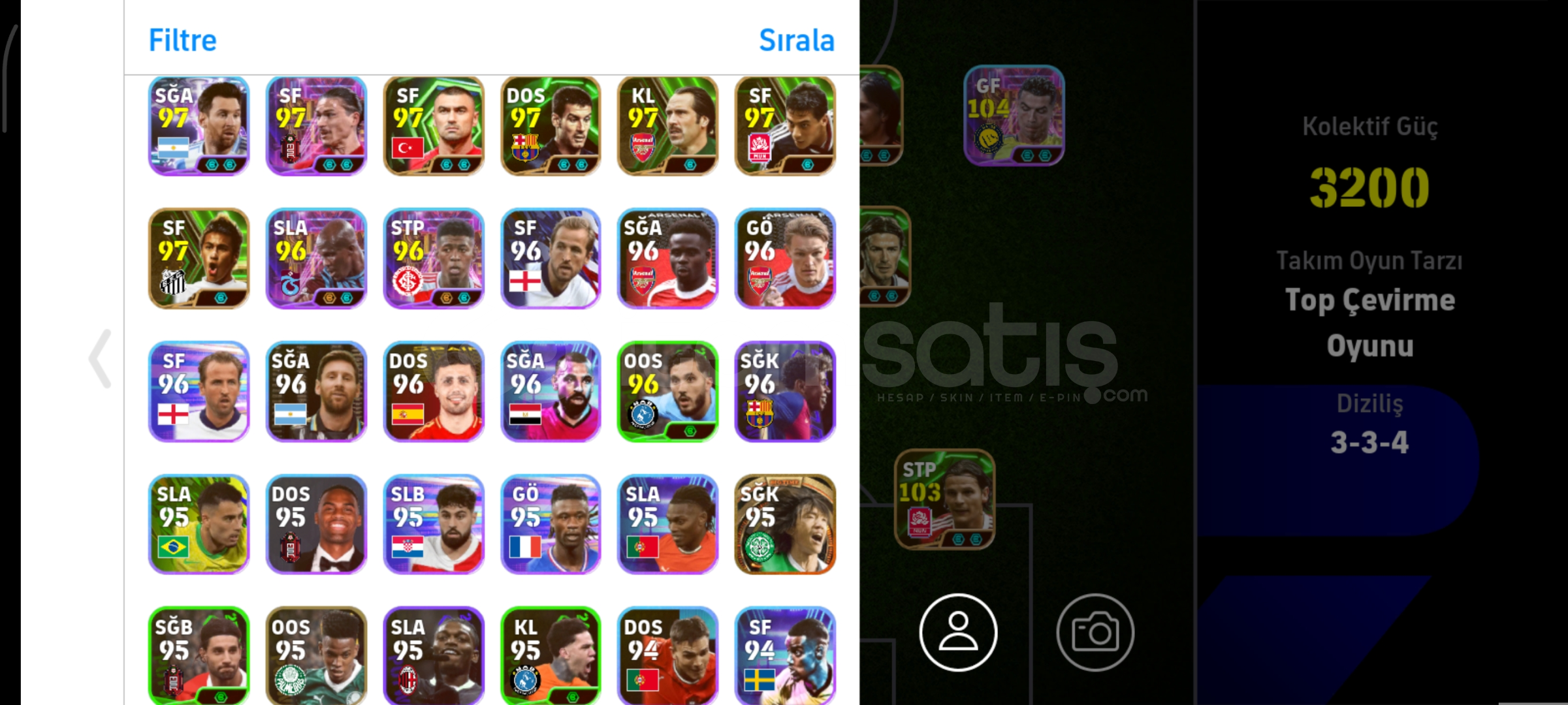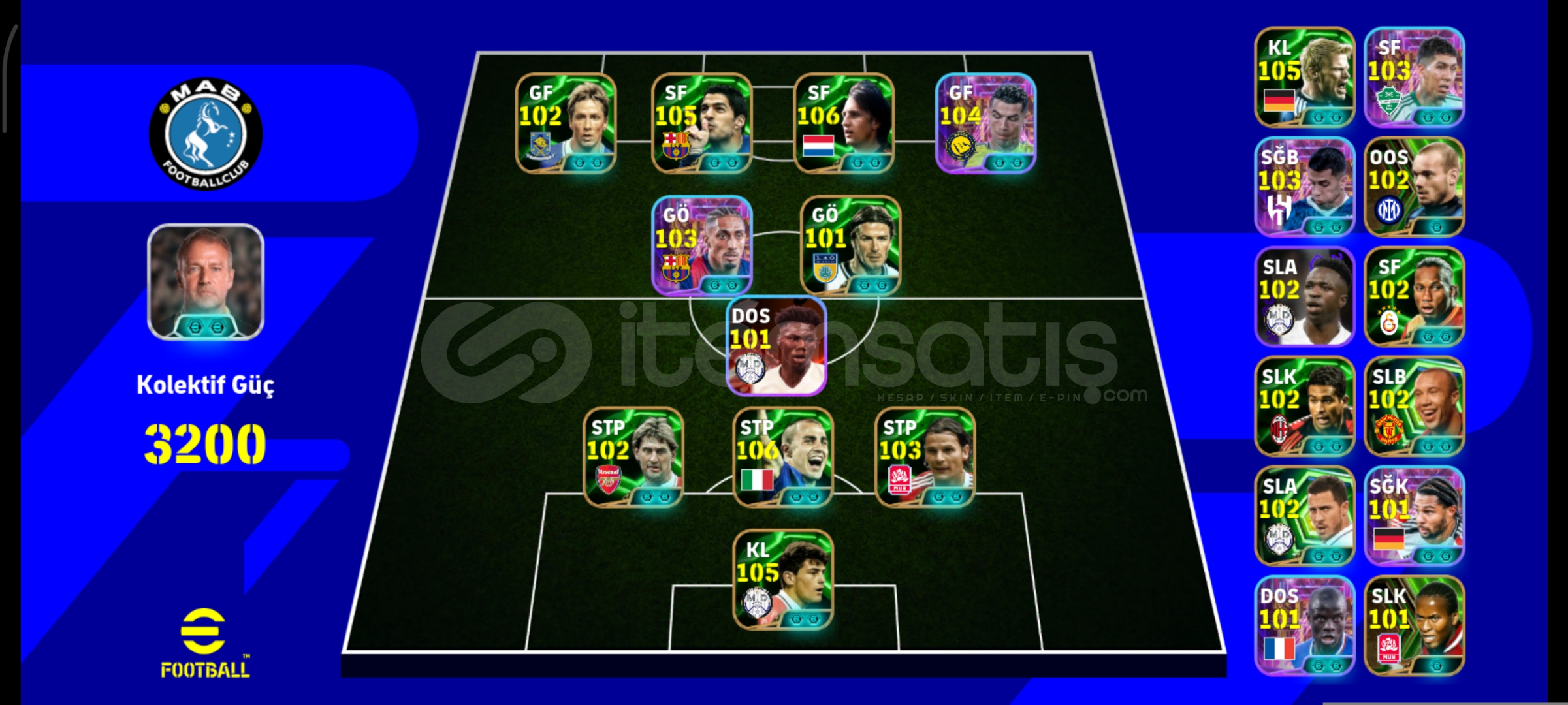 3200 KOLEKTİF GÜÇ FARKLI MENAJERLERLE DAHA FAZLA ARTTIRILABİLİR.FOTOĞRAFLARDADA GÖZÜKTÜĞÜ ÜZERE 3 ADET GÜÇLENDİRİCİLİ MENAJER BULUNMAKTADIR.106 CRUYFF , 105 KAFACI SUAREZ , 104 RONALDO GİBİ YILDIZ İSİMLER BULUNMAKTADIR.YETERLİ REZERVE SAHİP BİR HESAPTIR.TEK BAĞDIR EKSİ MC KESİNLİKLE YOKTUR BOLCA GİRİŞ HAKKI MEV...