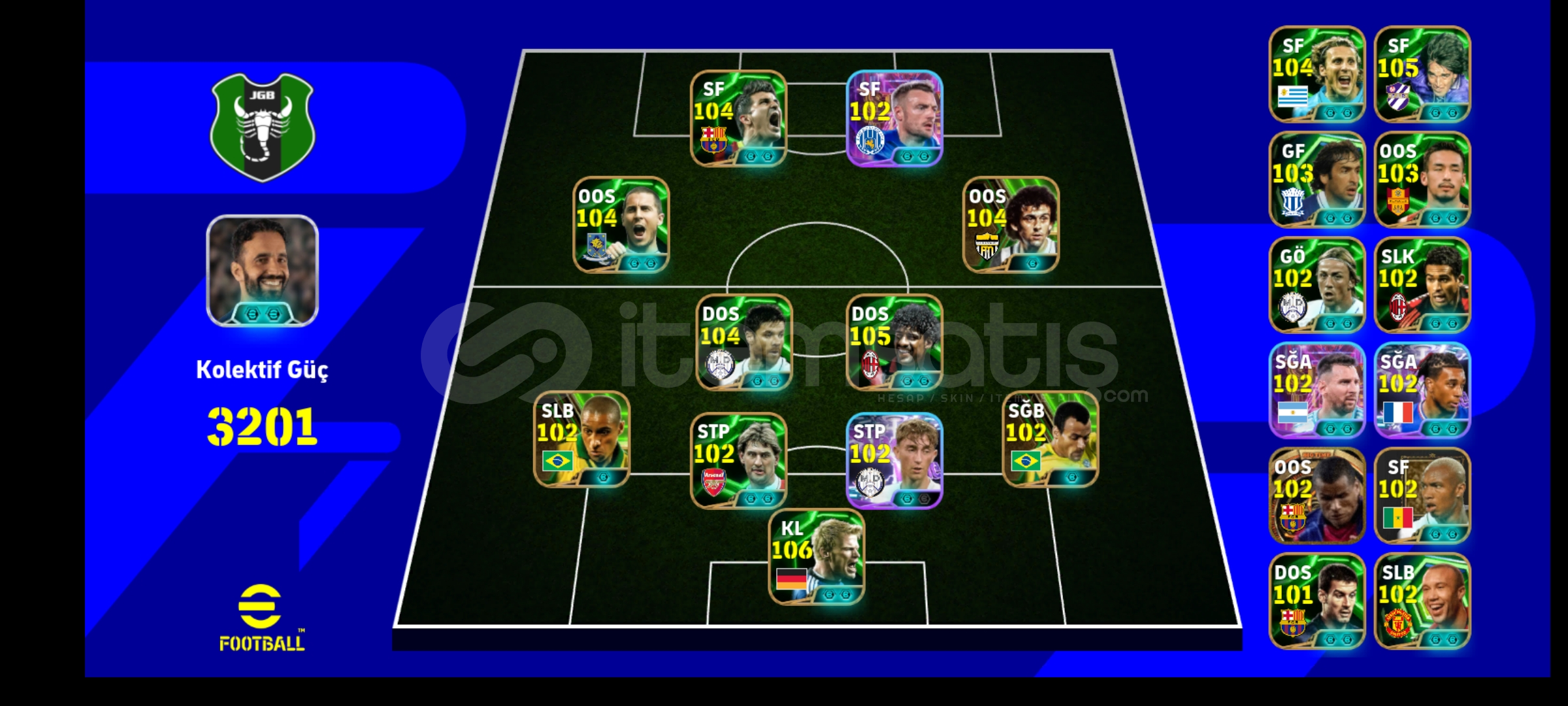çok güzel hesab uygun fiyatlı iOS/Android tek bağ hesabta 3 bombacı var dolu epic var güzel kartlar var.104 David Villa (BOMBACI)104 Eden Hazard104 Xabi Alanso105 Frank Rijkaard104 Diego Forlan105 Batistuta103 Nakata102 Guti Hernandez102 Vardy104 Michel PlatiniKADRO DIŞINDA 6 TANE EPİC VAR 3 SHOW TİME VAR4 AYRI GÜÇLENDİRİCİLİ MENAJER VAR