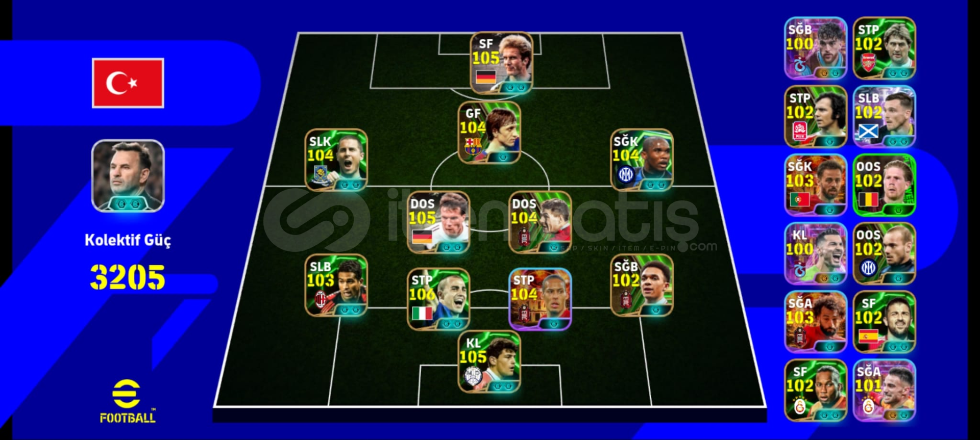 3205 güçlü hesap 2 bombacı vardır. 104 eto 105 rummenigge gibi kartlarım vardır. KONAMI ID VE TEK BAĞ VARDIR.