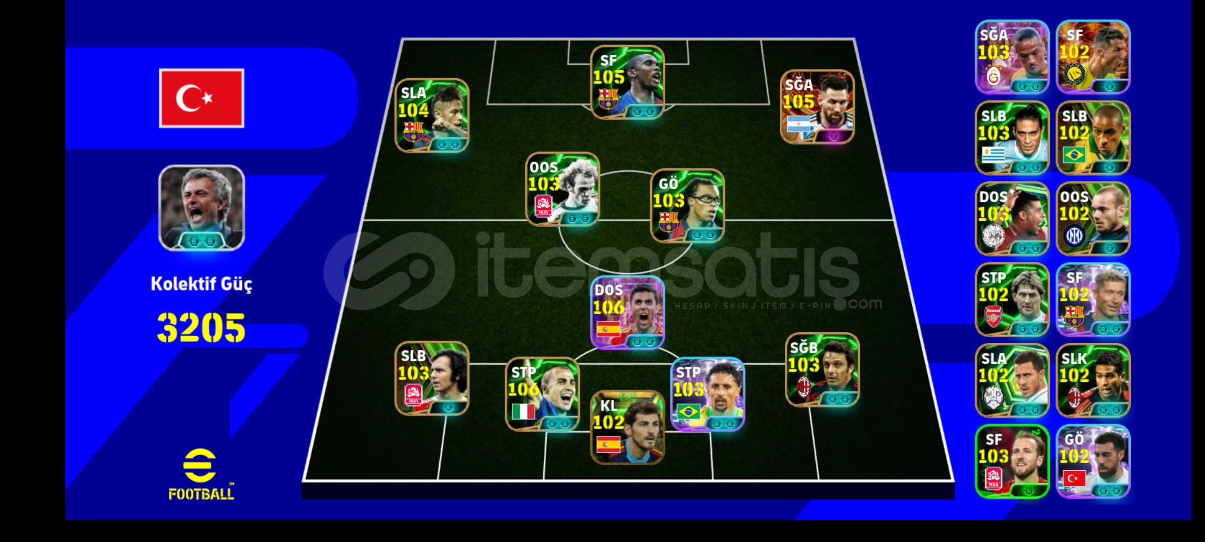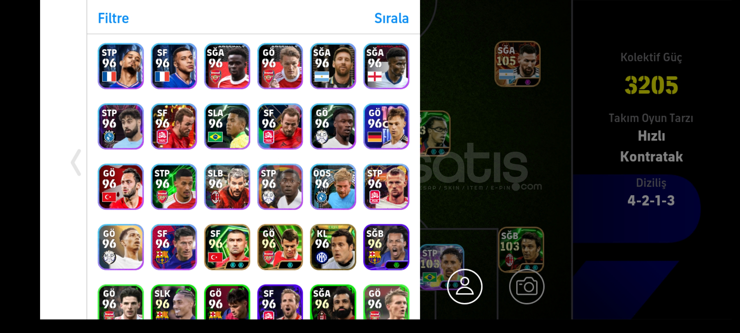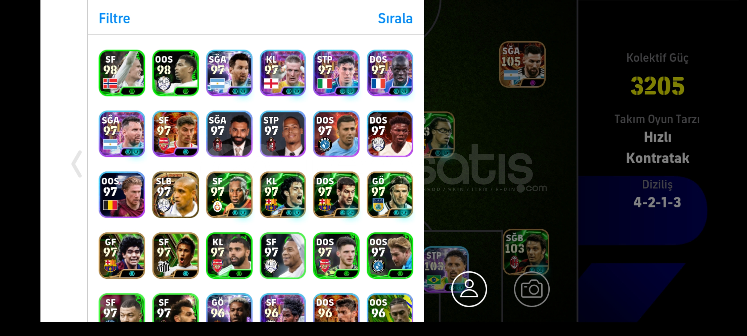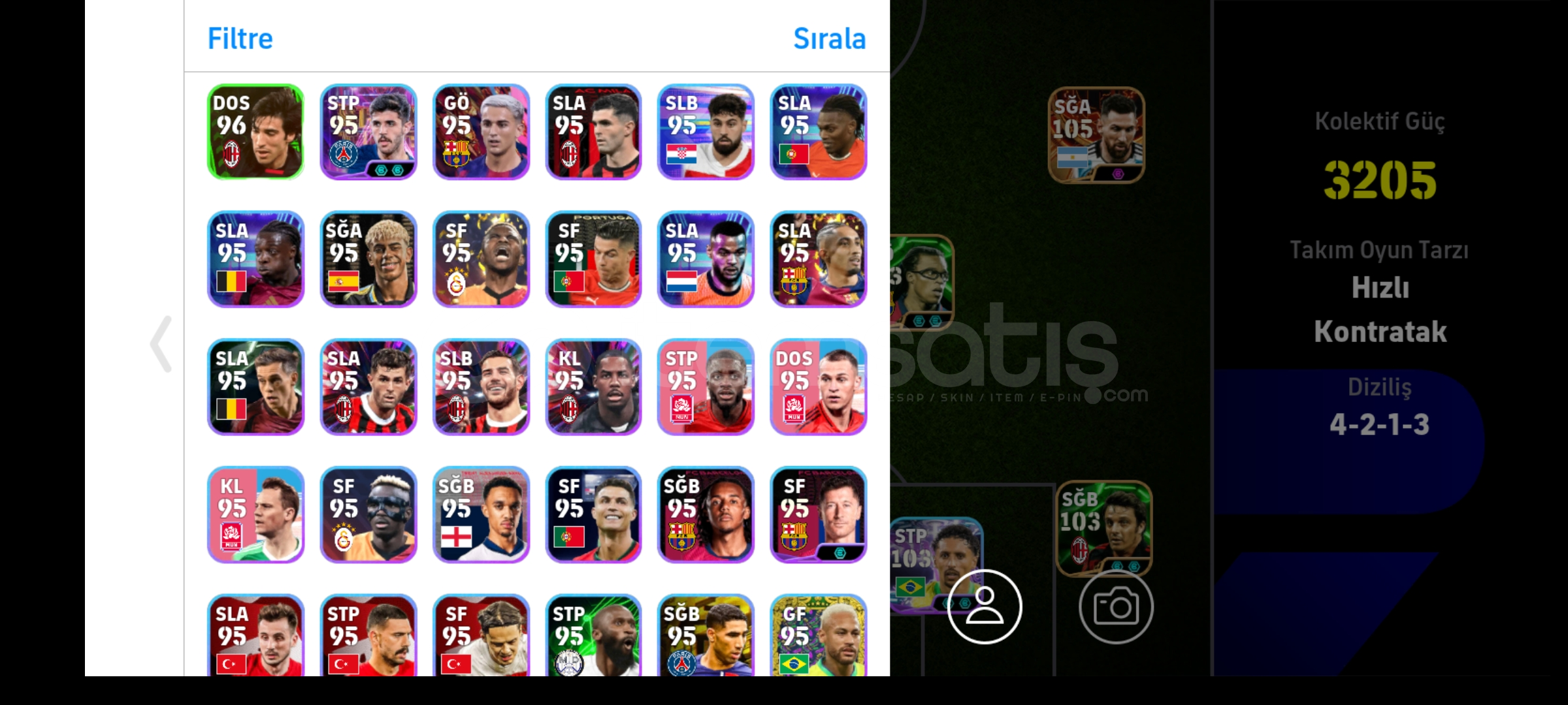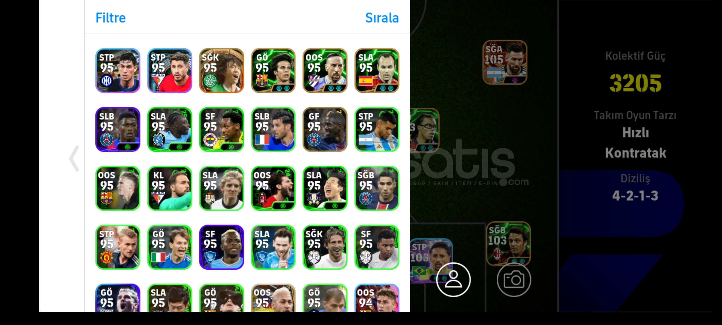 Hesap çok güzel⭐105 Messi ⭐ 103 bombacı Hoeness⭐106 Rodri⭐103 bombacı Sane ⭐ birsürü paralı oyuncu ve epik.