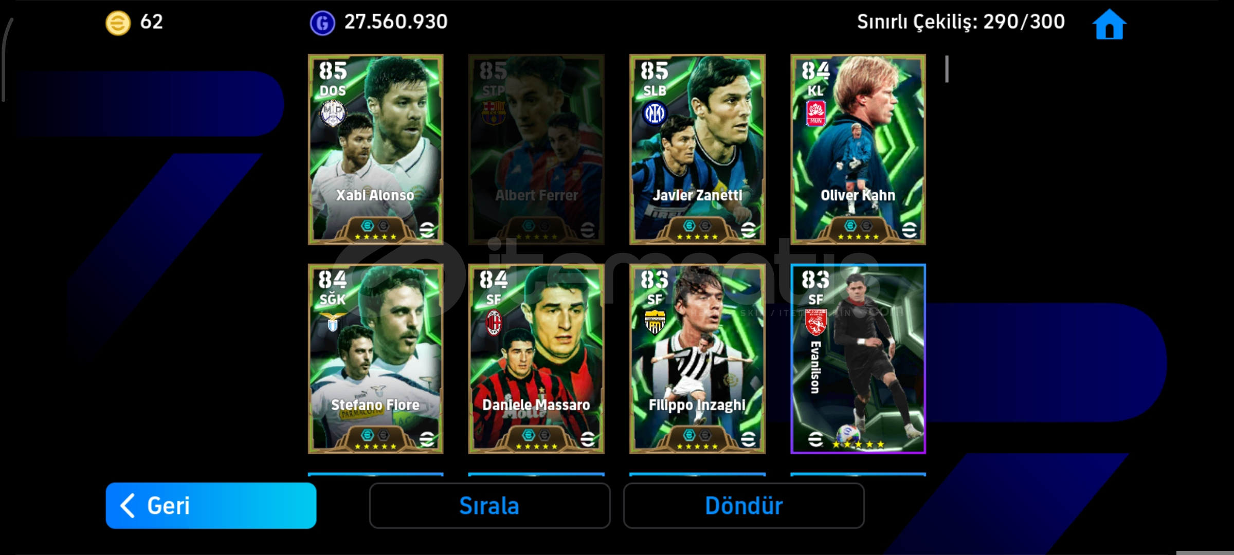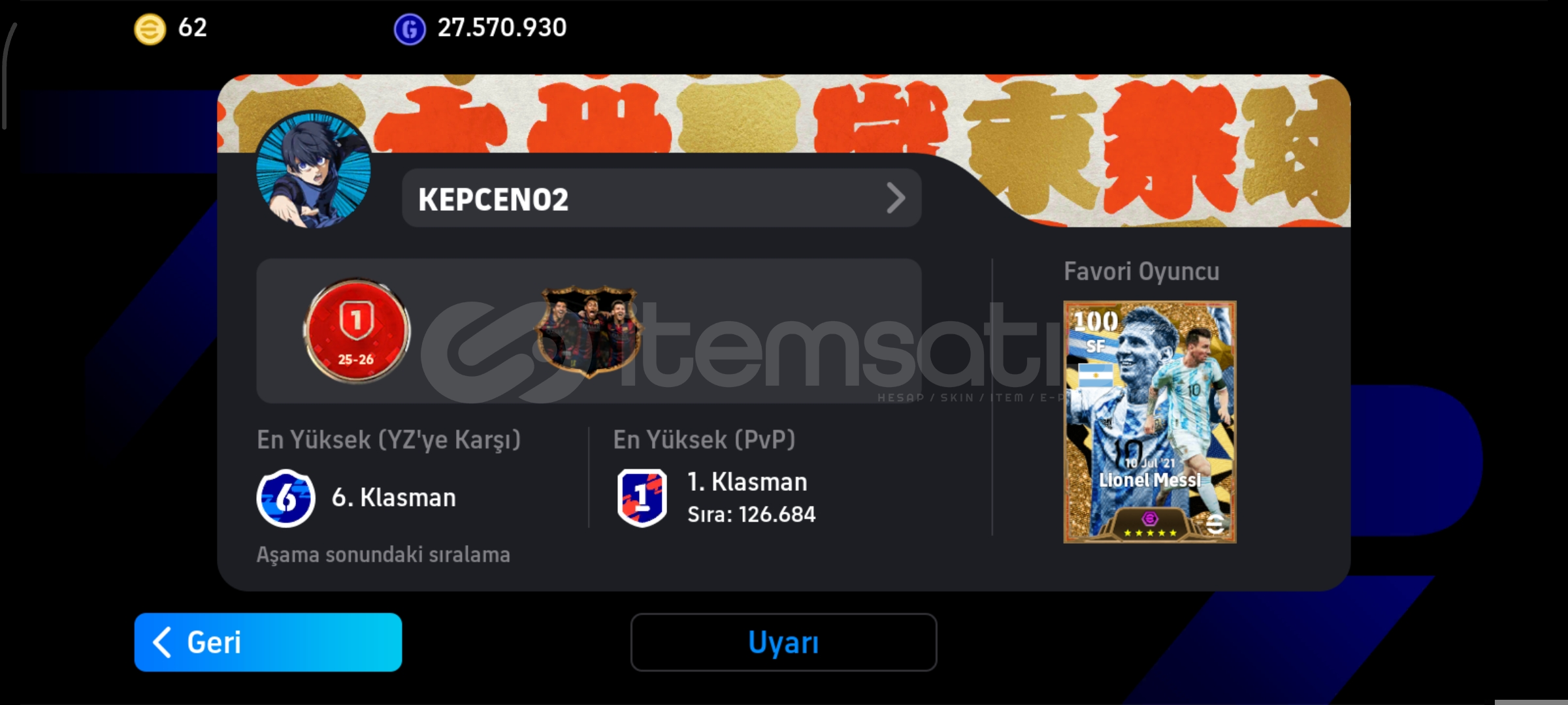 🔥 PREMIUM PES HESABI – FULL ELİT KADRO 🔥3. Klasman🌟Messi – Oyunun en üst seviye hücumcu🌟Schmeichel-Oyunun en iyi seviye kalecisi🌟Tati- Oyunun en üst hücumcu🌟 Arda🌟 Peri🌟Puyol🌟Xabi🌟Ze Roberto🌟Ferrer🌟 | Kadro eksiksizdir, MC açığı yoktur.🌟 | Hesap tek bağdır – tamamen güvenli ve temizdir.🌟 | E-posta deği...
