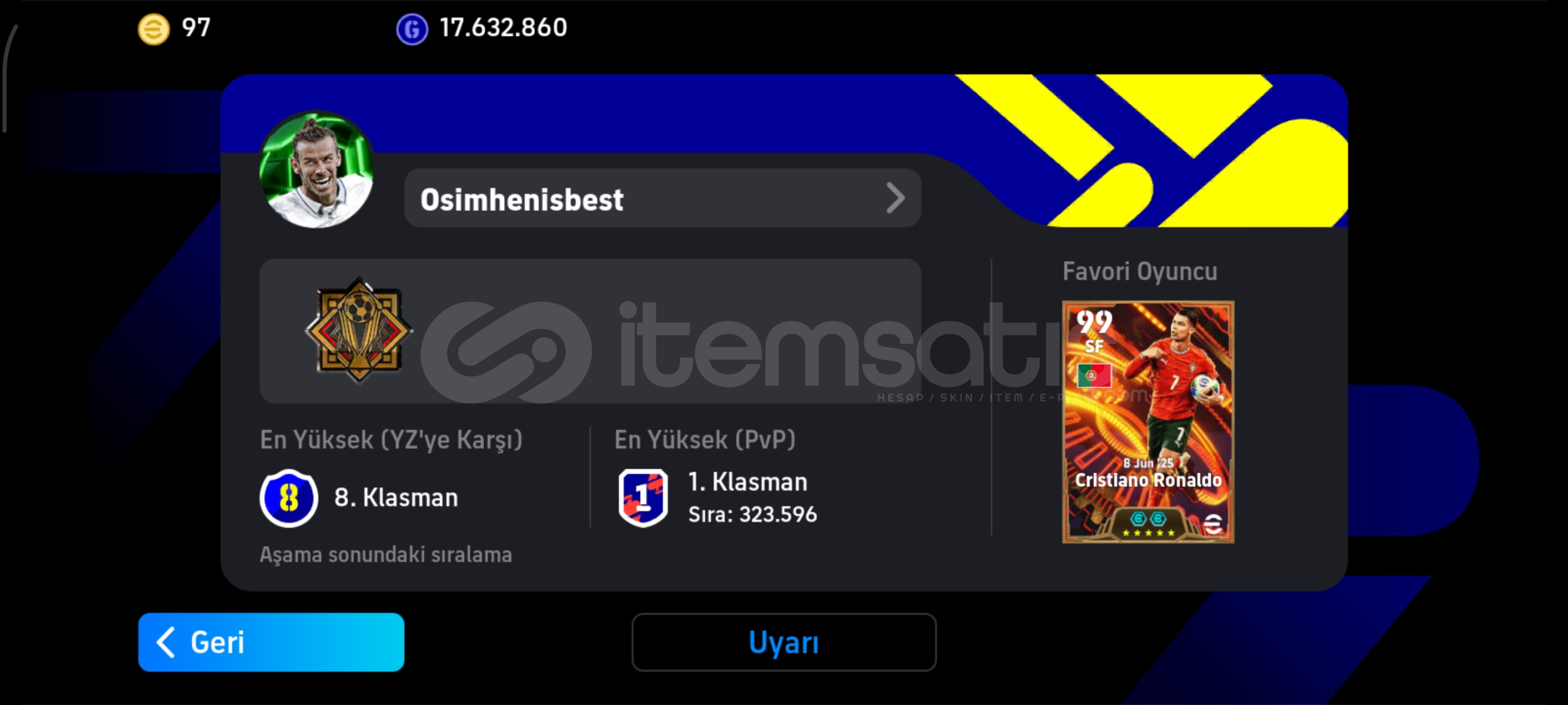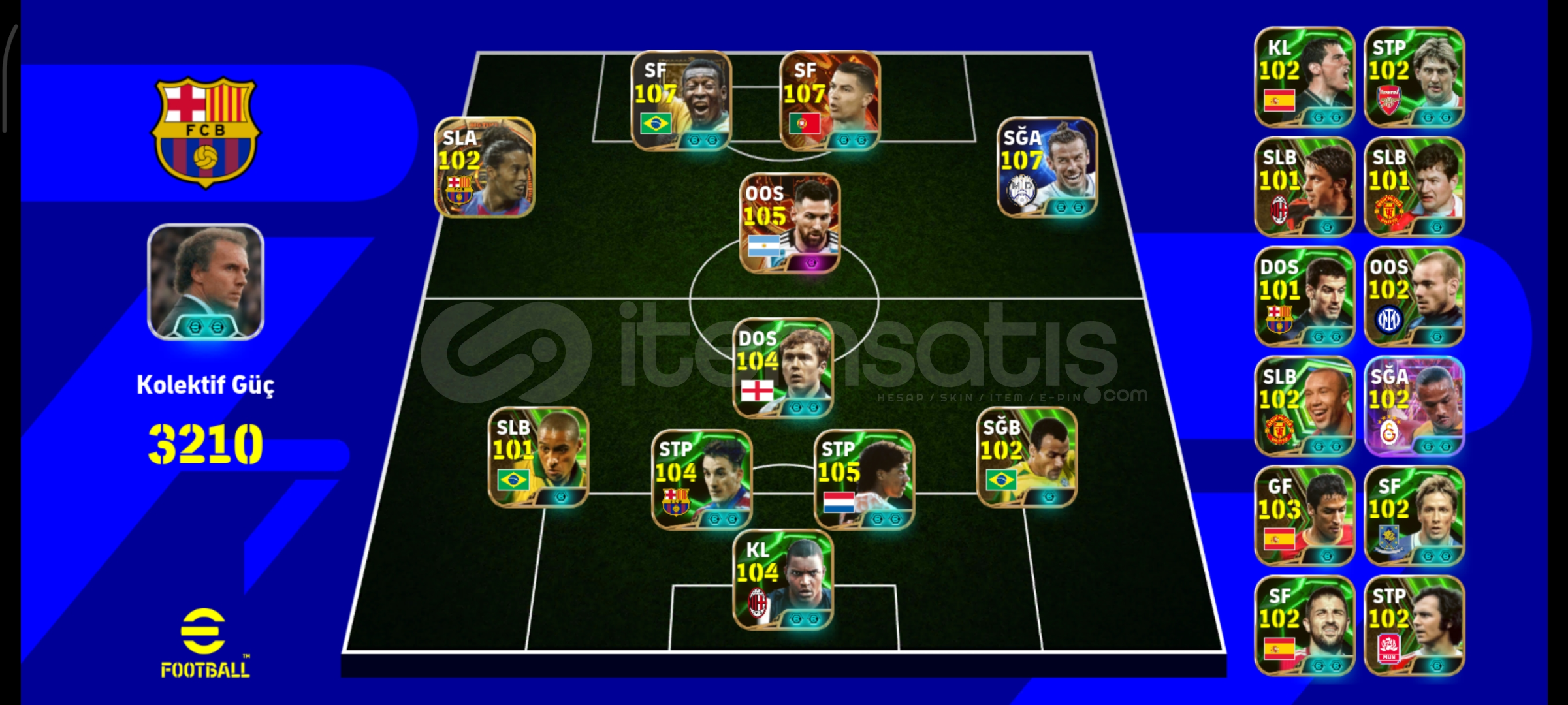 💥 Genel Bilgiler:Kolektif Güç: 3210Hesap klasman kasılabilecek düzeyde, güçlü bir kadroya sahip.Tek bağa bağlı ve tamamen güvenilirdir.Hesap teslimi güvenli şekilde yapılacaktır.⭐ Öne Çıkan Oyuncular:🟢 Pelé — 108🔴 Cristiano Ronaldo — 107🔵 Gareth Bale — 107🟣 Lionel Messi — 105🟡 Frank Rijkaard — 105⚫ Dida (...