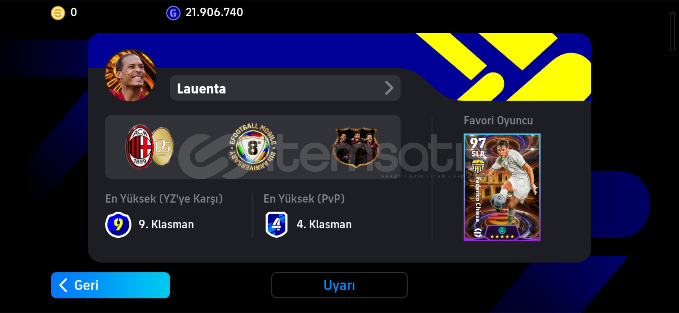 Hesap tek bağdır momentumundan sıkıldım oyunu salıyorum hesaptaki gördüğünüz cheisa yamal puskas ve diğerleride dahil herşey 100 para ile tek atmadır efsane şanslı bir hesaptır birde şansınız varsa tabiki.