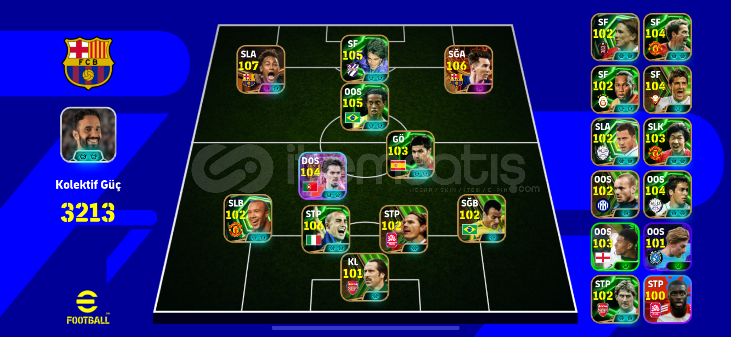 Hesabımız 3213kg olup tek bağdır.107 Neymar, 106 Messi, 105 Ronaldinho ve 102 Drogba gibi değerli kartlar vardır.Ciddi a...