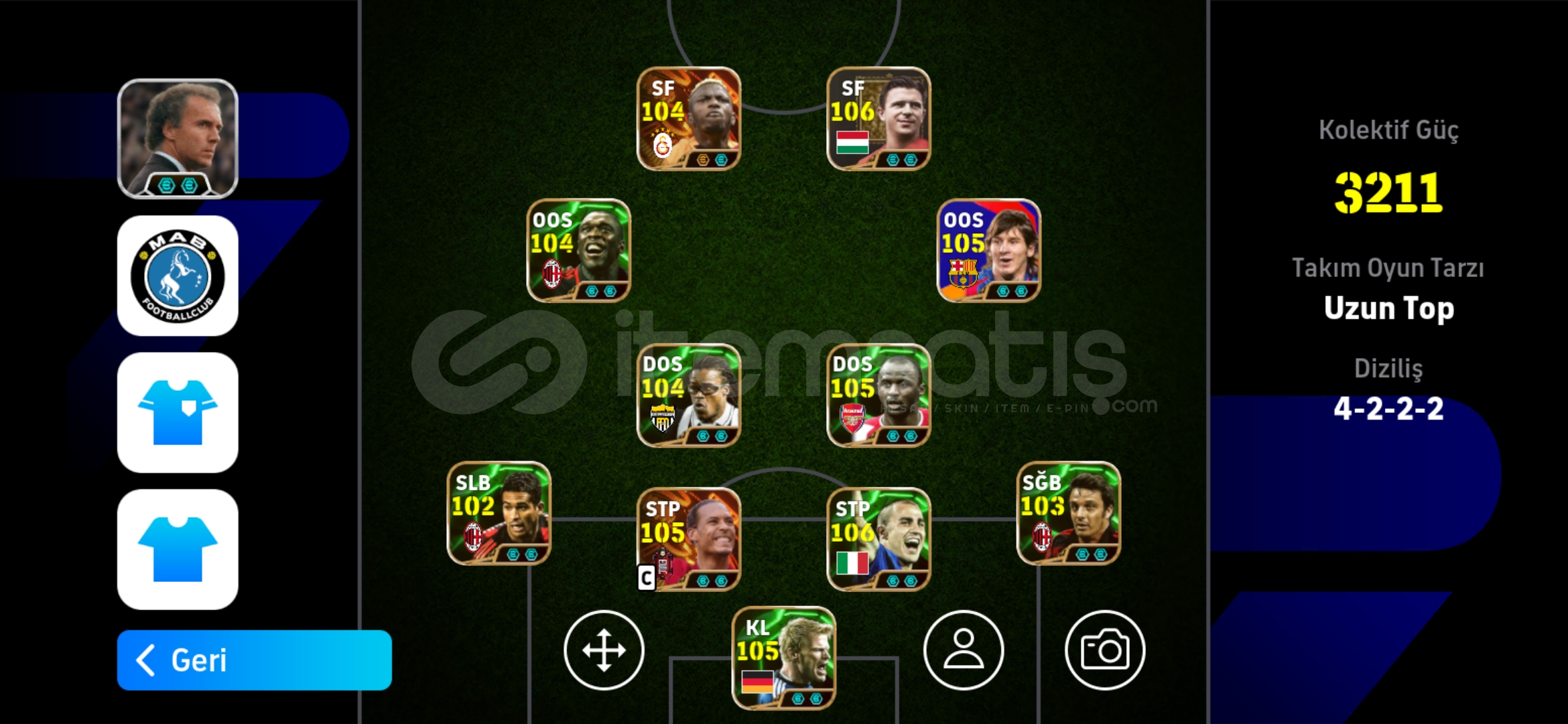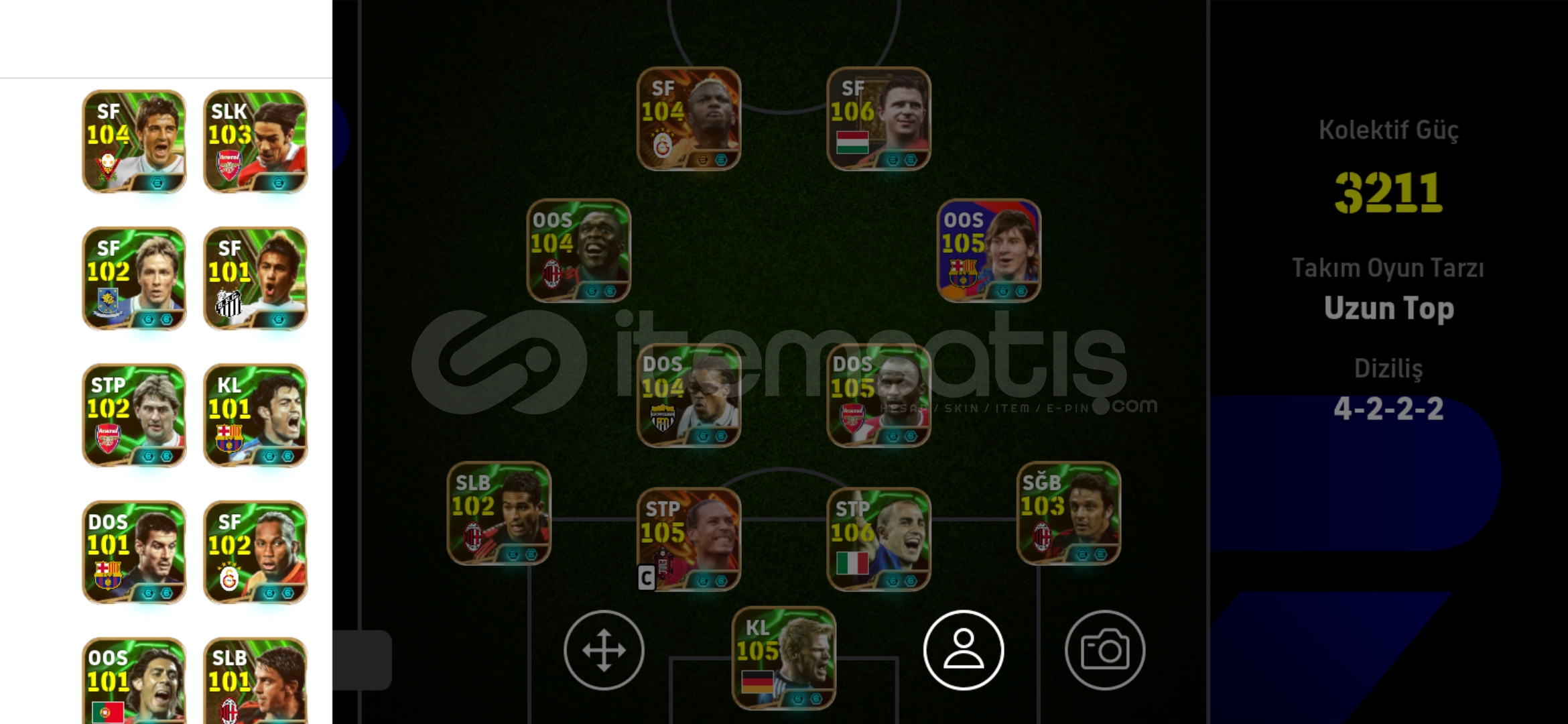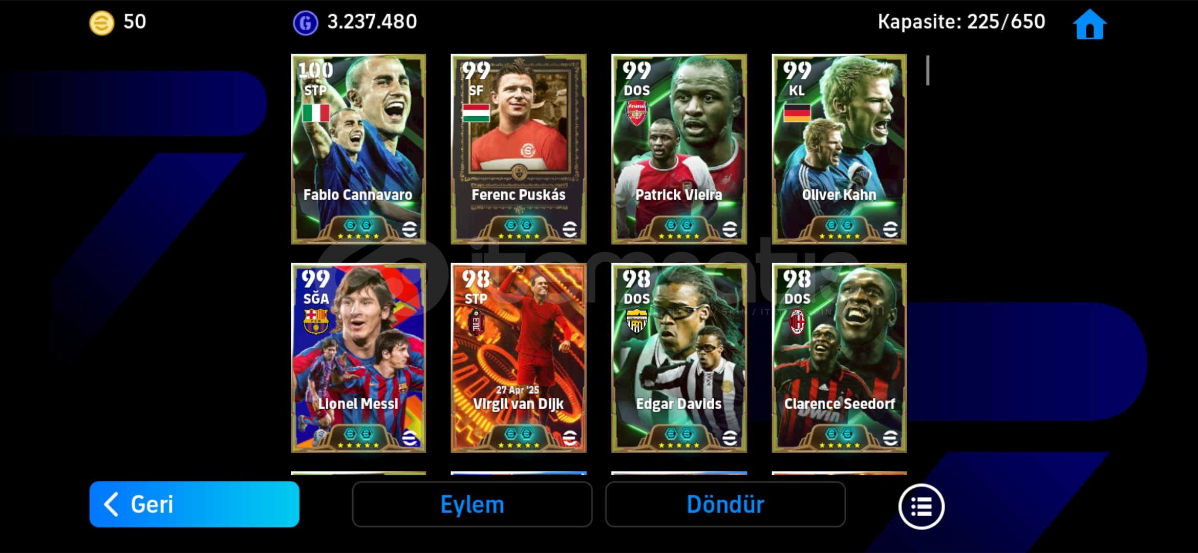 Hesap tek bağdır -mc yoktur Hesaptaki Bazı Değerli Kartlar:107 Osimhen (Bigtime)106 Kahn 106 Cannavaro 106 Puskás 105 Leo Messi 105 Vieira105 Van Dijk (Bigtime)104 Edgar Davids 104 David Villa 104 Seedorf 103 Oddo 103 Serginho 103 Pires102 Torres 102 Pep Guardiola 102 Rui Costa 102 Kante 102 Mbappe101 Neymar Jr 101 Costacurta 101 Van der Vaart 101 Livakovic101 Bastoni 101 Kai Havertz 100 Zeki Çelik +3 Özel Güçlendiricili Menajer -Xabi Alonso -Fr...