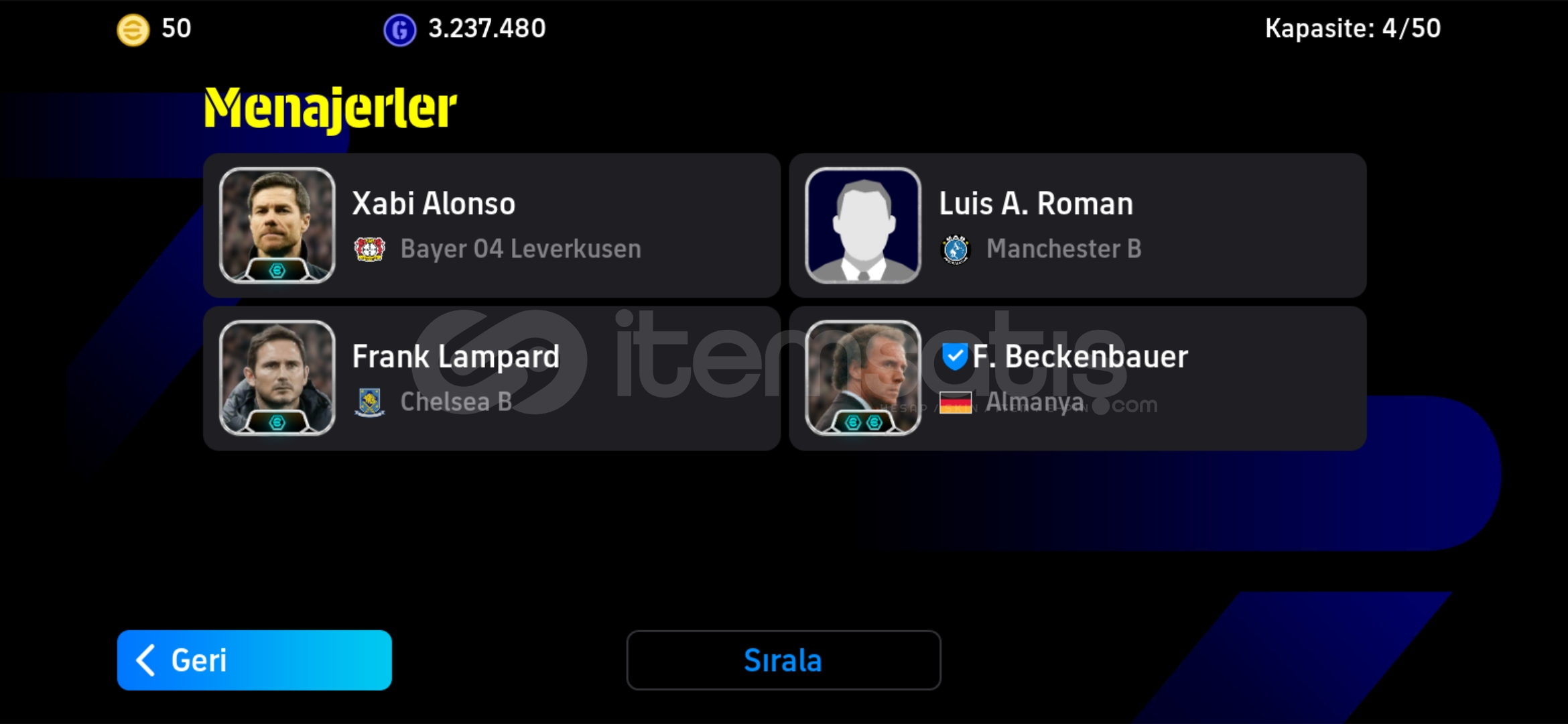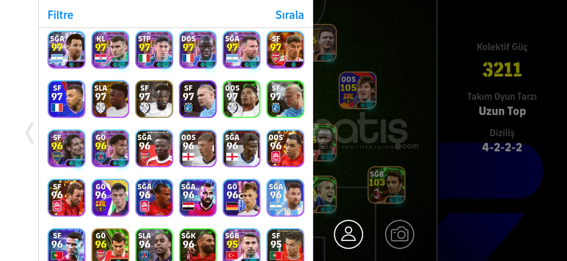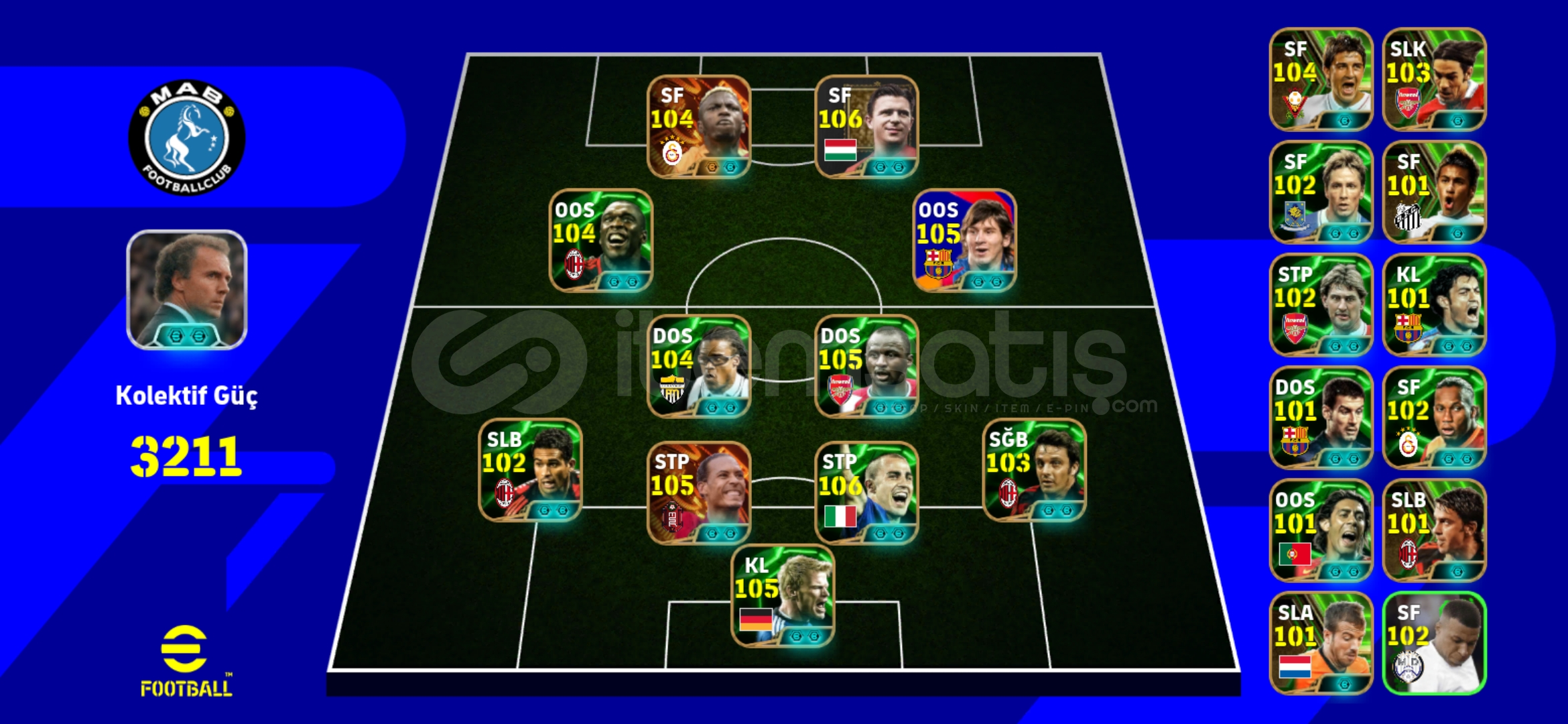 Hesap tek bağdır -mc yoktur Hesaptaki Bazı Değerli Kartlar:107 Osimhen (Bigtime)106 Kahn 106 Cannavaro 106 Puskás 105 Leo Messi 105 Vieira105 Van Dijk (Bigtime)104 Edgar Davids 104 David Villa 104 Seedorf 103 Oddo 103 Serginho 103 Pires102 Torres 102 Pep Guardiola 102 Rui Costa 102 Kante 102 Mbappe101 Neymar Jr 101 Costacurta 101 Van der Vaart 101 Livakovic101 Bastoni 101 Kai Havertz 100 Zeki Çelik +3 Özel Güçlendiricili Menajer -Xabi Alonso -Fr...
