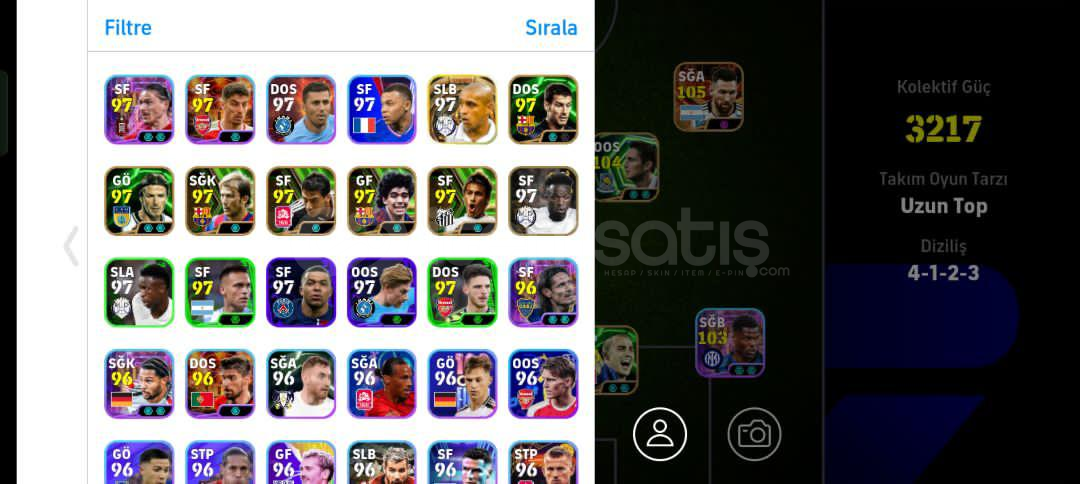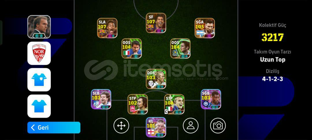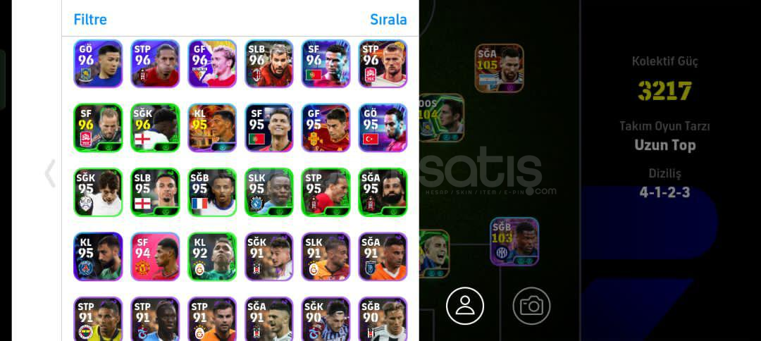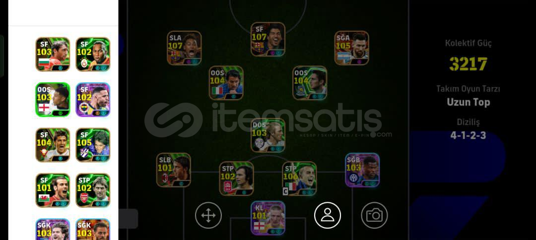 Hesap tek bağdır -mc yoktur Hesaptaki Bazı Değerli Kartlar:107 Suarez (Bigtime)107 Neymar (Bigtime)106 Cannavaro 105 Messi (Bigtime)105 Batistuta 105 En Nesyri104 David Villa104 Lampard 104 Del Piero (Bombacı)104 Beckham 103 Dumfries 103 Stoickhov 103 Ferdi Kadıoğlu 103 Bernardo Silva103 Van Nistelrooy 103 Beckenbauer 103 Bellingham 102 Gareth Bale (Bombacı)102 Tony Adams102 Pizzaro102 Guardiola102 Drogba 101 Costacurta +5 Özel Güçlendiric...