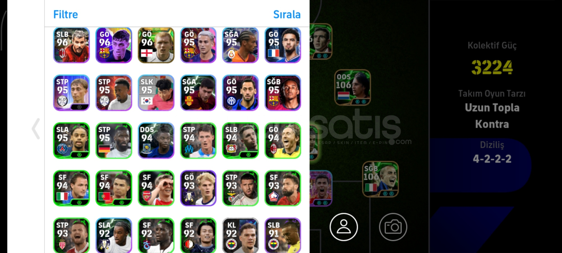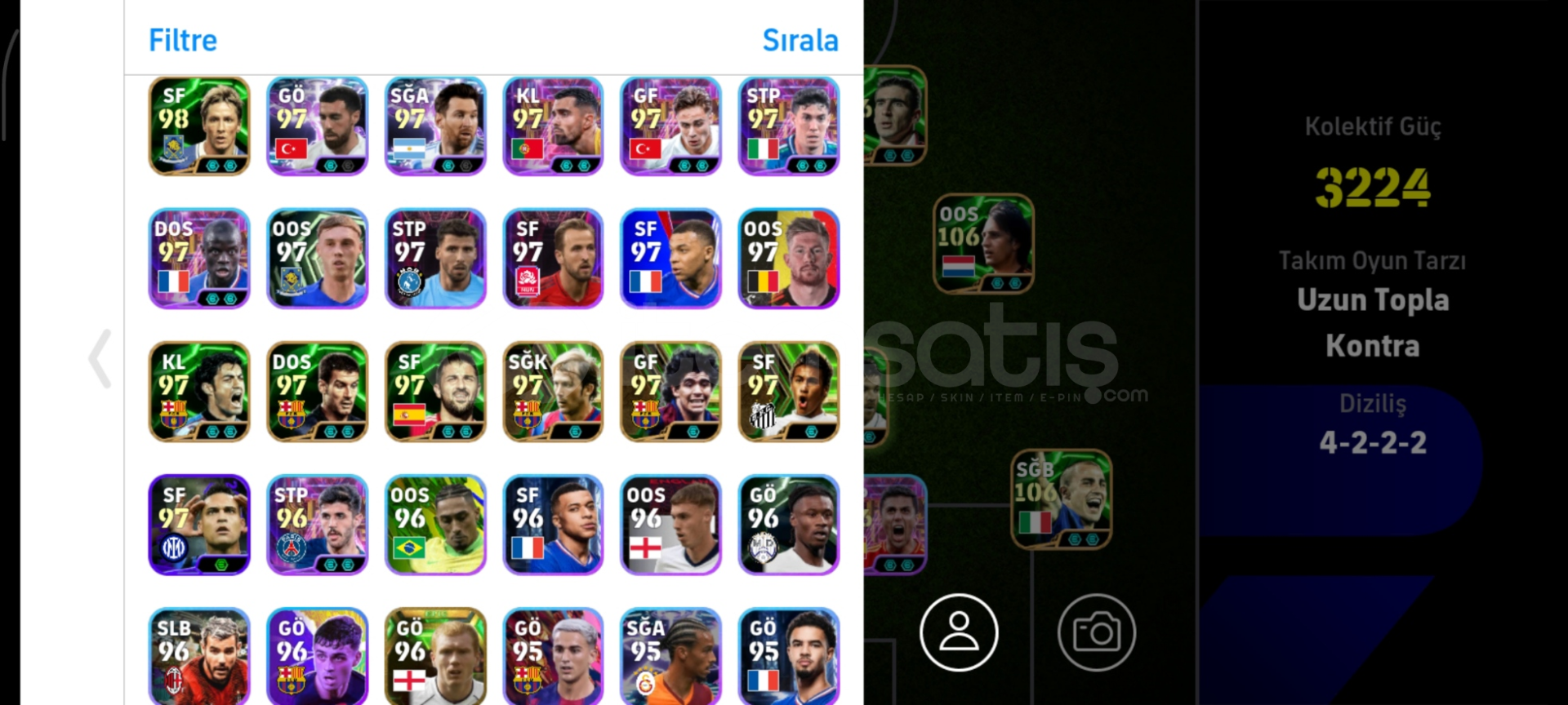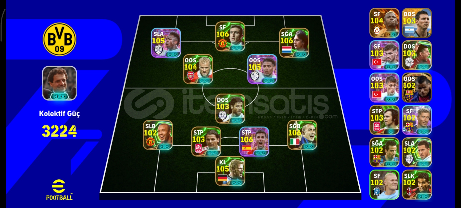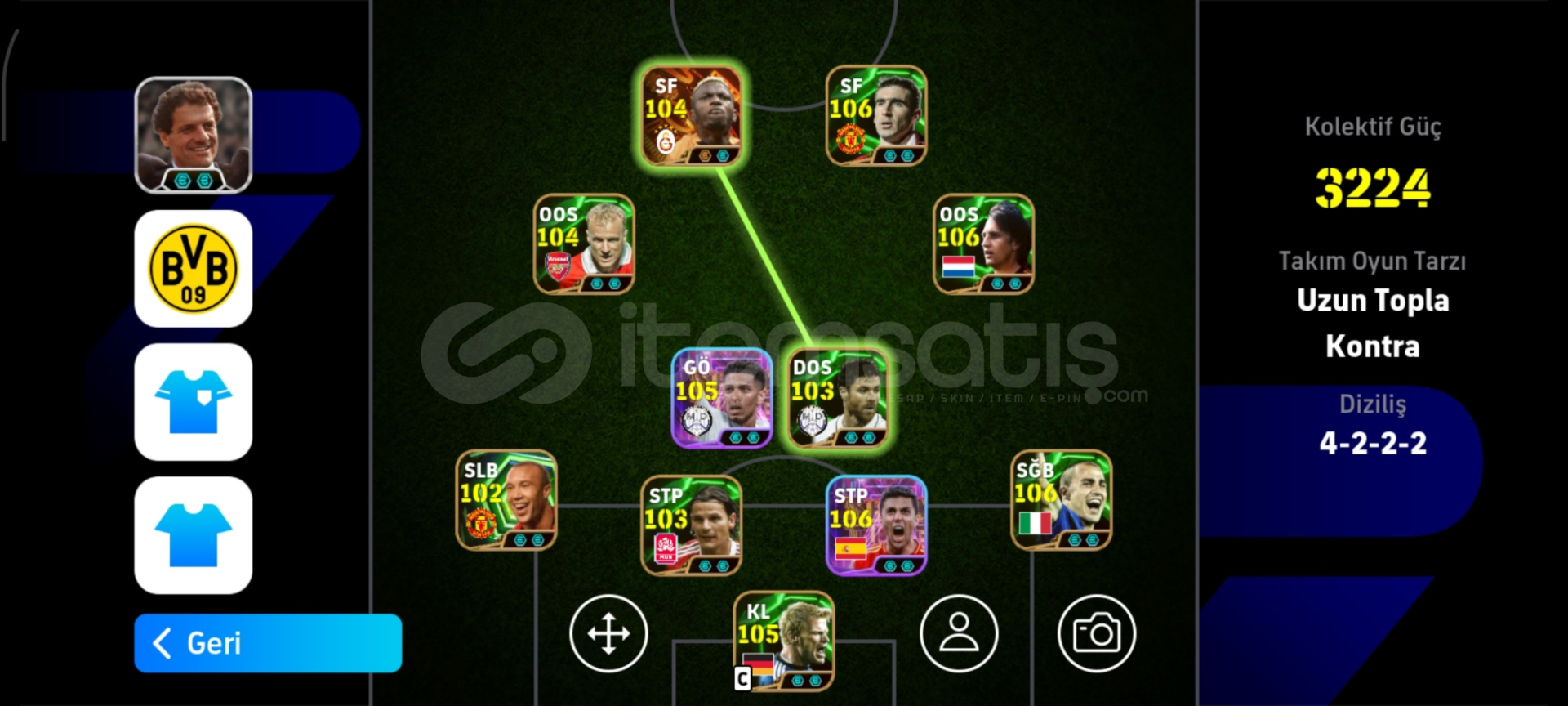 HESAP HAKKINDA:3225Kg Tek bağ efsane hesap! 103 bedava showtimes henüz alınmadı onunla beraber kg 3227+ olur!Bombacı 104 bergkamp! Eski nadir kart 2014 dünya kupası 103 Messi!Uzun top becerili yeni oyunun meta menejeri Capello mevcut!Bol bol Epic, Showtimes, özel menajarler ve nadir oyuncular mevcut!Güzel fiyata efsane hesap çok durmaz kaçırma! ────────────^...