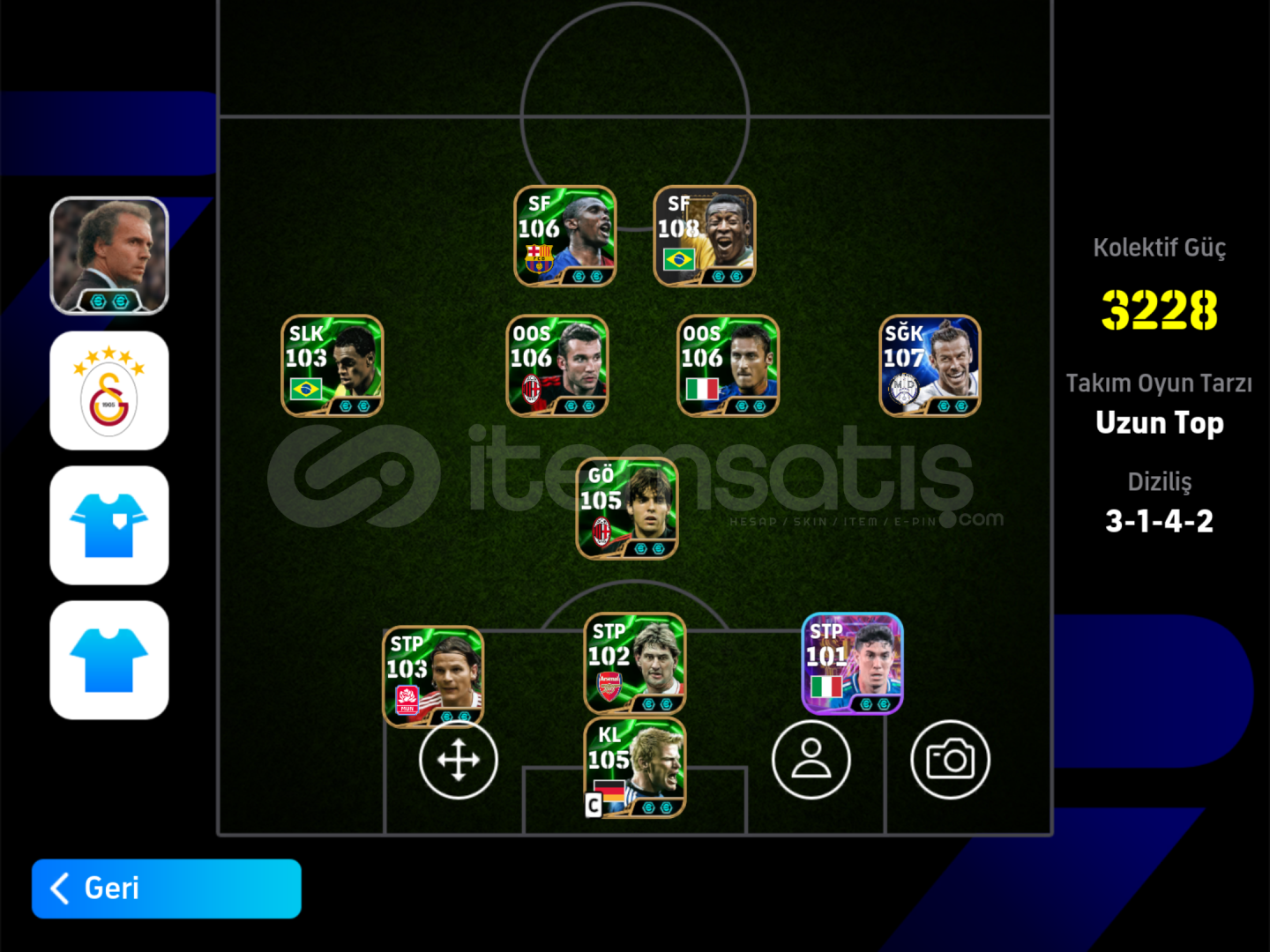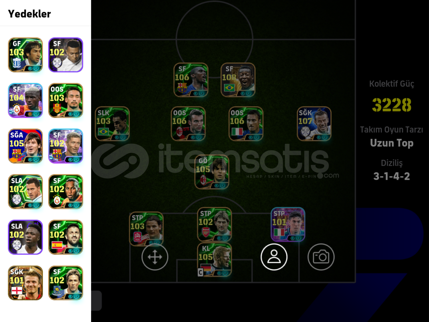 HESAP GÖRÜNDÜĞÜ GİBİ ÖLÜMCÜL FORVET HATTINA SAHİP,KLASMAN MAÇLARINDA İLK YARIDA FİŞİ ÇEKERSİNİZ.107 BALE🌟106 ETO🌟106 KAKA🌟108 PELE🌟106 SHEVCHENKO🌟106 TOTTİ🌟103 DENİLSON🌟