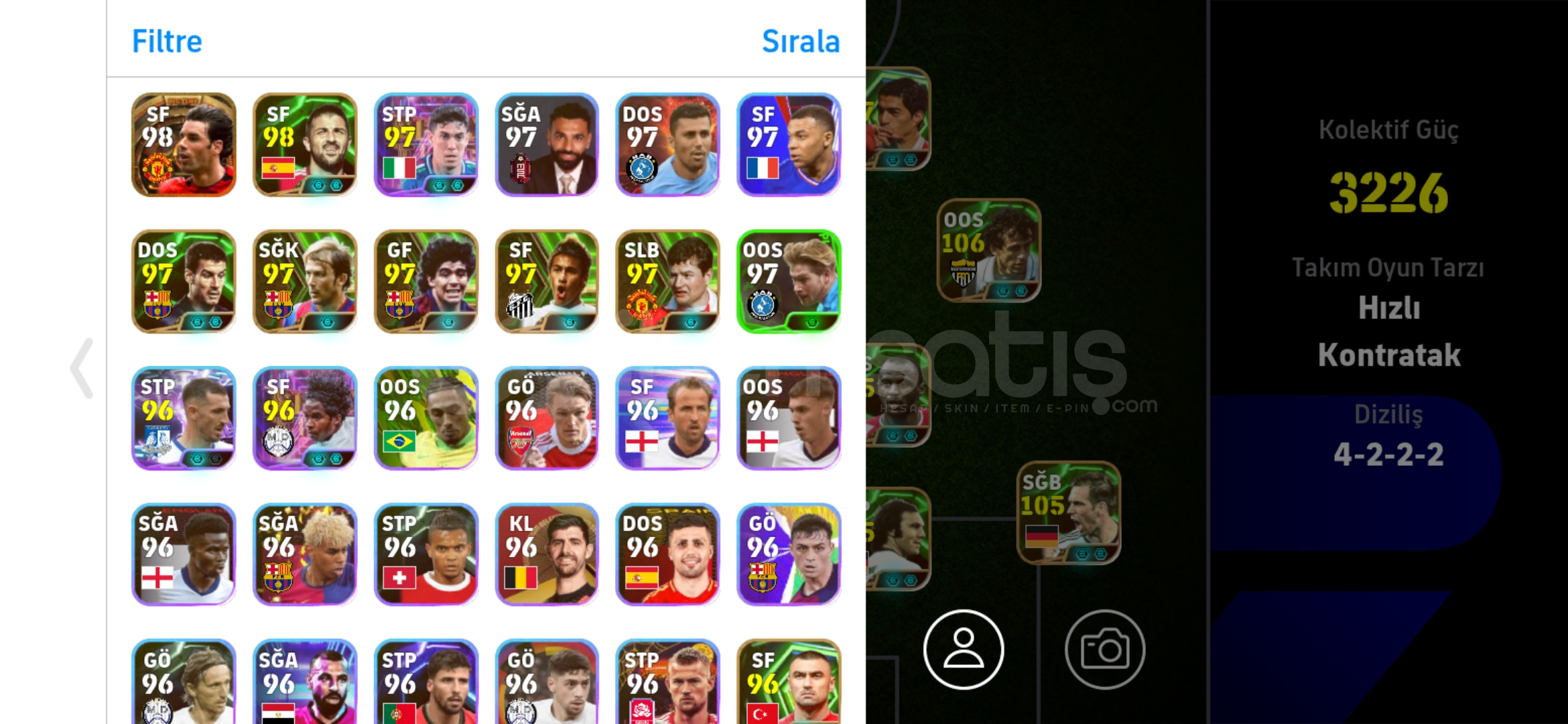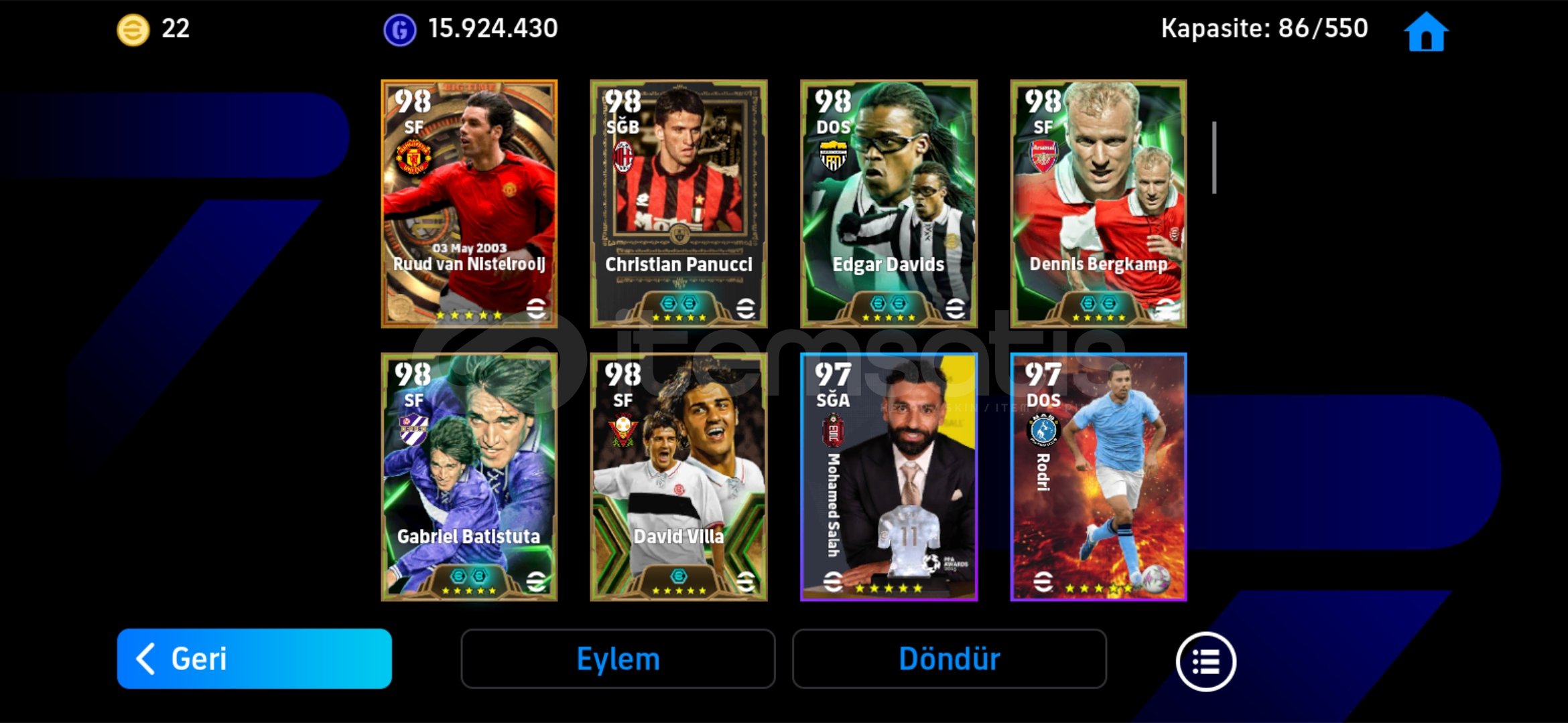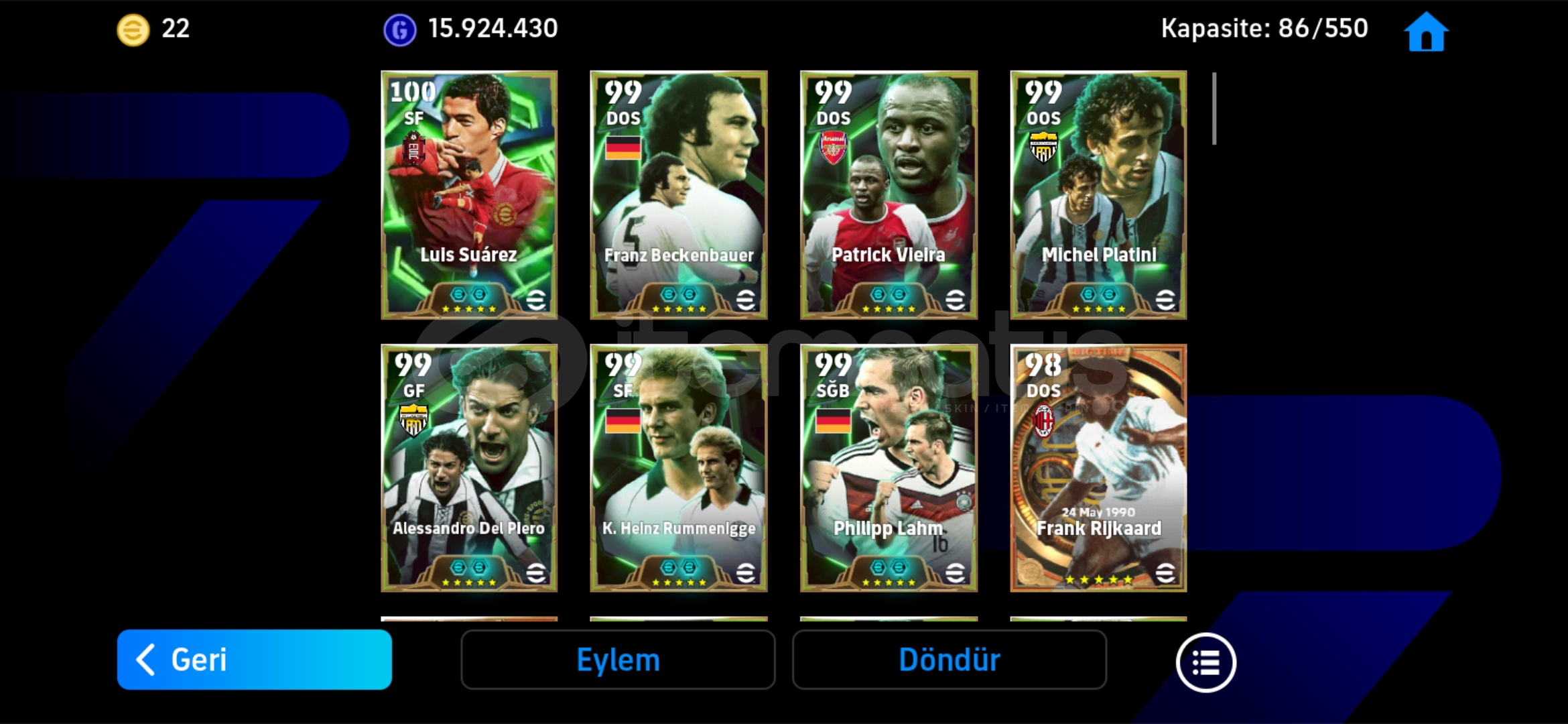Hesap tek bağdır-mc yoktur Hesaptaki Bazı Değerli Kartlar:108 Suarez106 Platini 105 Del Piero (Bombacı)105 Rummenige 105 Bergkamp (Bombacı)105 Lahm 105 Panucci 105 Vieira 105 Batistuta 104 David Villa 104 Edgar Davids 103 David Villa 103 Ruud van Nistelrooy 102 Rijkaard (Bigtime)102 Ruud van Nistelrooy (Bigtime)102 Rooney 102 Bale (Bombacı)102 Makelele 102 Lewandovski 102 Tony Adams 102 Messi 102 Pep Guardiola 102 Hazard 102 Endrick 102 Silvestre 102 Salah 101 ...