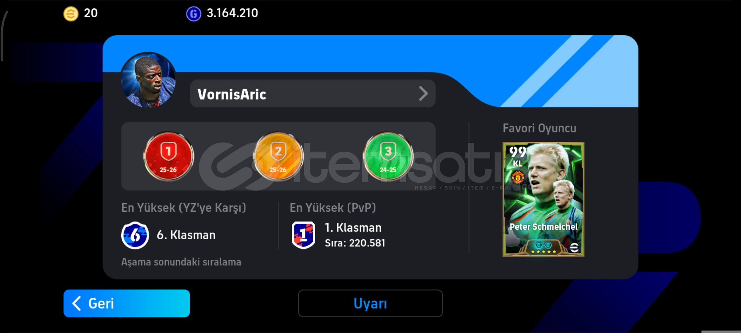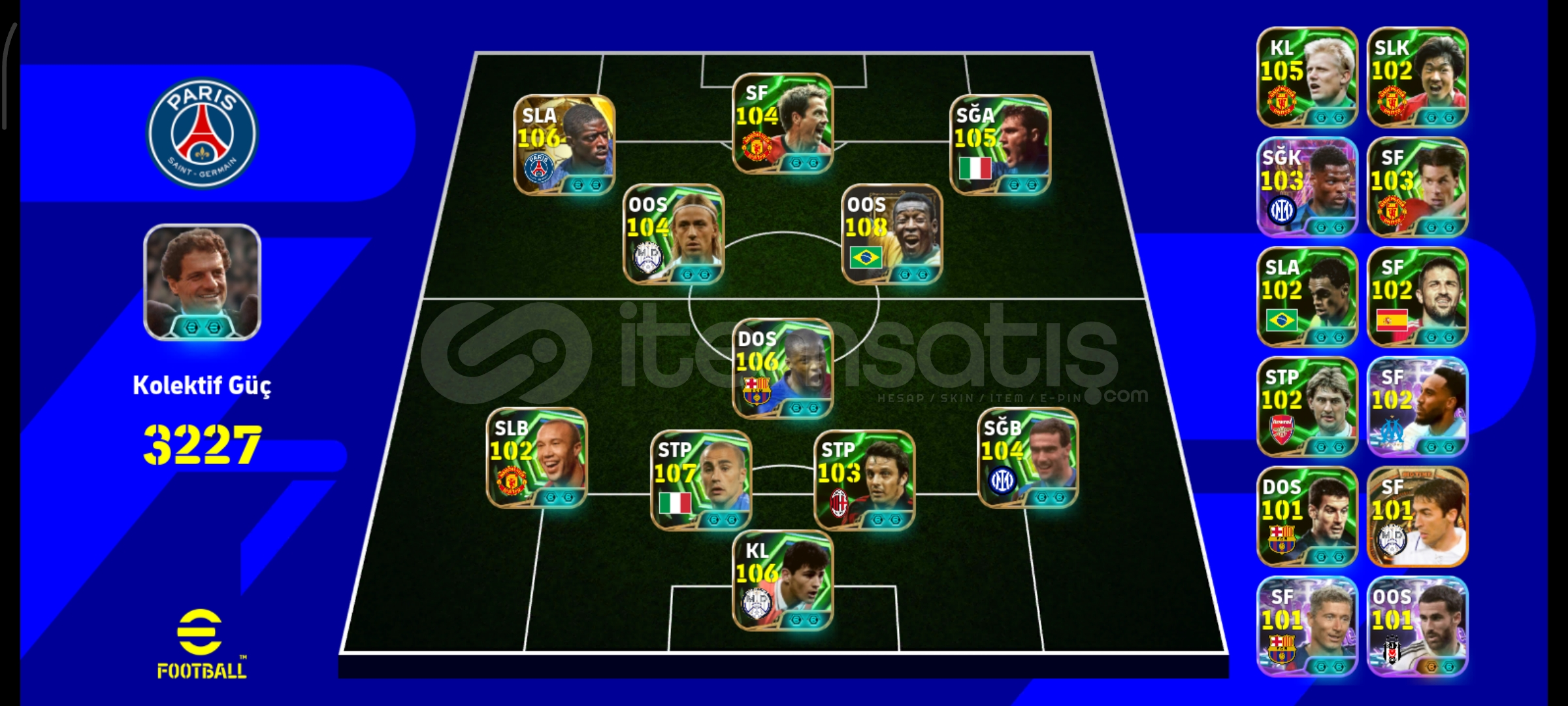 Hesapta:108 pele107 cannavaro106 dembele106 Casillas106 yaya toure105 (bombacı) Vieri105 Schmeichel104 owen104 bergomi103 Dumfries103 oddoVe daha fazlası bulunur1.klasman hesabı aktif olarak 2. KlasmandırHesap tek bağdırAndroid ve iosta -mc yokturAlana hayırlı olsun