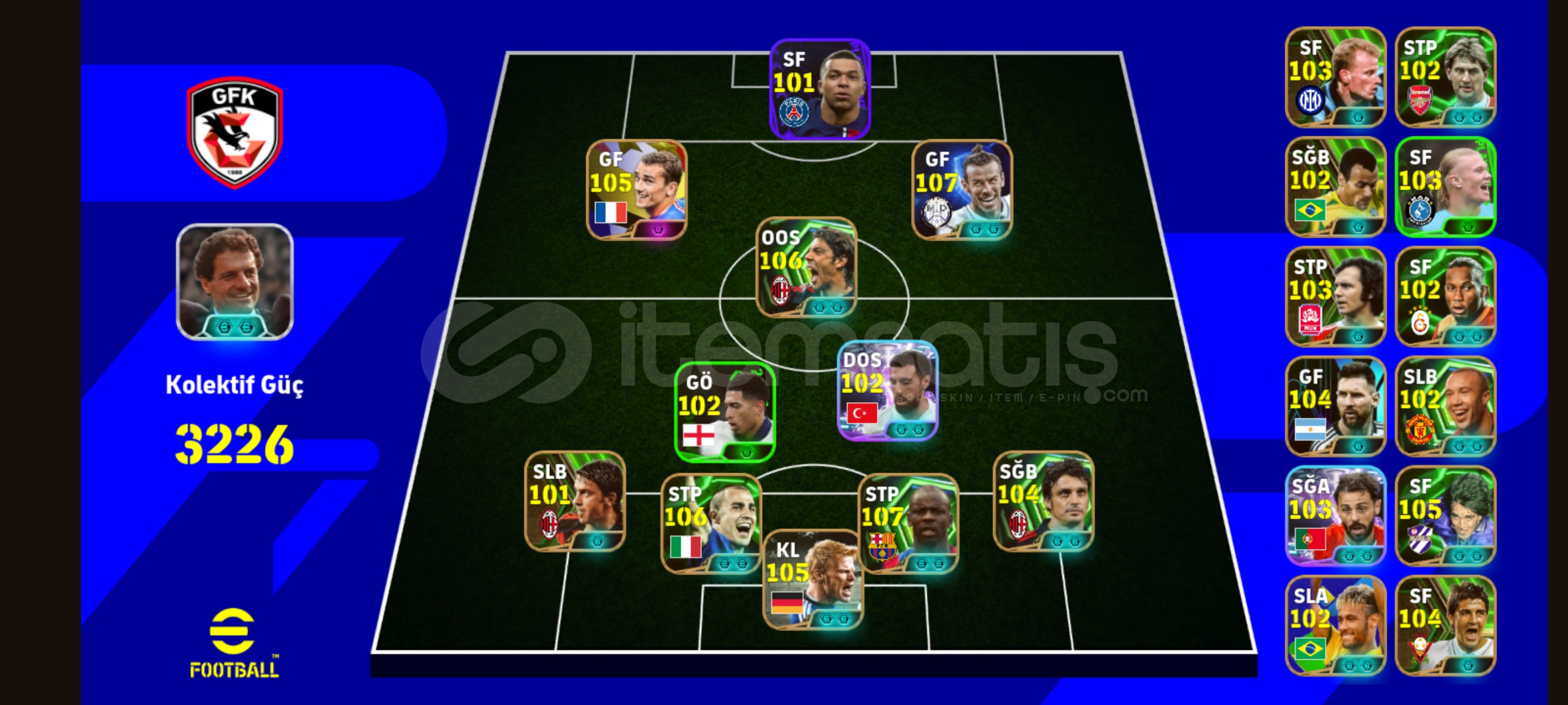 Yeni 106 Rui Costa 107 Uçak Bale 107 Thuram 106 Cannavaro 105 Oliver Kahn, Yükseltilebilir Menejerler Tek bağ ( iOS, Android) olanlar alabilir Aktif olmasam bile alabilirsiniz aktif olunup teslim edilir. pazarlık cüzi miktarda olur fiyat öldürecekler yazmasın! REZERVİ BOL KLASMAN 2 HESABI