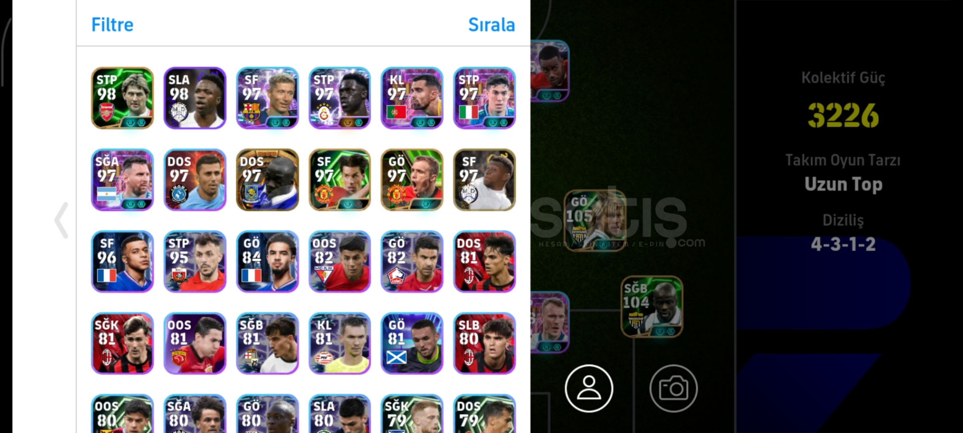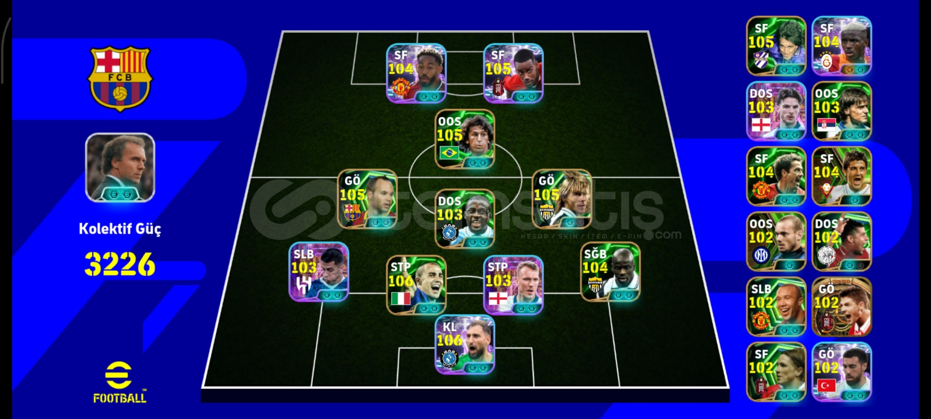 HESAP HAKKINDA:Hesapta 400 Mc mevcuttur! 3230 kg Tek bağ çift bombacılı en yüksek kartlarla dolu efsane hesap!Yeni gelen 106 iniesta ve nedvet! Bombacı 105 zico ve 105 cunha!Güçlendiriciler ayarlandıktan sonra 3230+ kg olur! Bol bol Epic, Showtimes, özel menajarler ve oyunun en güçlü hücumcuları mevcut!Güzel fiyata efsane hesap çok durmaz kaçırma! ──────&#...