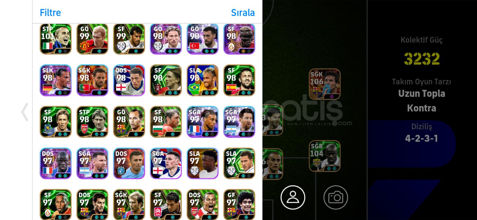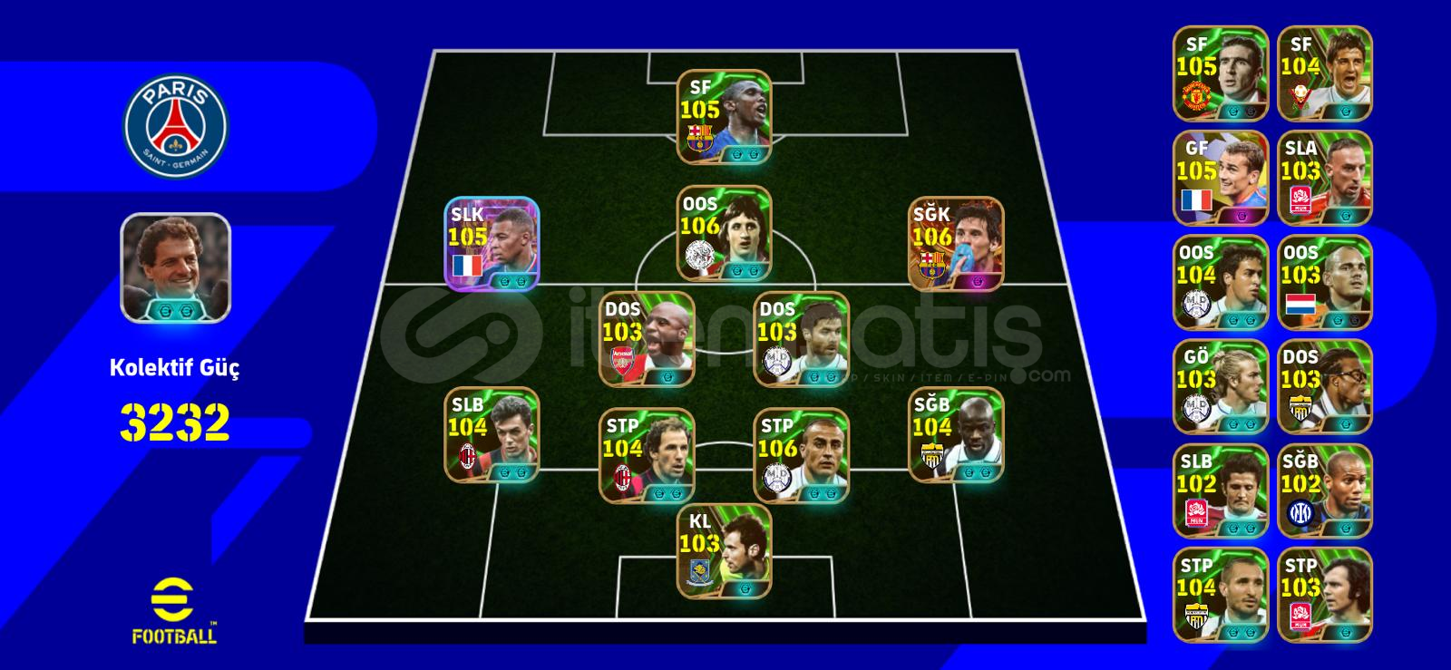 106 CRUYF, MESSİ, CANNAVARO105 CANTONA, BOMBACI MBAPPE, ETOO, GRİEZMANN104 THURAM, MALDİNİ, BARESİ, CHİELLİNİ, VİLLA, RAUL103 SNEİJDER, BECKHAM, XABİ, VİEİRA, DAVİDS, CECH, RİBERY, BECKENBAUER, MODRİC, SCHOLES, VAN NİSTELROYVE DAHA NİCELERİ BU HESAPTAHESAP TEK BAĞ KONAMİ ID YE BAĞLIDIR. PAZARLIK YAPILIR.