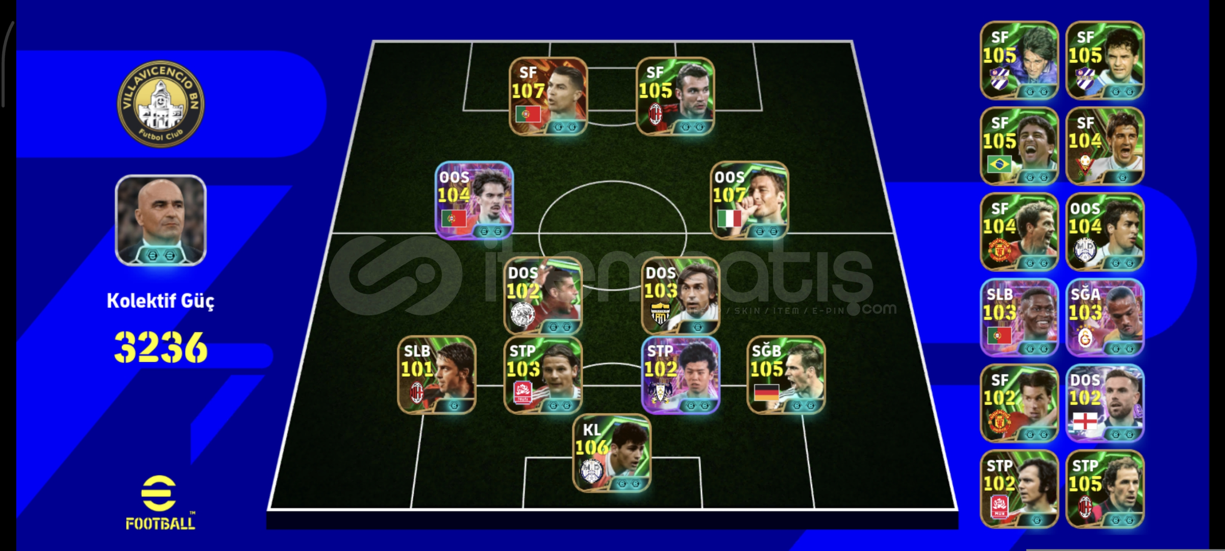 Hesap Max 3236 KG'dir, hesapta 4 adet bombacı(Leroy Sane, Rafa Silva, Gareth Bale, Burak Yılmaz)bulunmaktadır. Rezervlerde bolca özel kart bulunmaktadır. Hesap tek bağ ve tamamen sorunsuzdur. Hesapta 107 ronaldo ve 105 shevchenko gibi oyunun en meta forvetleri bulunmaktadır. GP ve antrenman puanları bolca bulunmaktadır, her oyuncunun ek becerileri basılmıştır. İlanı aldığınız gibi hesap her şeyiyle beraber devredilecektir, mail ve şifre değiştirme işlemleri yapılacaktır.