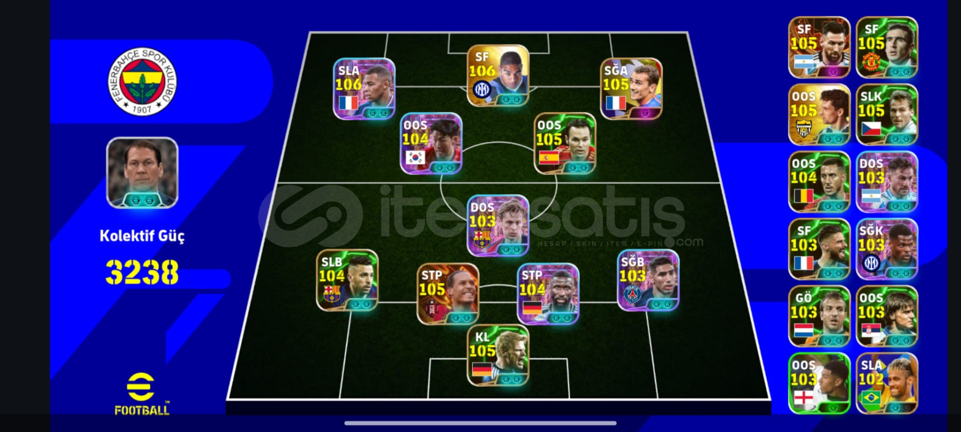 3238 KG Çift Bombacılı Tek Bağ HesapBazı OyuncularBombacı SonBombacı Kylian MbappeGrizmanRüdigerAndres iniestaAdrianoBaggioVan DJKHakımıJordi AlbaOliver KahnDumfriesMessiMac AlisterEden HazardOliver GiroudEric CantonaVan der vartPaul NedvedStikovicNeymarGüzel Teknik Direktör lü Tek Bağ Konami Pazarlık payı vardır