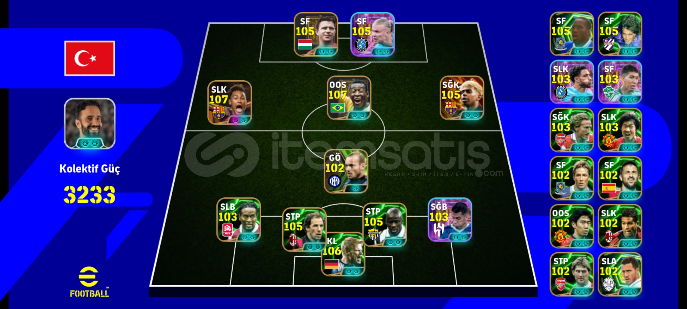 Merhaba hesap tek bağdır 3240 oluyor çift bombacı var çok değerli oyuncular var107 neymar108 pele106 puska106 Drogba105 thuram106 yamalVe bir çok değerli oyuncu alıcısına hayırlı olsun