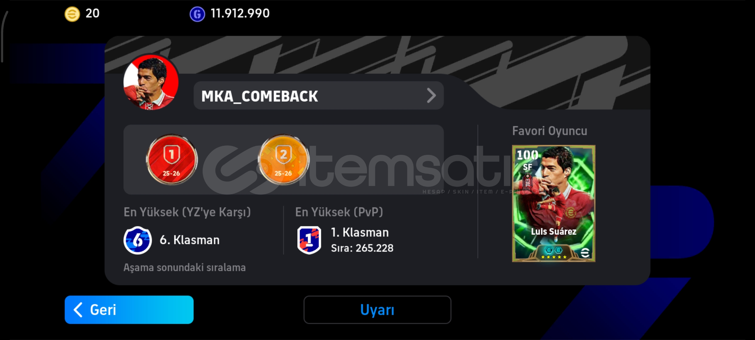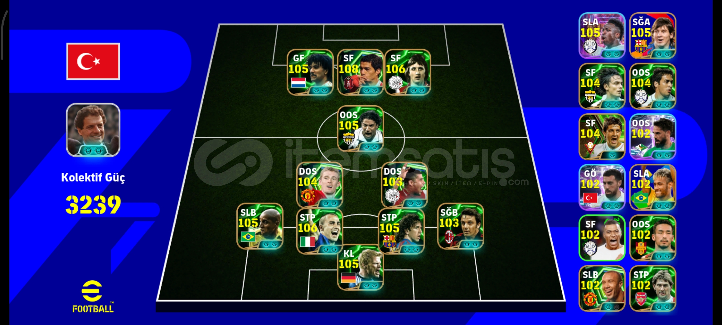 MAX KG 3240 HESAP SATIŞTA! 🔥💣 Oyunun en iyi bombacılarından: 105 DEL PIERO🏆 En ünlü e-sporcu kartı: 105 GULLIT⚡ Taze çıkmış Prime: 108 SUAREZ🎯 Oyunun en iyi ortacısı: 105 ROBERTO CARLOS🧱 Kurşun geçirmez defans hattı:105 PUYOL 🛡️ 106 CANNAVARO⚙️ Taze çıkmış orta saha: 104 FLETCHER🔥 En iyi forvetlerden: 106 CRUYFFTEK ...