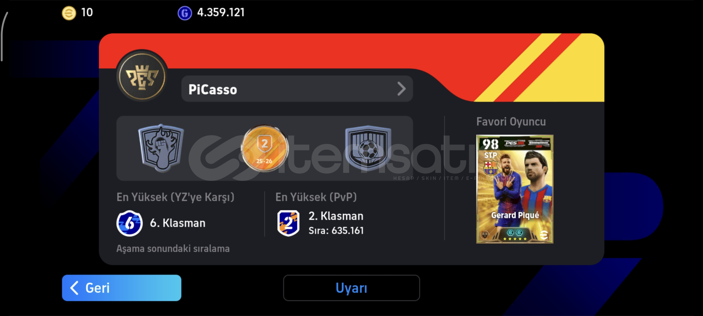 hesabım tek bağdır başka bağı yoktur sadece konami id bağlıdır alan kişiye bilgileri üzerine alarak teslim edeceğim hesapta -mc bulunmamaktadır android ios tek bağdır hesap ilk 11 ve yedek olmak üzere rezerve yani mc yatırarak çıkardığım oyunculardır başka sorusu olan varsa dm den yardımcı olurum veyahut instgram: yusuwf6 adresinden bana ulaşabilirsiniz numaram 05444326715 sadece ilan hakkında bilgi almak için arayabilirsiniz ilanı sadece itemsatış sitesi üzerinden satmaktayım veya Şanlıurfa içi teslim edebilrim