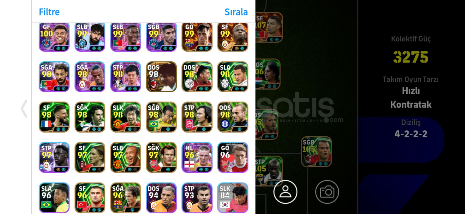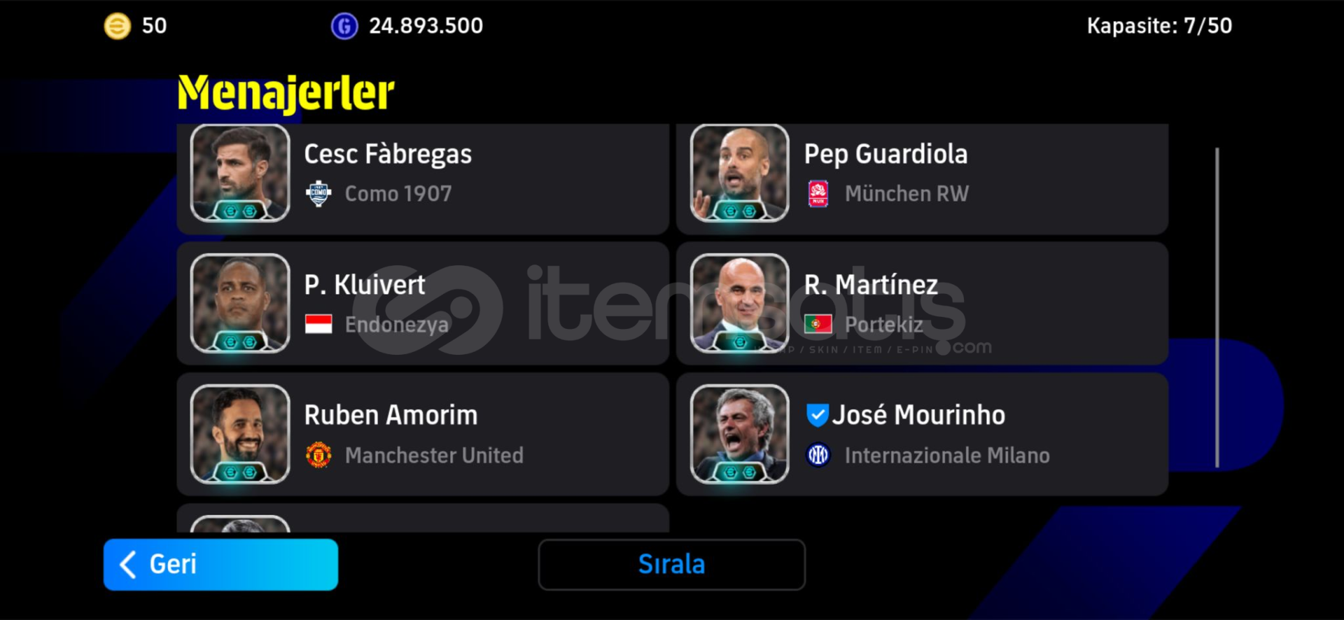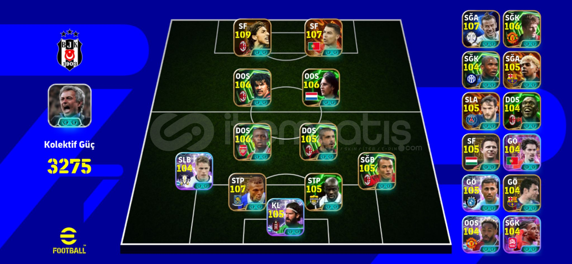 3275 KOLEKTİF GÜÇ GÜÇLENDİRİCİLER İLE BİRLİKTE 3280 OLABİLİYOR.7 ADET GÜÇLENDİRİCİLİ MENAJER BULUNMAKTADIR.110 İBRA , 107 KAFACI RONALDO , 107 DESAİLY , 107 GULLİT , 107 BALE , 107 CRUYFF , 106 BECKHAM VE ÇOK ÇOK DAHA FAZLASI.)DOPDOLU SÜPER REZERV.TERTEMİZ TEK BAĞ HESAPTIR - MC KESİNLİKLE BULUNMAMAKTADIR GİRİŞ HAKKI FULLDÜR...