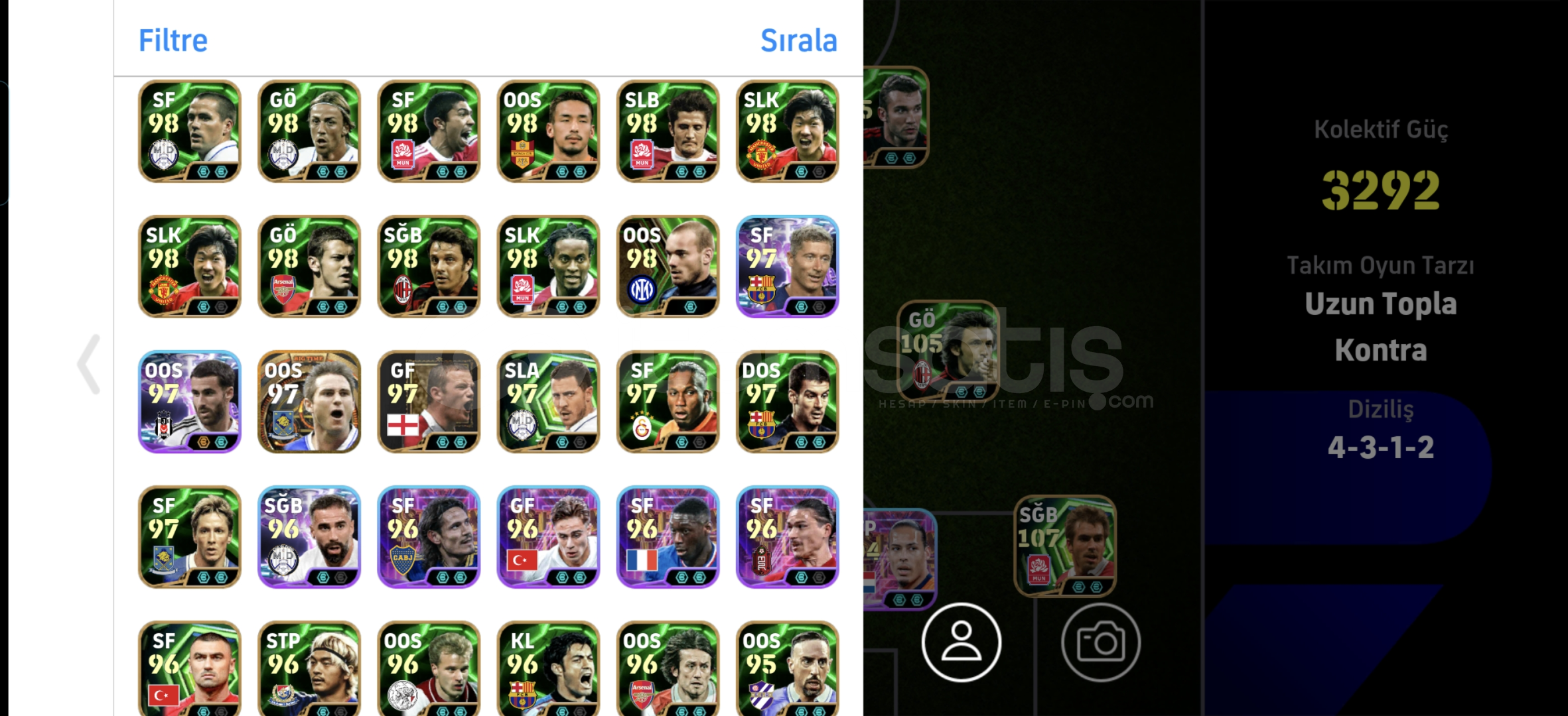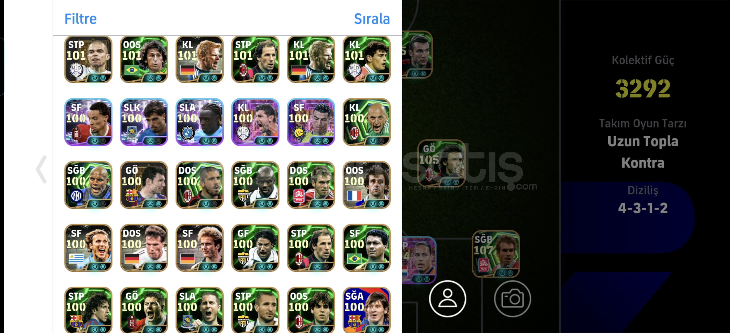 100 den fazla epic ve icon oyuncular vardır. Hesapta çift bağ gözüküyor ama google play games bağı düşürülmüş, ölü bağdır. Yani tek bağ, Yeni 105 kafacı koller ve 106 backham de mevcuttur.