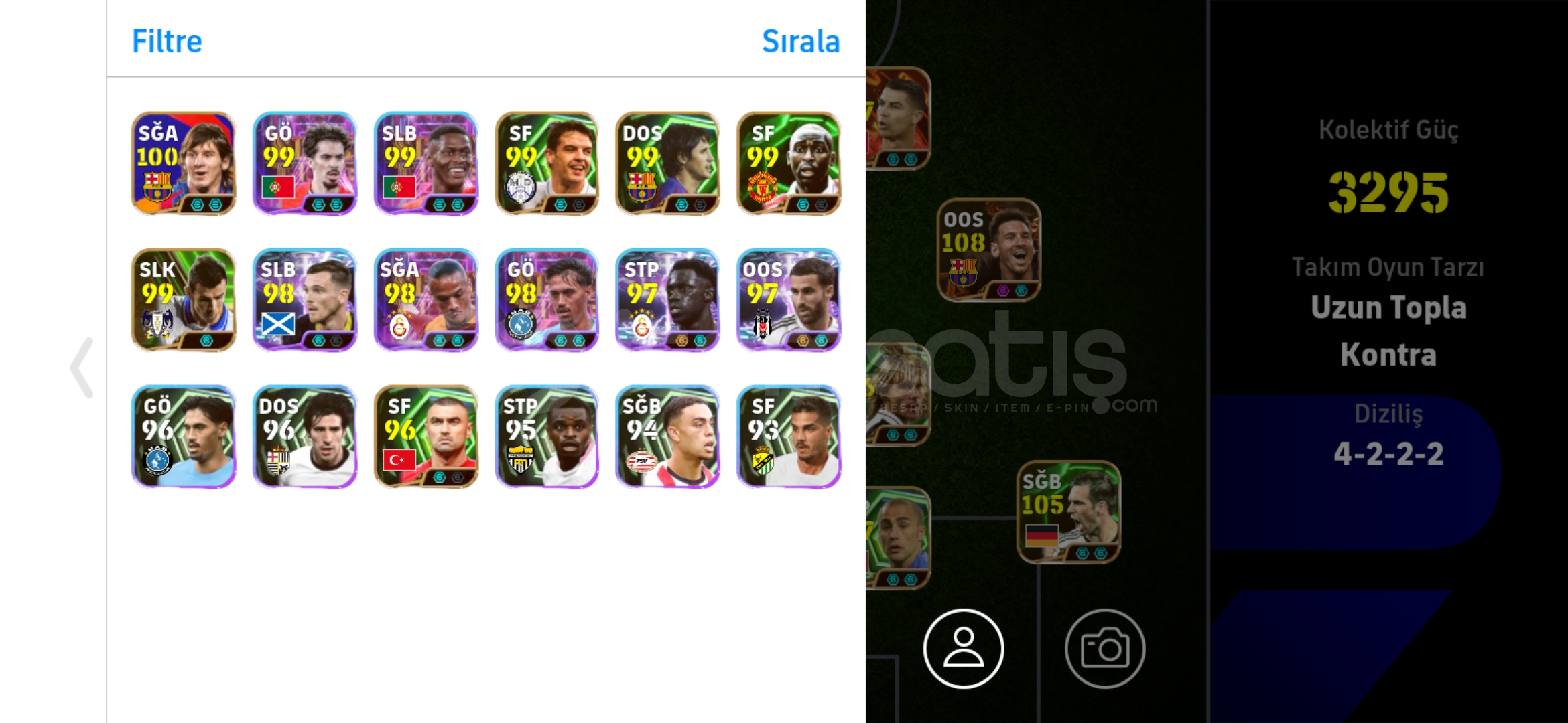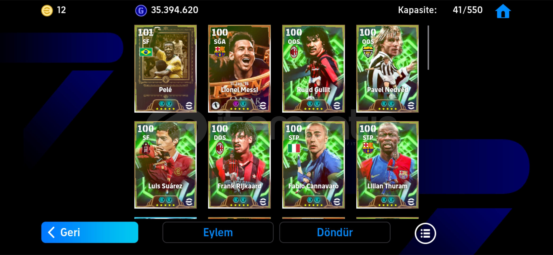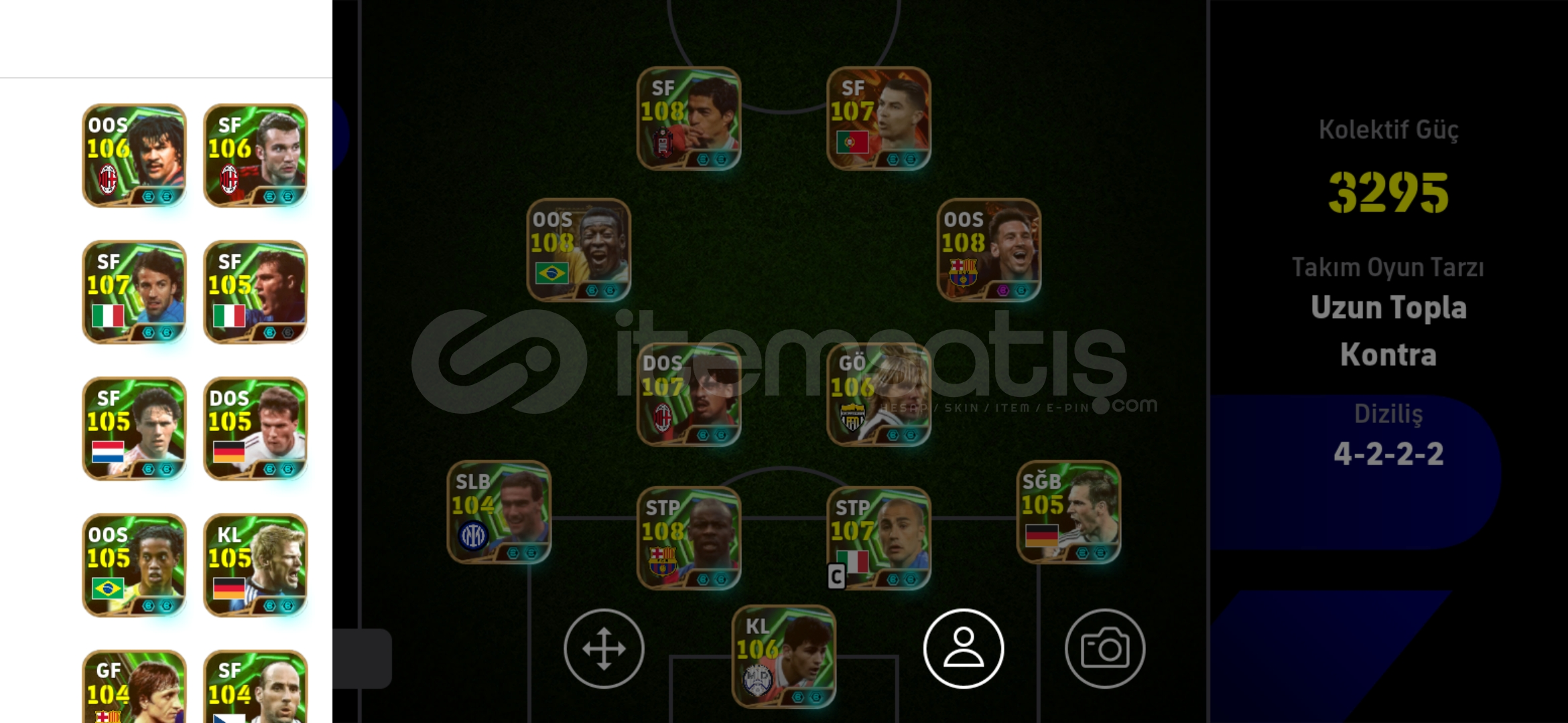 •Hesap tek bağdır•-mc yoktur•5 Bombacı Vardır•4 Ortacı Vardır•4 Kafacı Vardır•Tüm 108 lik Kartlar Vardır•Hesaptaki Bazı Değerli Kartlar:108 Messi (Bigtime) (Bombacı)108 Pele108 Suarez108 Thuram107 Ronaldo (Bigtime)107 Cannavaro107 Del Piero (Bombacı)107 Rijkaard107 Gullit 106 Nedved106 Casillas106 Shevchenko106 Vieri (Bombacı)106 Kahn105 Matthaus105 Van Basten105 Griezzman105 Messi105 Ro...
