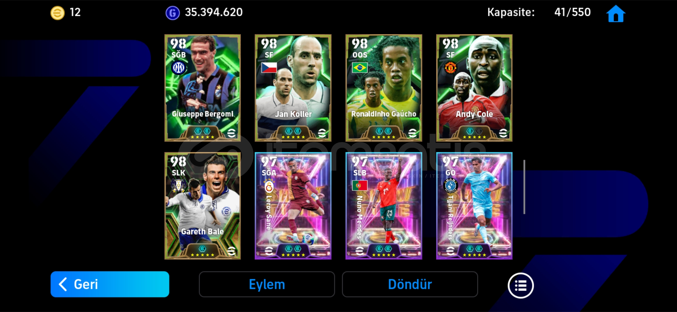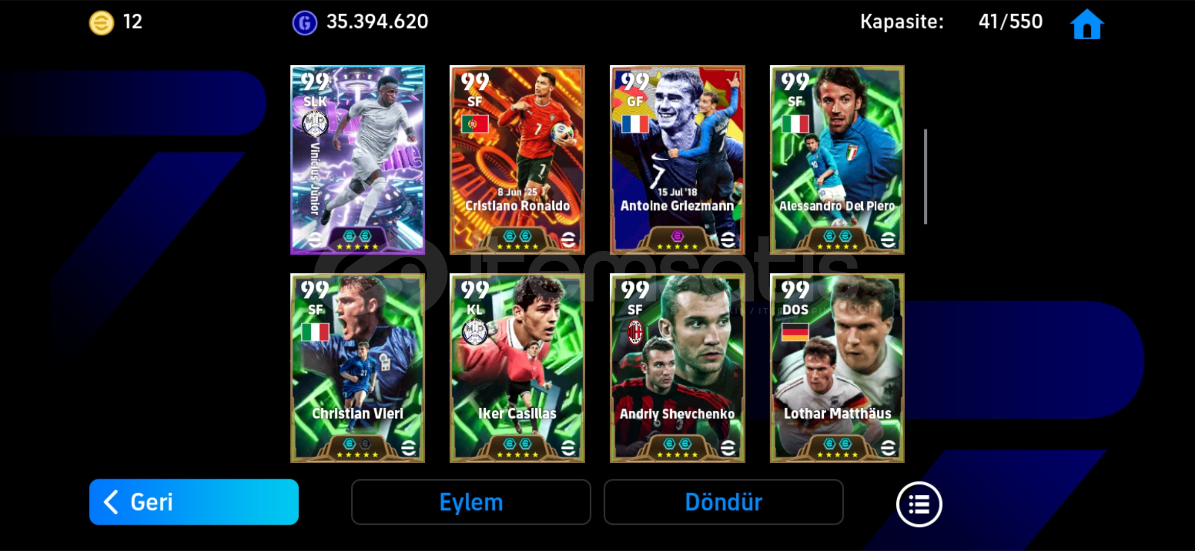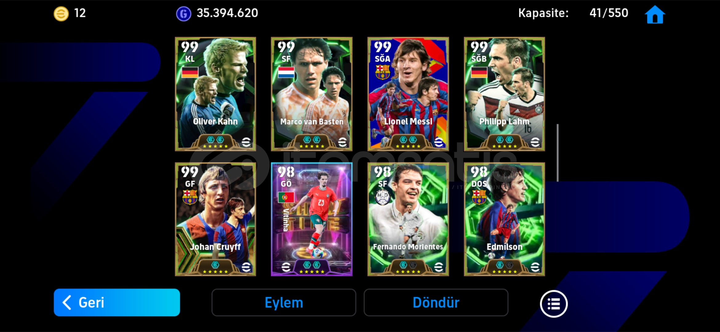 •Hesap tek bağdır•-mc yoktur•5 Bombacı Vardır•4 Ortacı Vardır•4 Kafacı Vardır•Tüm 108 lik Kartlar Vardır•Hesaptaki Bazı Değerli Kartlar:108 Messi (Bigtime) (Bombacı)108 Pele108 Suarez108 Thuram107 Ronaldo (Bigtime)107 Cannavaro107 Del Piero (Bombacı)107 Rijkaard107 Gullit 106 Nedved106 Casillas106 Shevchenko106 Vieri (Bombacı)106 Kahn105 Matthaus105 Van Basten105 Griezzman105 Messi105 Ro...