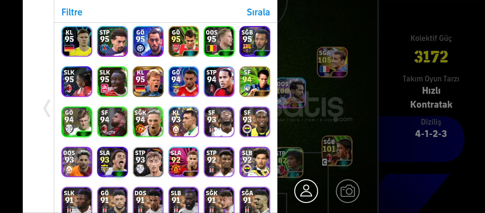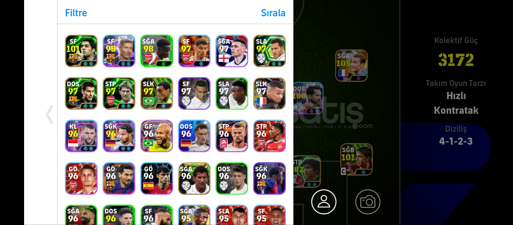 108 VE 105 SUAREZ105 GREİZMANN104 MESSİ101 RAFA SİLVA(Süper Lig KADROSU İLE 104)101 DAViNSON SANCHEZVE ESKİ NADİR KARTLARMAX KG 1777