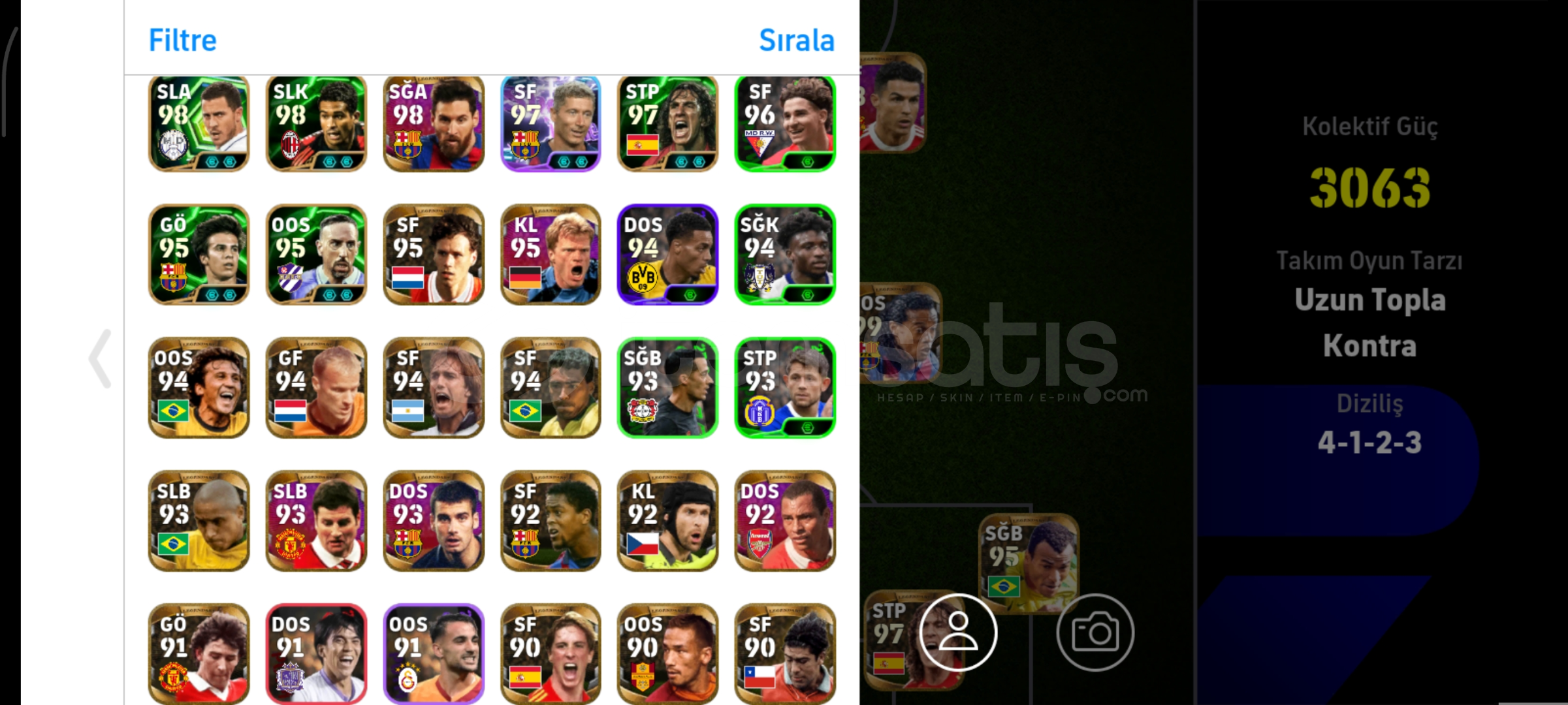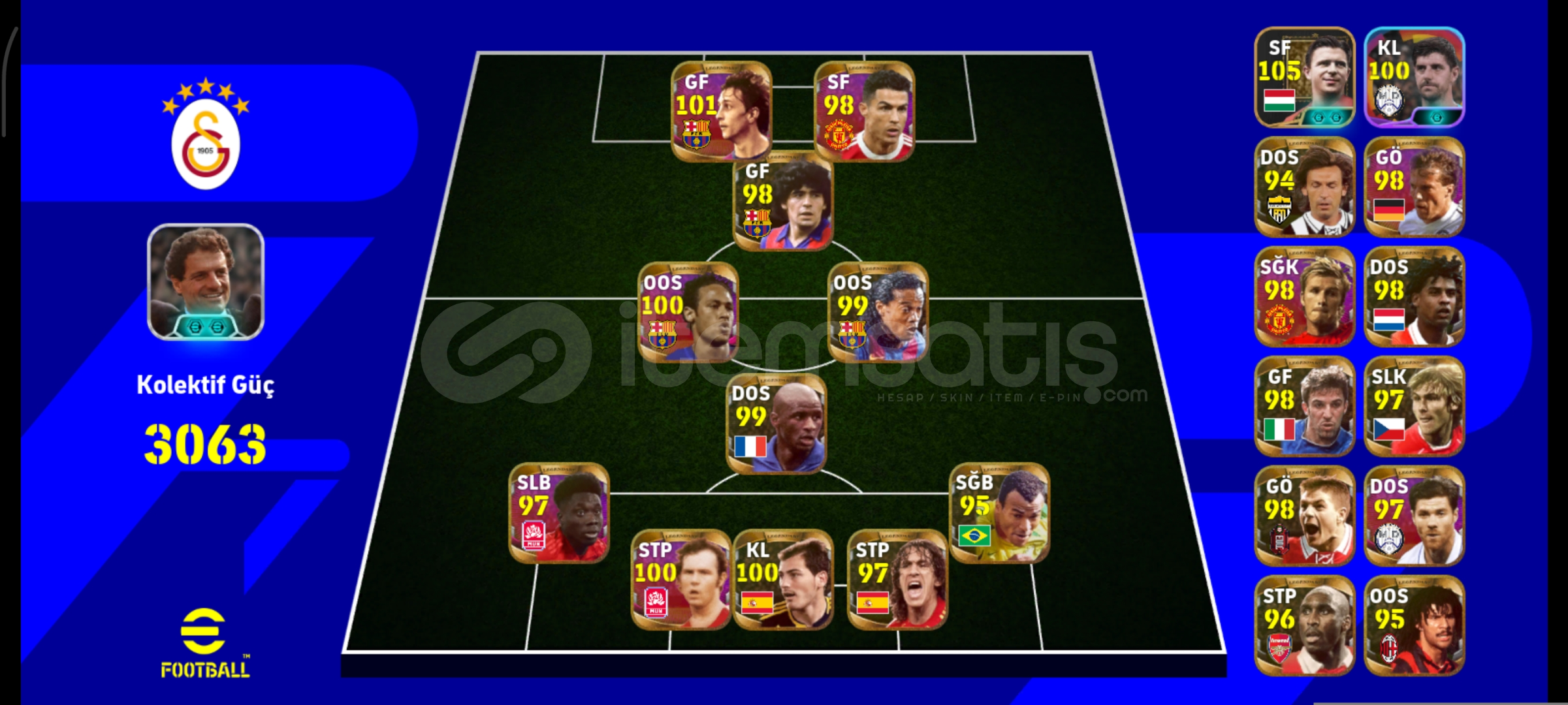 Hesapta birçok pes 21 döneminden kalma ikon/legend vardır. Kartlara uyguladığım özel basımlar ile hâlâ daha birçok kart üst seviye performans vermektedir. Bunun dışında yeni oyunculardan da 105 Puskas vardır. Meta hocalardan Capello da hesaba dahildir.