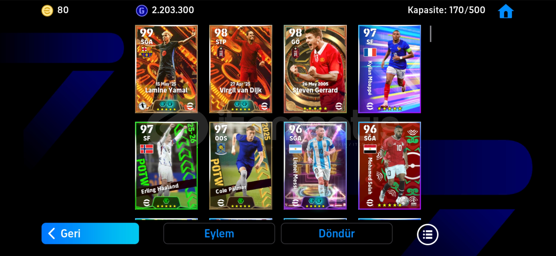 Hesap tek bağdır-mc yokturHesaptaki Bazı Değerli Kartlar:106 Yamal (Bombacı) (Bigtime)105 Van Dijk (Bigtime)105 Skriniar103 Ruud van Nistelrooy102 El Hadji-Diouf102 Messi102 Gerrard (Bigtime)102 Hazard102 Silvestre102 Haaland101 Palmer101 Raphinha101 Burak Yılmaz (Bombacı)101 Mbappe+2 Özel Güçlendiricili Menajer-Franz Beckenbauer-Jose Mourinho