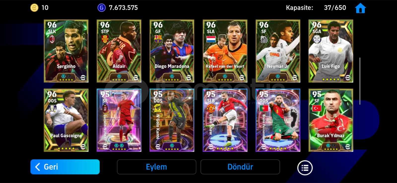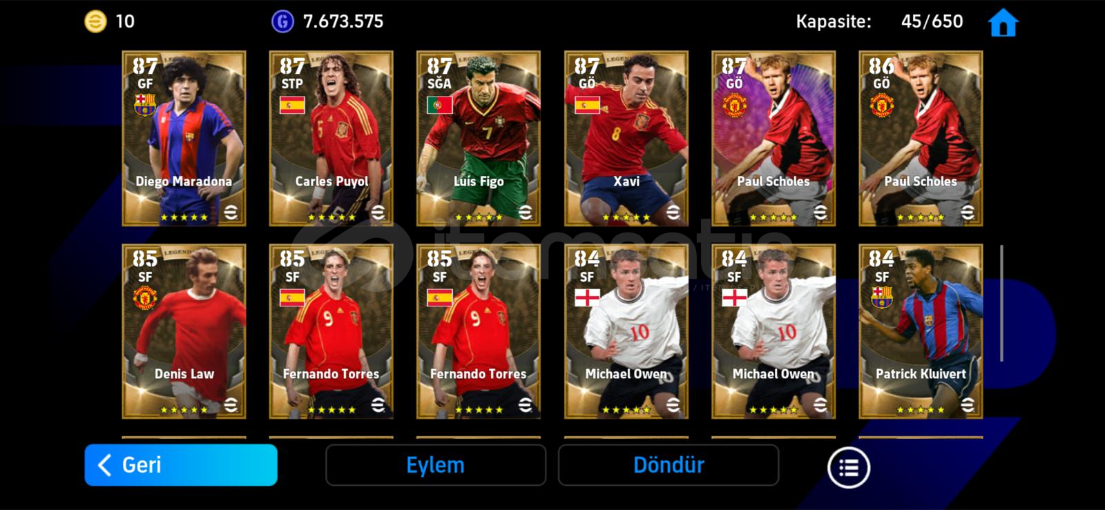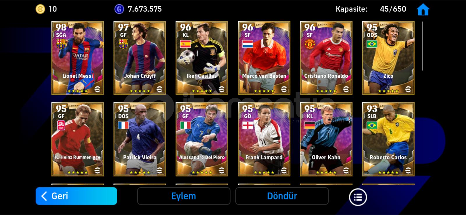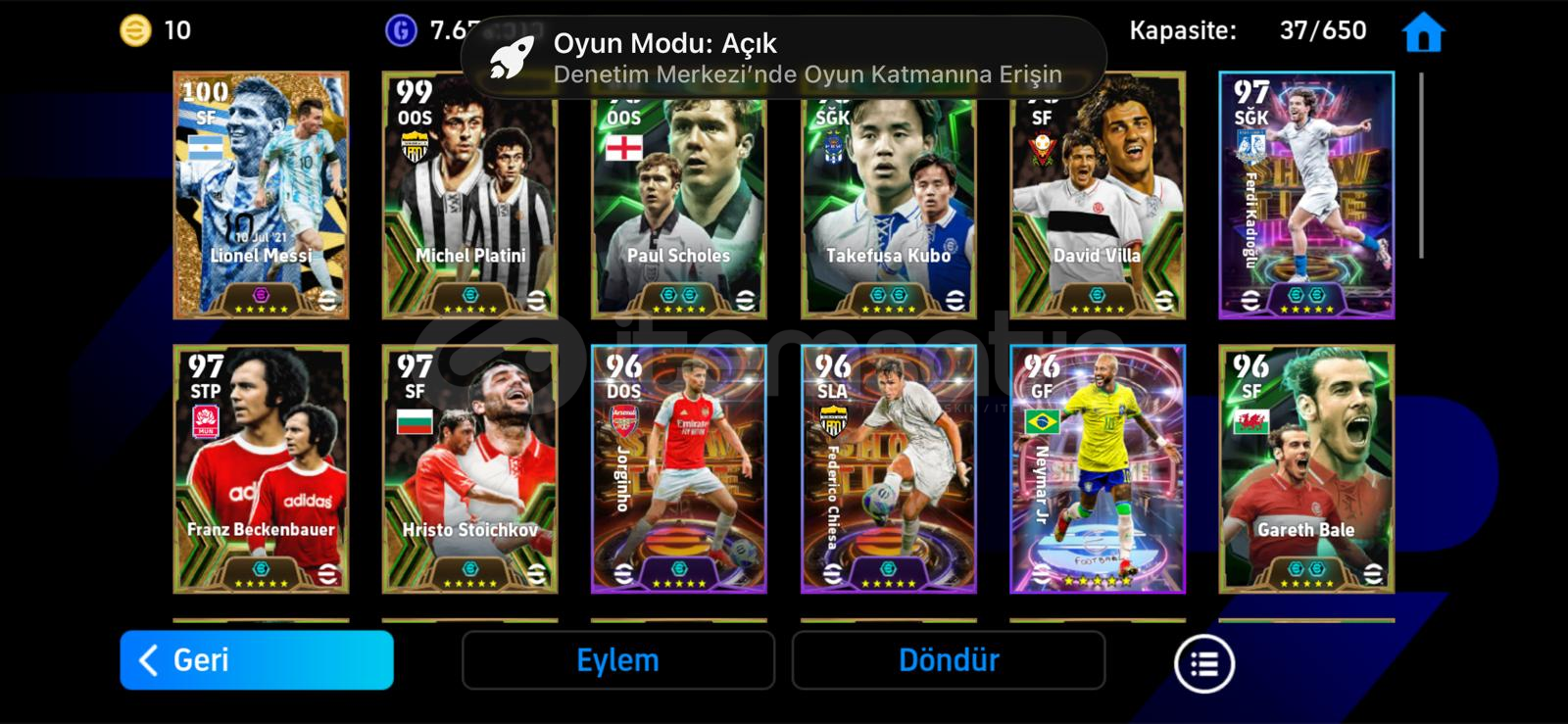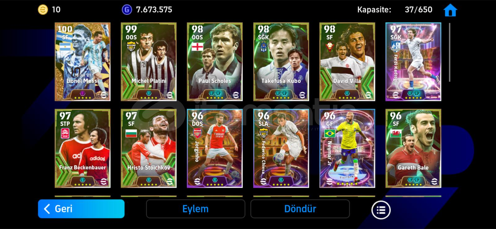 Hesapta pes21 den kalma birçok nadir efsane oyuncular ve 2021 106 messili arjantin paketi 3 bombacı (Chiesa Bale ve Burak Yılmaz)ve toplamda 650 oyuncu vardır