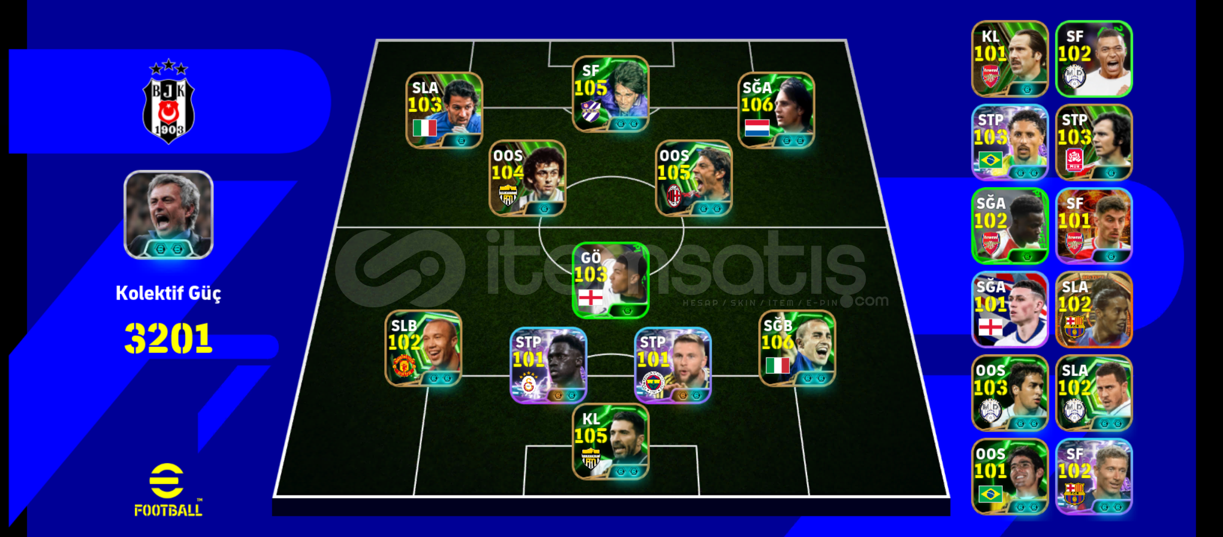 105 Buffon106 rui costa104 platini106 crufy103 del piero(bombacı)101 Davidson101 Skiniarİngiltere paketi alınmıştır.Morinho alınmıştır.Rezerv doludur.eski ve nasir potwlar bulunmaktadırHesap tek bağdır -mc yoktur.Alana hayırlı olsun.
