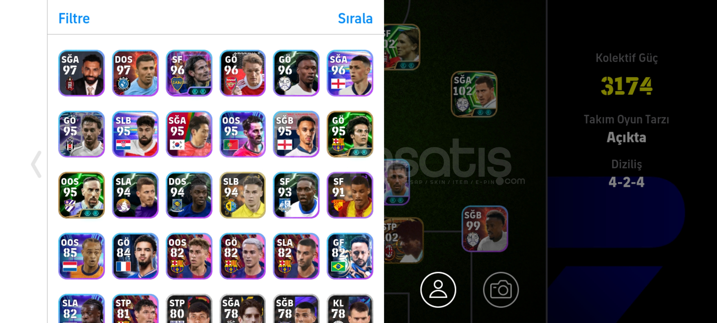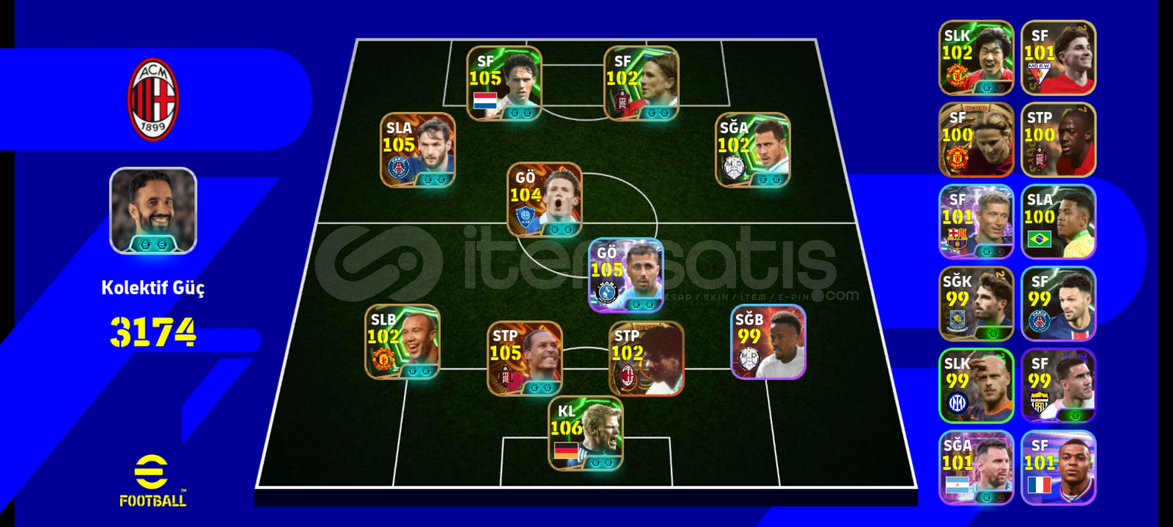 Hesap içindeki özel oyuncular105 kvara - bombacı105 van dijk105 rodri104 mc tominay106 kahn105 van basten102 torres100 forlanHesap tek bağ konami id sorunsuz işlem yapılır
