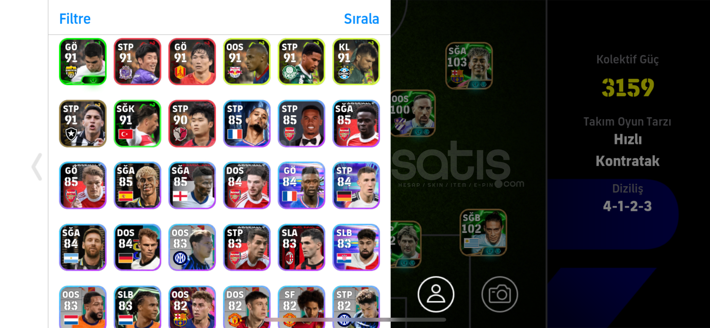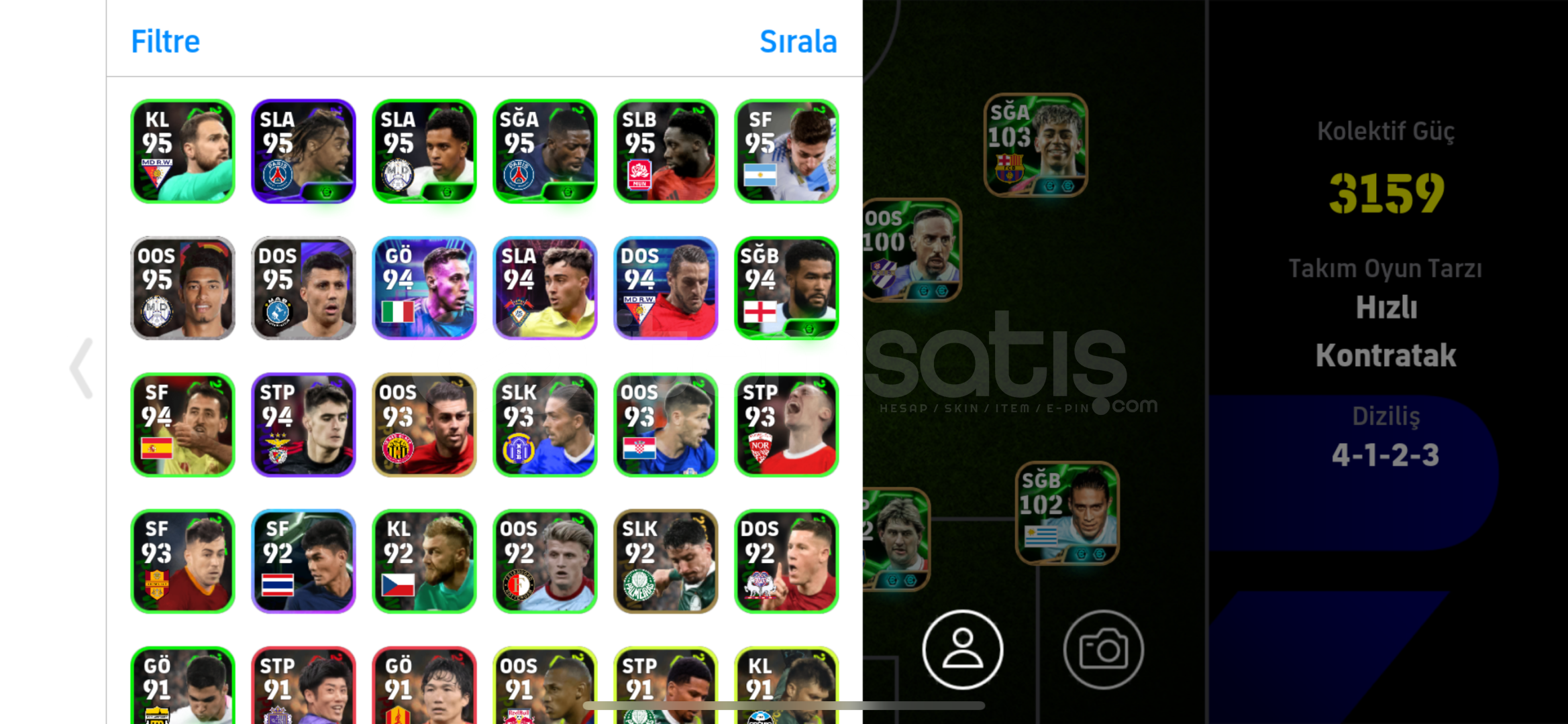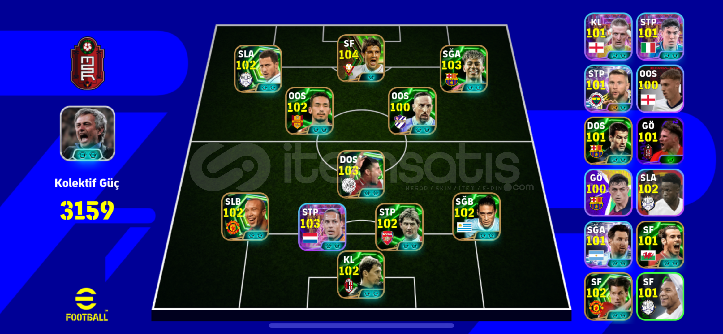 Başlangıç hesabıdır aldım diyene hayırlı olsunKadrodaki üst düzey oyuncular:CR7 (104),Rivaldo (104),Ronaldinho (103),Neymar (103),Ribery (100),Van Dijk (103),Maldini (102),Cafu (102),Kalede Dida (102).Yedekler: Messi, Bale, Bellingham, F. Torres, Saka, G. Jesus gibi yüksek ratingli yıldızlar (101-102 civarı).Kulübede ve kutuda 95+ ratingli çok fazla oyuncu bulunuyor (Messi, Kane, Ronaldo, Lewandowski, Son, Neuer,...