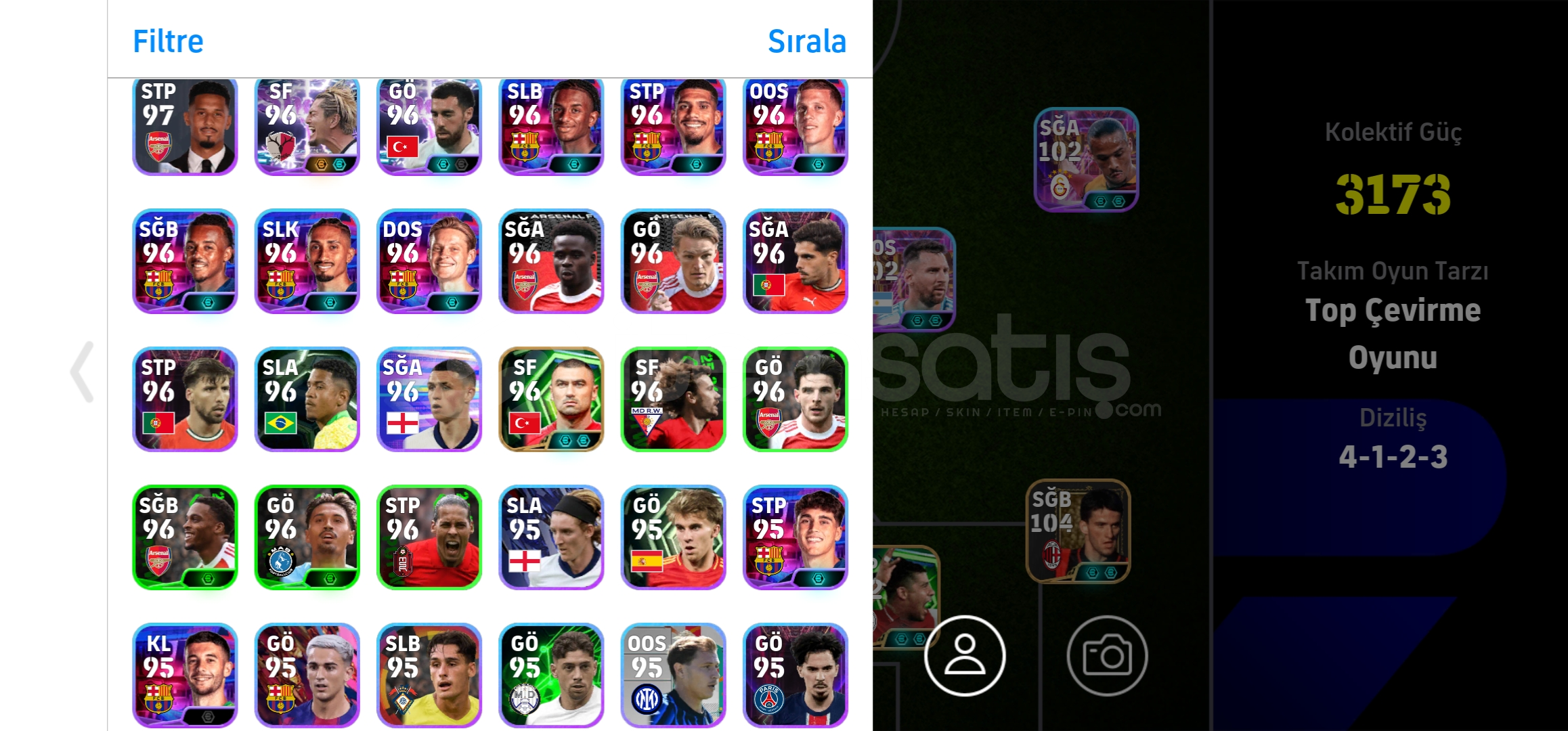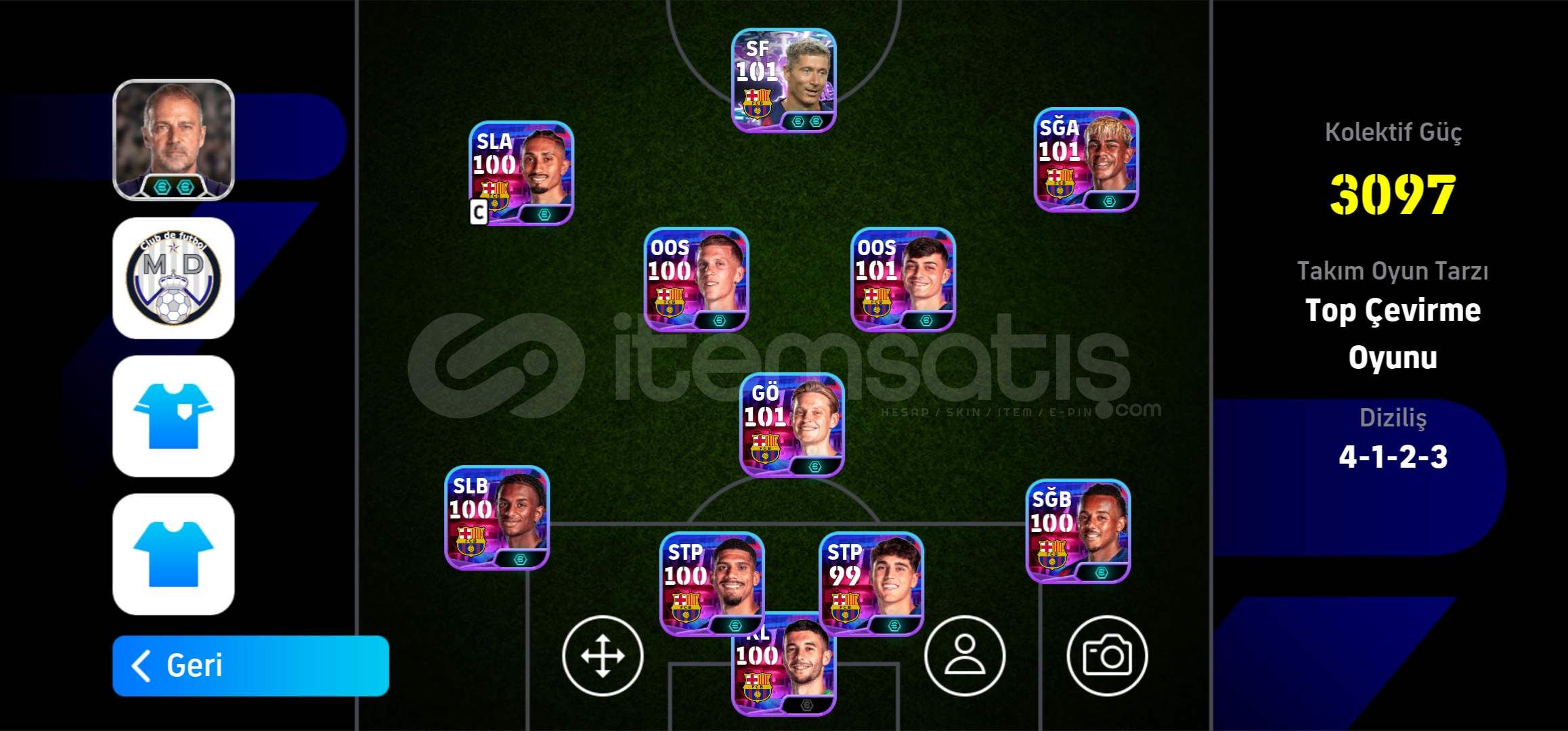 Herkeze hayirli satışlar arkadaşlar kadro fotoğrafta gördüğünüz gibi bazı guclendiremedigim oyuncular var barcelona paketi aldim ayriyeten 1500 myclup değerinde 2 adet bombacı var Sane nin vuruşları oyun ici gercekten mükemmeldir courtois 101 oluo ozel başım yaptim daha guclu oldu kolektif güc görüldüğü gibidir lutfen pazarlık icin zorlamayın site saten komisyon kesiyor birde paraya cok ihtiyacım var ondan satıyorum yoksa oyun ici guzel oyuncular var stadyum öğelerim var 5 menajer var 2 sini myclup harcayıp aldim flick harika hocalardan oyuncuları guzel yukseltio