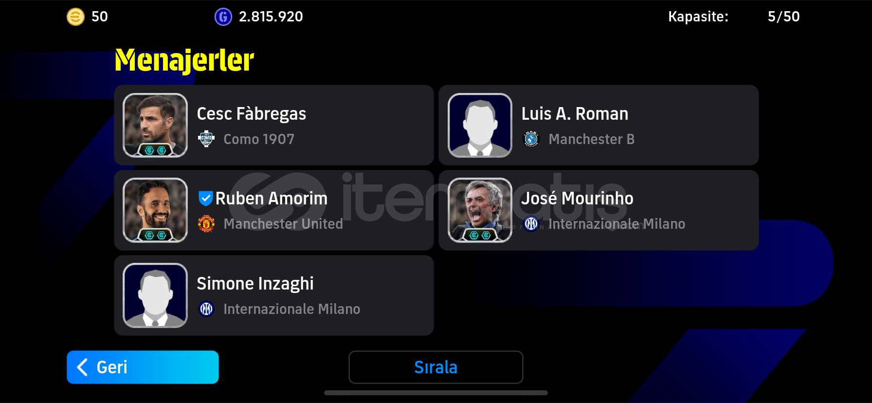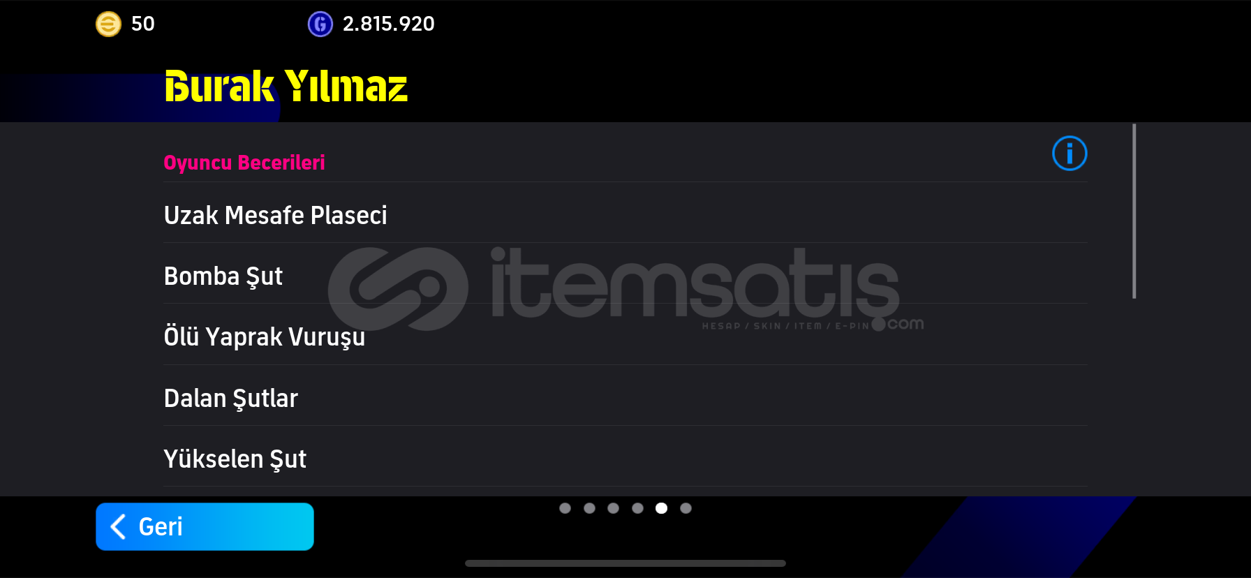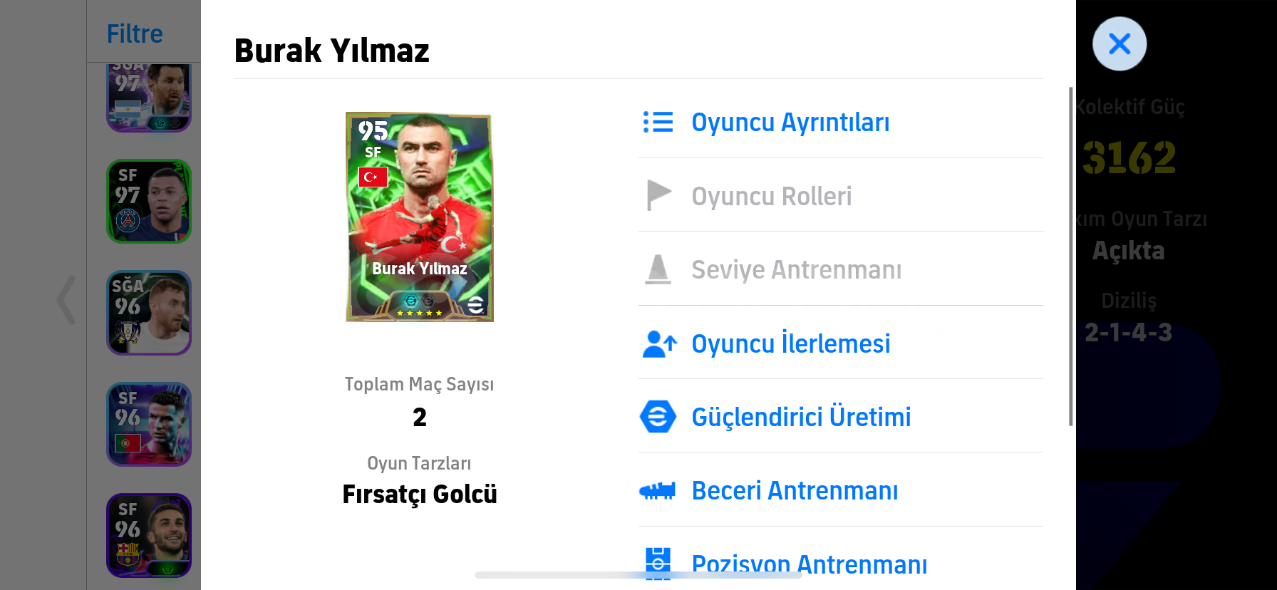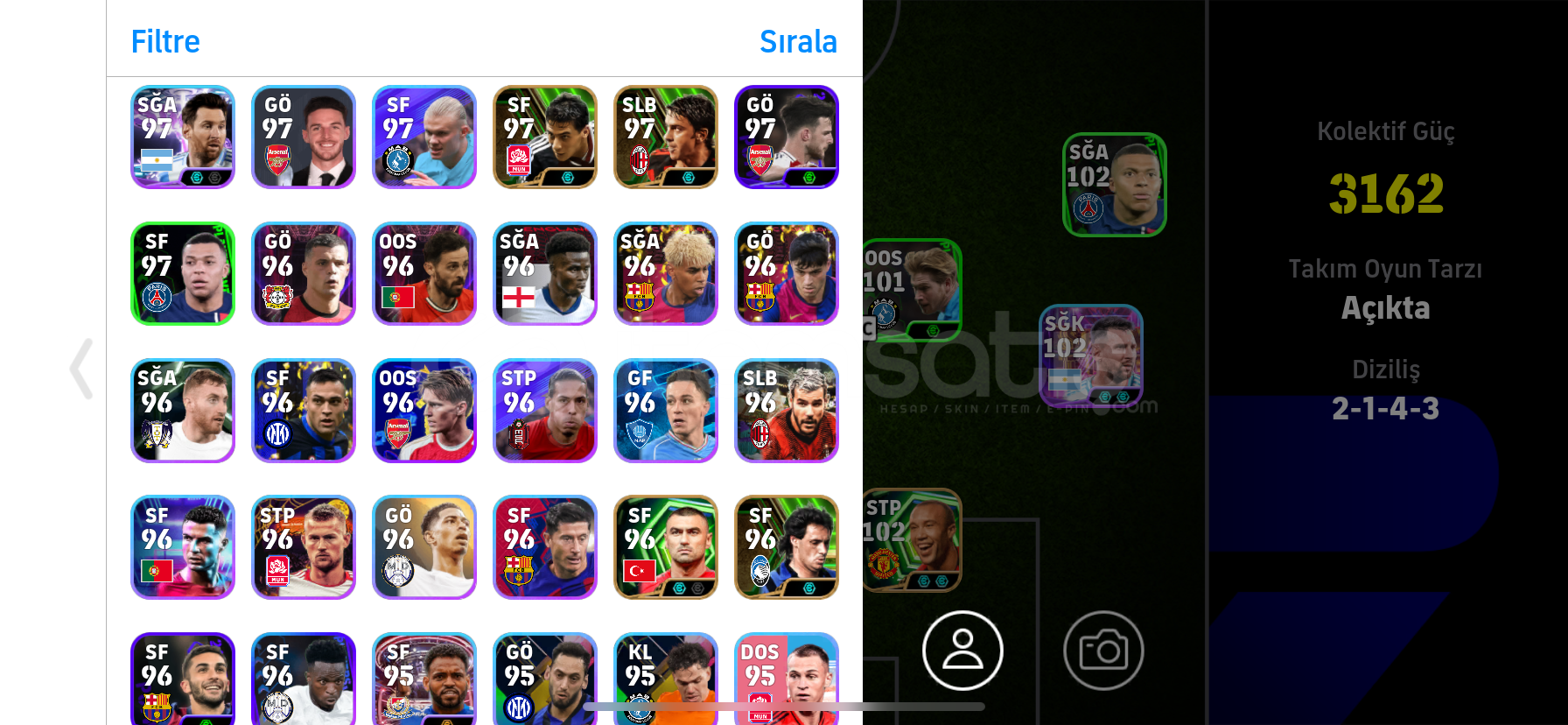 ÖNCELİKLE SELAMALEYKÜM ARKADAŞLARHESABIN 3162 KOLEKTİF GÜCÜ BULUNMAKTADIRHESAPTA -DESİRE DOUE- -RİVALDO- -JULİO CESAR- -DROGBA -VİCTOR OSİMHEN VE BOMBACI BURAK YILMAZ VB ÇOK NADİR DEĞERLİ GÜZEL OYUNCULAR VARDIRKONAMİ İD YE BAĞLIDIR HEMEN TESLİM EDİLİR
