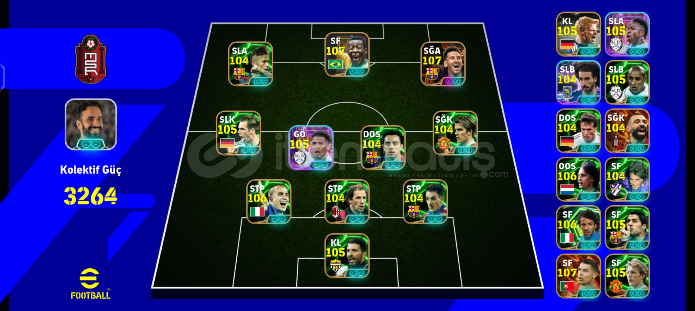 Hesabı almak isteyenler iletişime geçsin hesaptaki oyuncular:Neymar Messi Suarez Pele Ronaldo cucurella haaland baressi cannavaro Buffon Oliver kahn Peter schmichel grevanberch dumfrise Albert ferer bellingham Beckham lahm hazard Dembele ilk 11 yedekleri:David villa bombacı Suarez Carlos Buffon delpirro seedorf vinicius junior xavi Pele kubo rodri Neymar Jr kadro dışı yedeklerde 2 Messi ve daha fazla epic kart vardır haftanın oyuncuları da çok fazla
