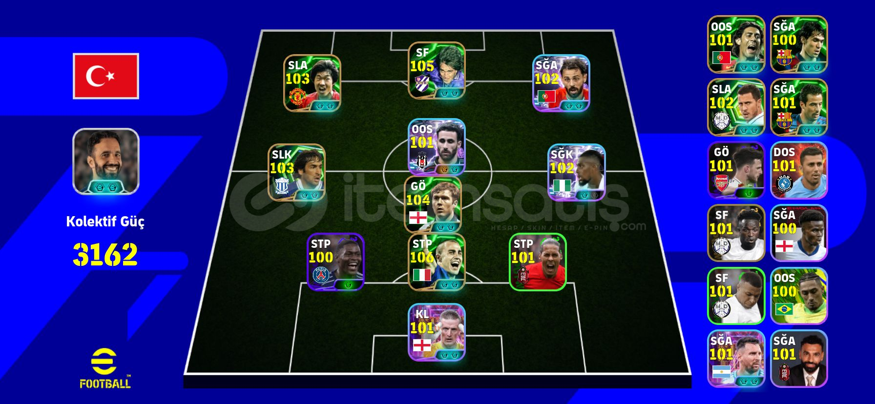 ⭐106 Cannavaro⭐⭐105 Gabriel Batistuta⭐⭐104 Paul Scholes⭐⭐103 Axel İwobi⭐⭐101 Show Time Rafa Silva⭐⭐103 Bernardo Silva⭐⭐103 Park Ji Sung⭐⭐103 Raul⭐⭐⭐Dolu rezerv⭐⭐⭐⭐Hesapların maili değişir , tamamen sizin olur.⭐⭐⭐⭐7/24 Sınırsız destek verilir.⭐⭐⭐⭐Öm&u...