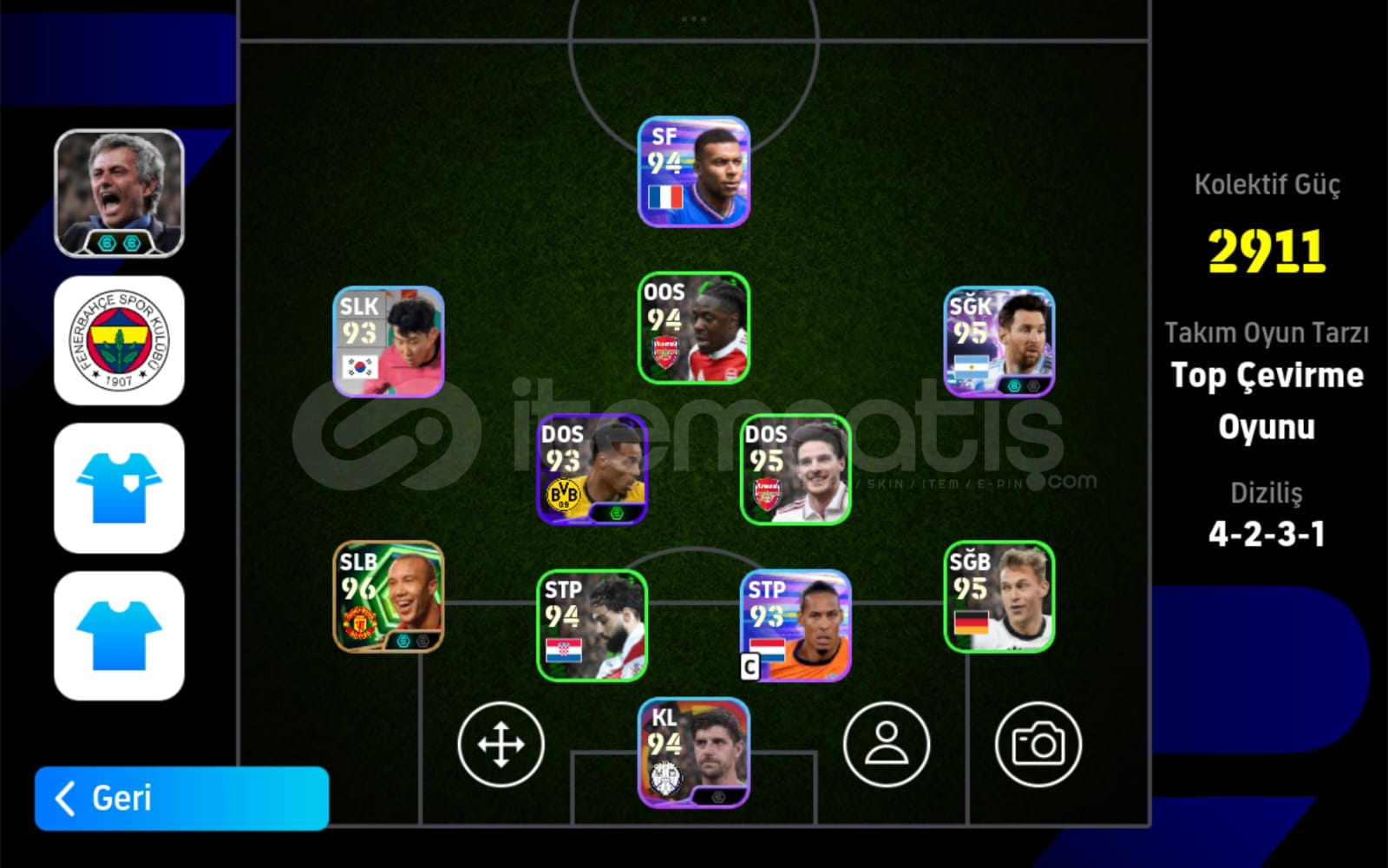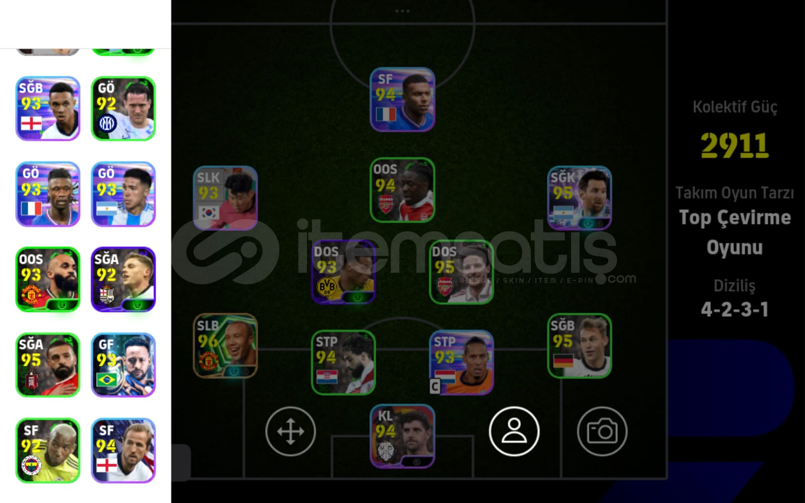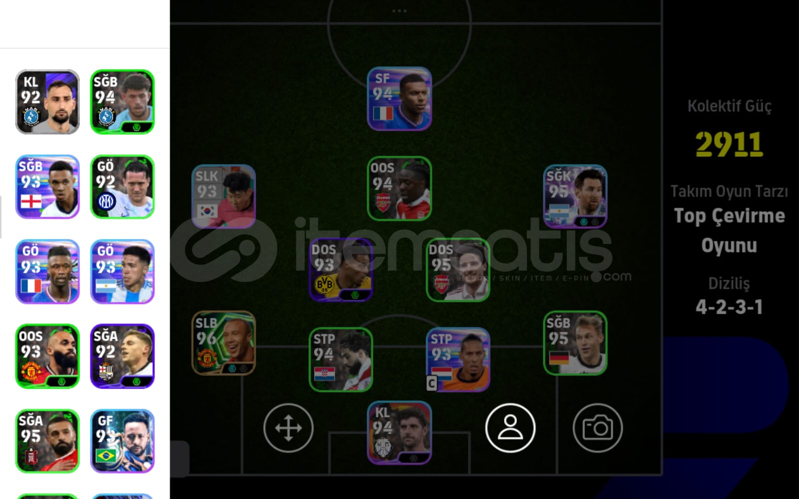 Hesap Bilgileri:Dream Team: 9. KlasmanKolektif Güç: 2911Toplam Oyuncu: 115Diziliş: 4-2-3-1Coin: 10GP: 0Konami ID: BağlıBan / Ceza: YokÖne Çıkan Oyuncular:Mbappé 94Messi 95Kane 96Kadro genel olarak 93–95 overallTeslimat:Konami ID üzerinden tam erişim verilecektir.Ödeme sonrası anında teslim.Fiyat: 100 TL 👉 Pazarlık payı vardır, ciddi alıcılar yazsın.