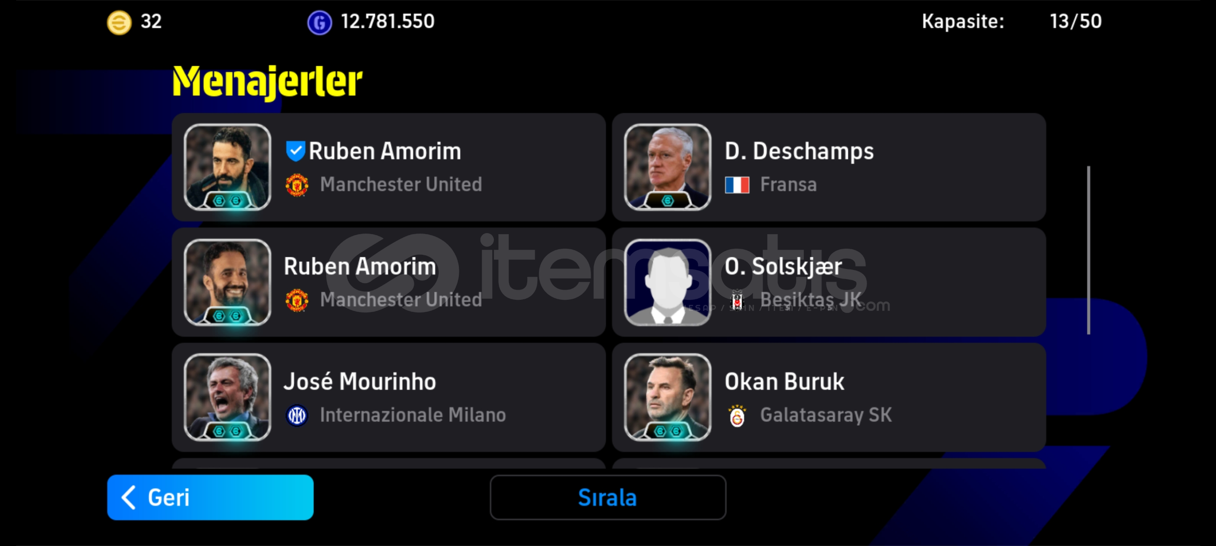 Hesapta birçok efsane ve nadir oyuncu bulunuyor — kadro tamamen oyuna hazır durumda. Oyuna girer girmez üst sıralarda rekabete başlayabilirsin.