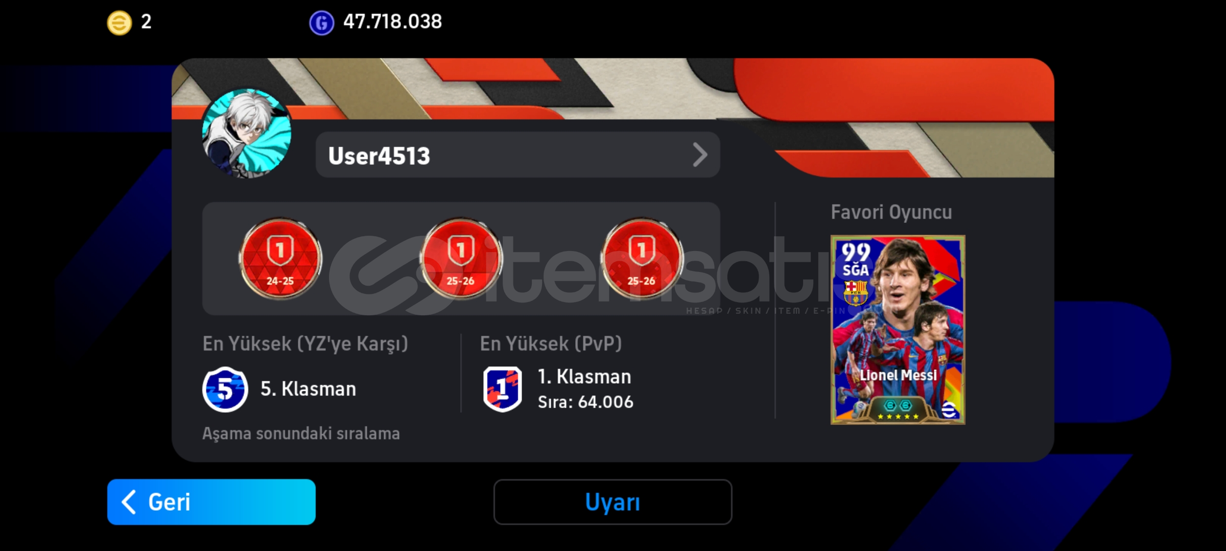 Hesaba göre verdiğim fiyat gerçekten çok uygun Efootball oynamayı bıraktığım için hesabı satıyorum çift bağdır e-posta adresini değiştirebilirsiniz hesabı tamamen üzerinize geçirebilirsiniz herhangi bir problem olmaz detaylı bilgi için yazabilirsiniz. Ekstra olarak Süper Lig takimimda var
