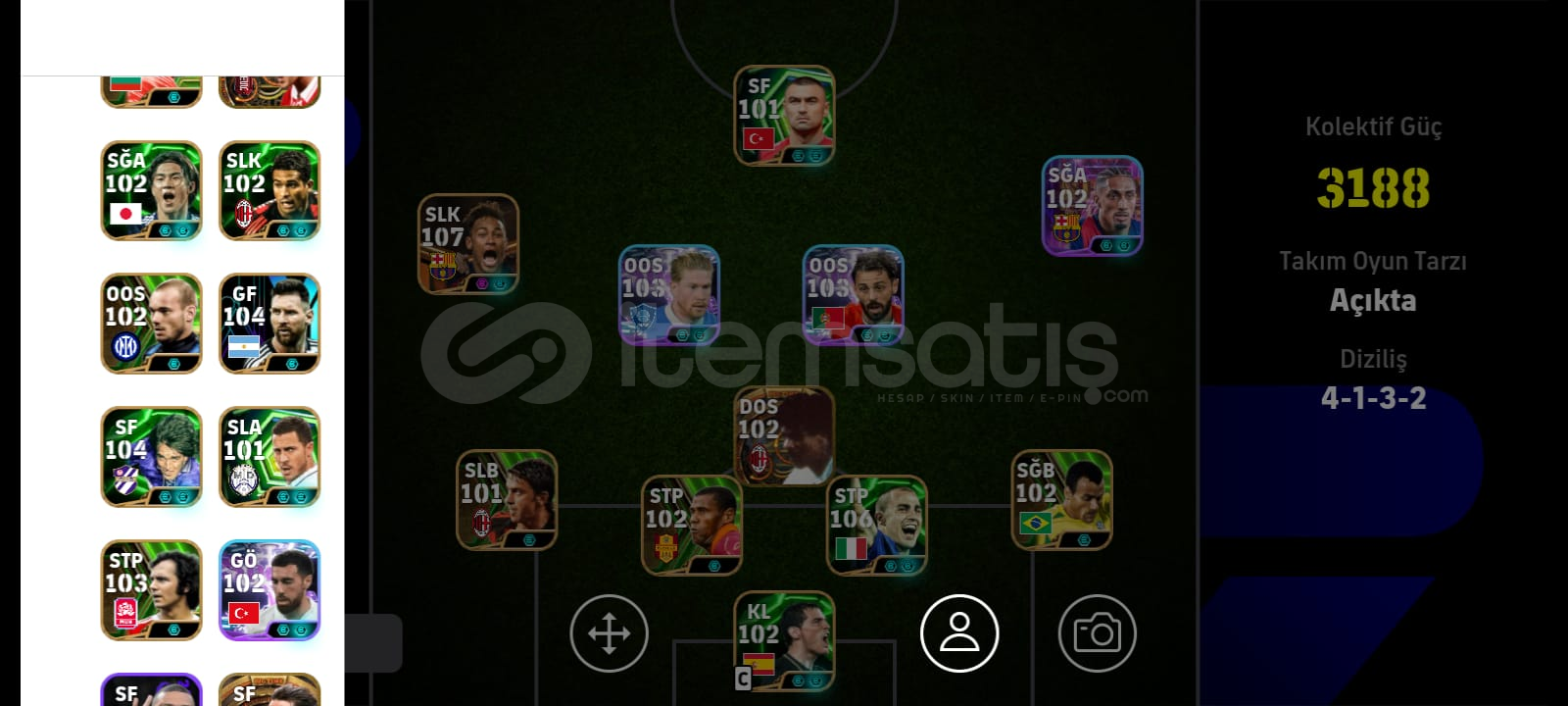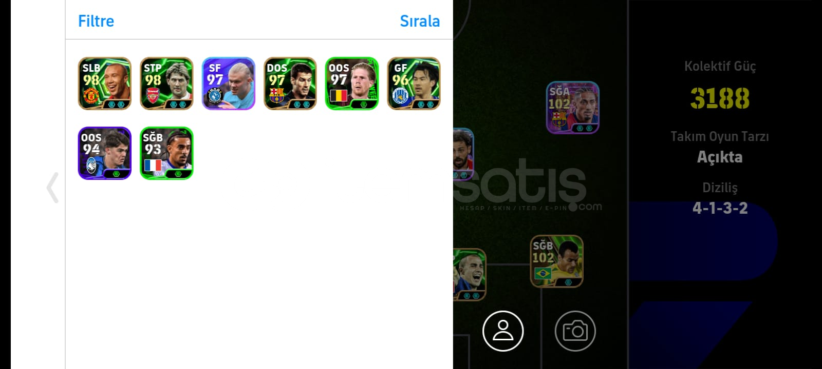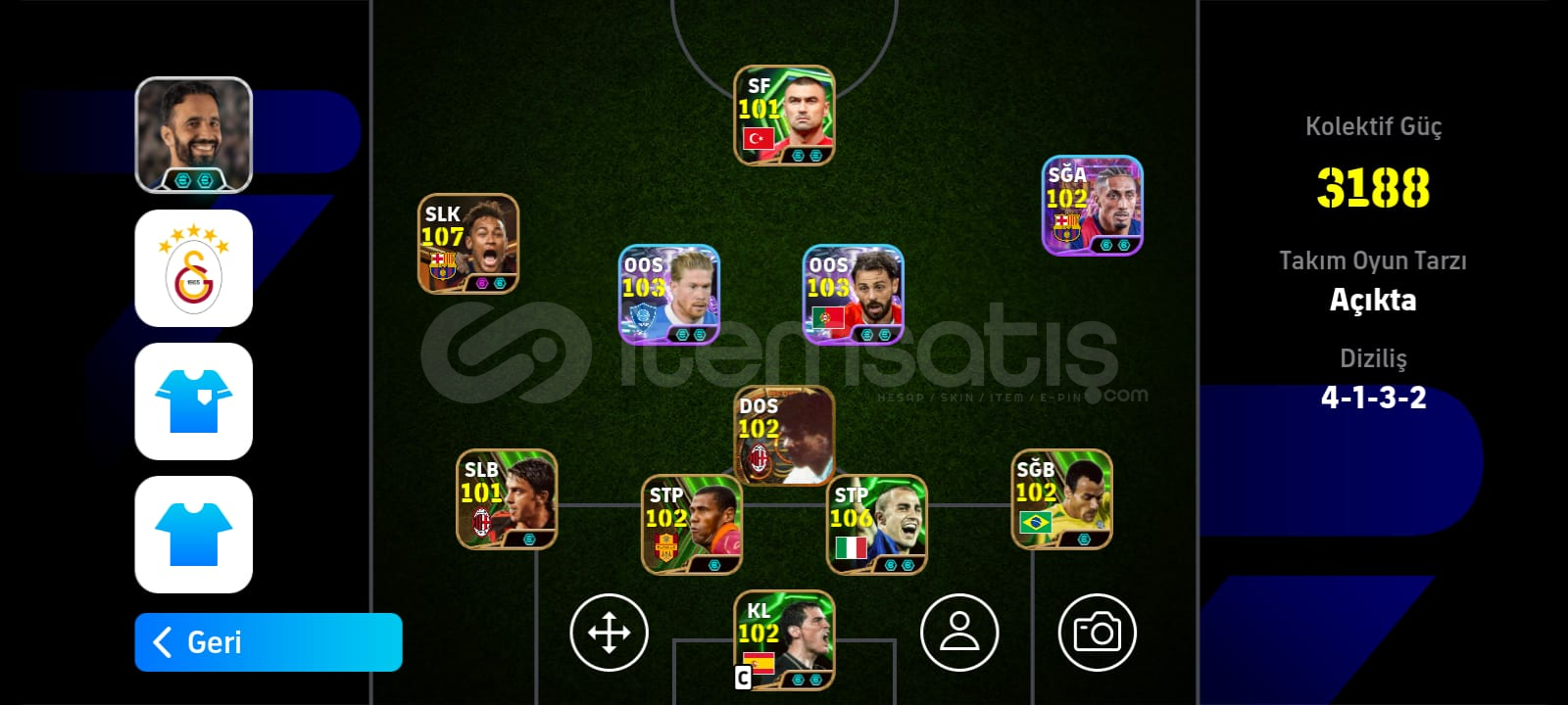 ⚽ Genel Hesap BilgileriKolektif Güç: 3188Diziliş: 4-1-3-2Takım Oyun Tarzı: Açık oyunKadro Durumu: Tam uyumlu, aktif dizilişOynanabilirlik: Online maçlara ve turnuvalara uygundur🏆 Kadro ÖzetiForvet & Hücum Hattı:100+ reytinge sahip bitirici santraforHızlı ve teknik ikinci forvetOrta Saha:103–105 reyting arası ofansif orta sahalarOyun kurucu ve şut tehdidi yüksek kartlarDefansif orta saha...