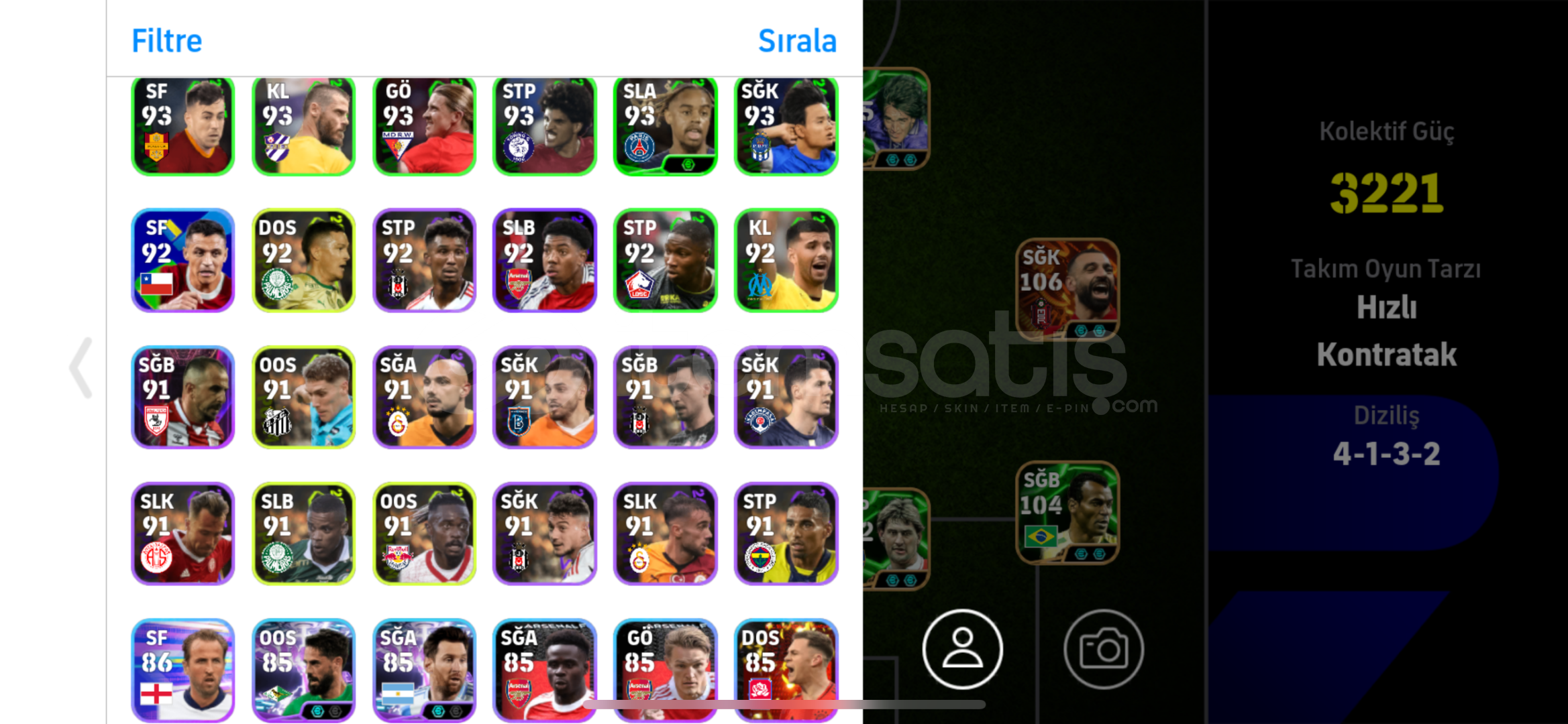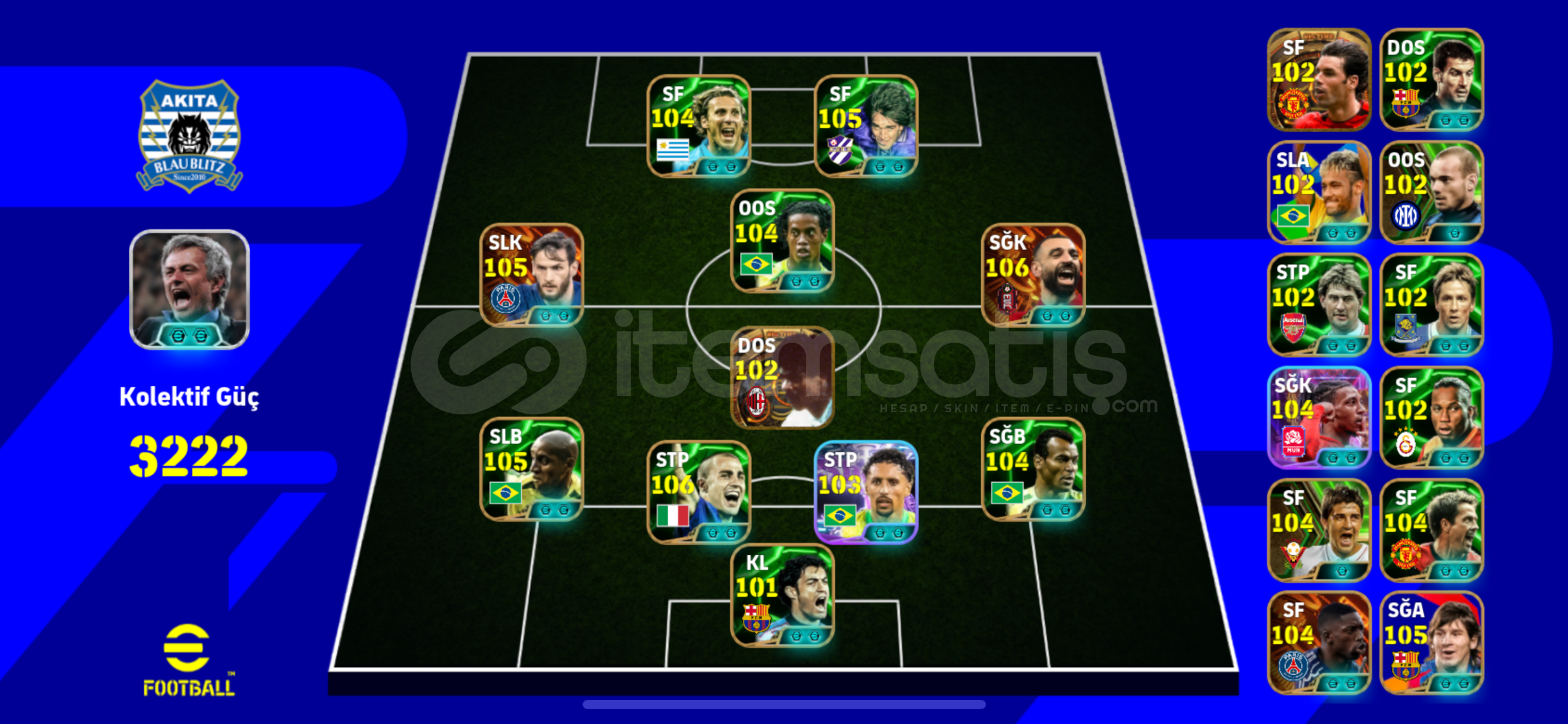 Bu hesapla eFootball'da zirveye oyna!Oyuncuların hepsi en iyi şekilde özel basım kullanılarak oluşturulmuştur.Hesap oynamaya hazır taktikler en iyi şekilde ayarlanmıştır. Klasman hesabıdır.3221 Kolektif Güç105'lik Forvetler, 106'lık Santrafor ve sayısız Efsane/Destansı Kartlar.Capello, Mourinho, Xabi Alonso, Beckenbauer gibi efsane menajerler.Hemen hazır 4-1-3-2 Hız...