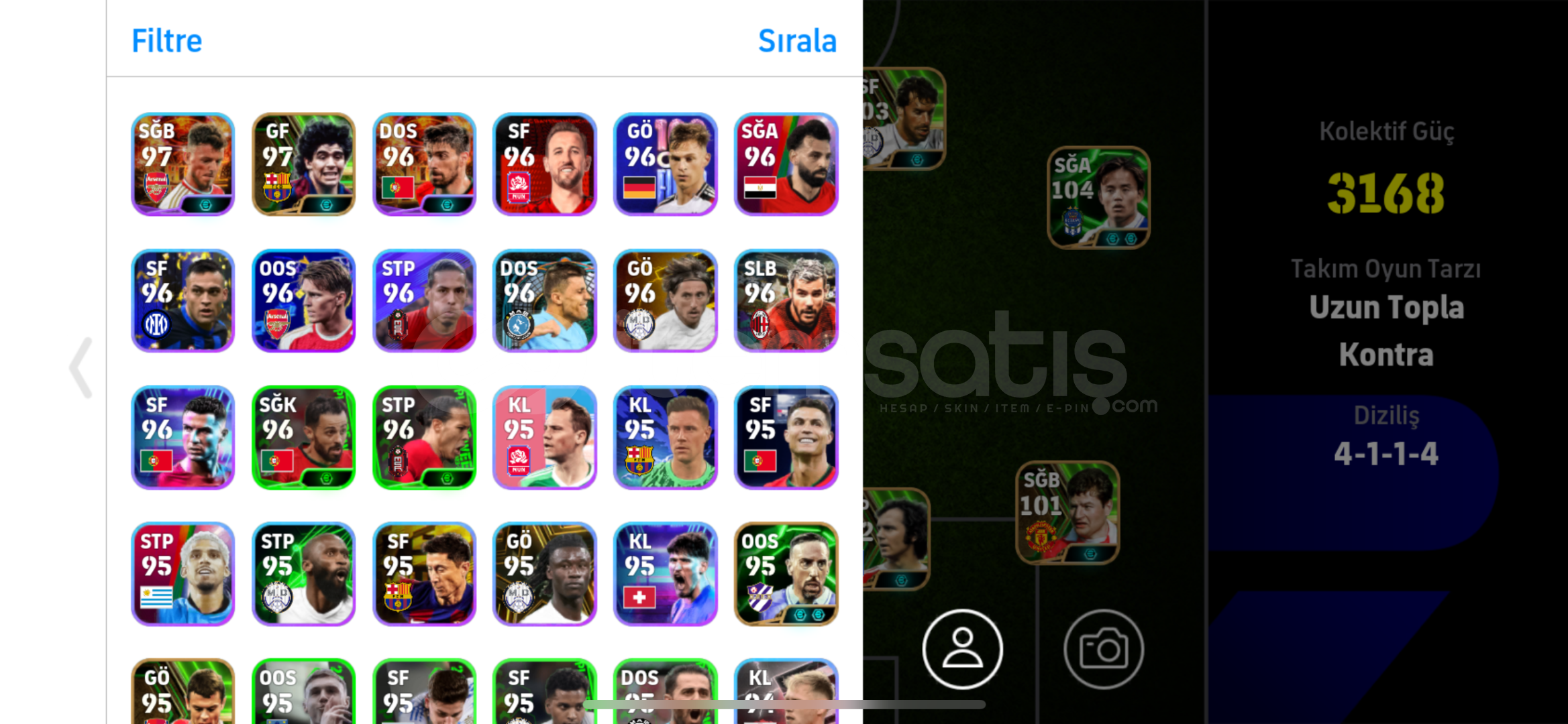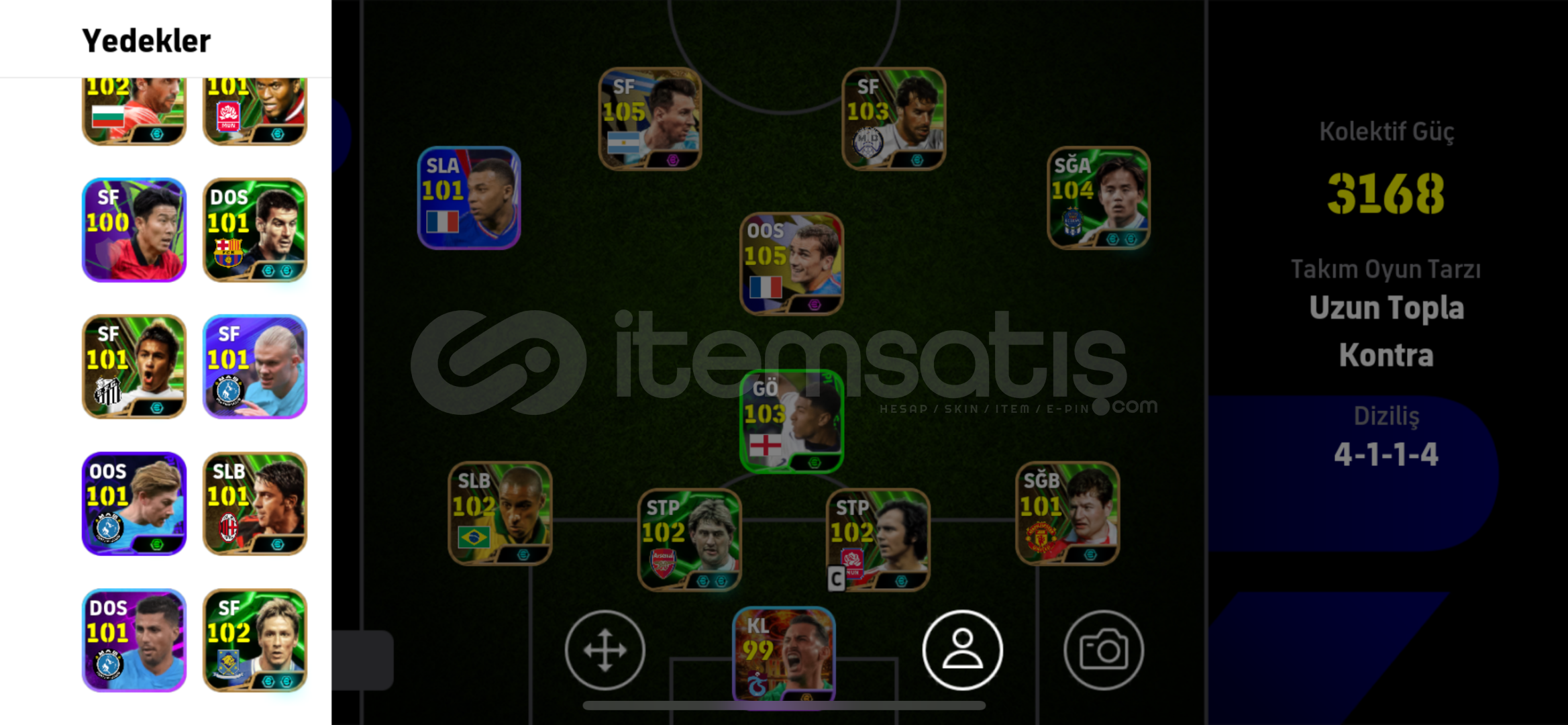105 messi 105 grizman 104 sağ kanat + 102 bombacı 103 2 tane pod hesap çok güzel eski hesap alan pişman olmaz