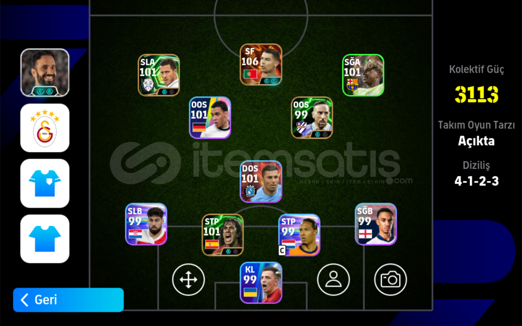 E futbol mobil 107'lik ronaldo'lu kolektif gücü 3113 olan bir hesap nadir kart da var
