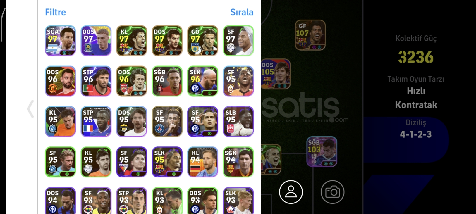 -----32236 KG-----107 MSN Suarez105 AĞ DELİCİ RONALDO106 CONTANA105 MESSİVE DAHA FAZLASI.........Fazlasıyla epic ve show time oyuncular vardır.Şanslı hesaptır, çoğu oyuncu ilk seferde çıkmıştır.Alan pişman olmaz.Hiçbir sıkıntısı yoktur ve TEK BAĞdır.Alıcısına şimdiden hayırlı uğurlu olsun. 🎉