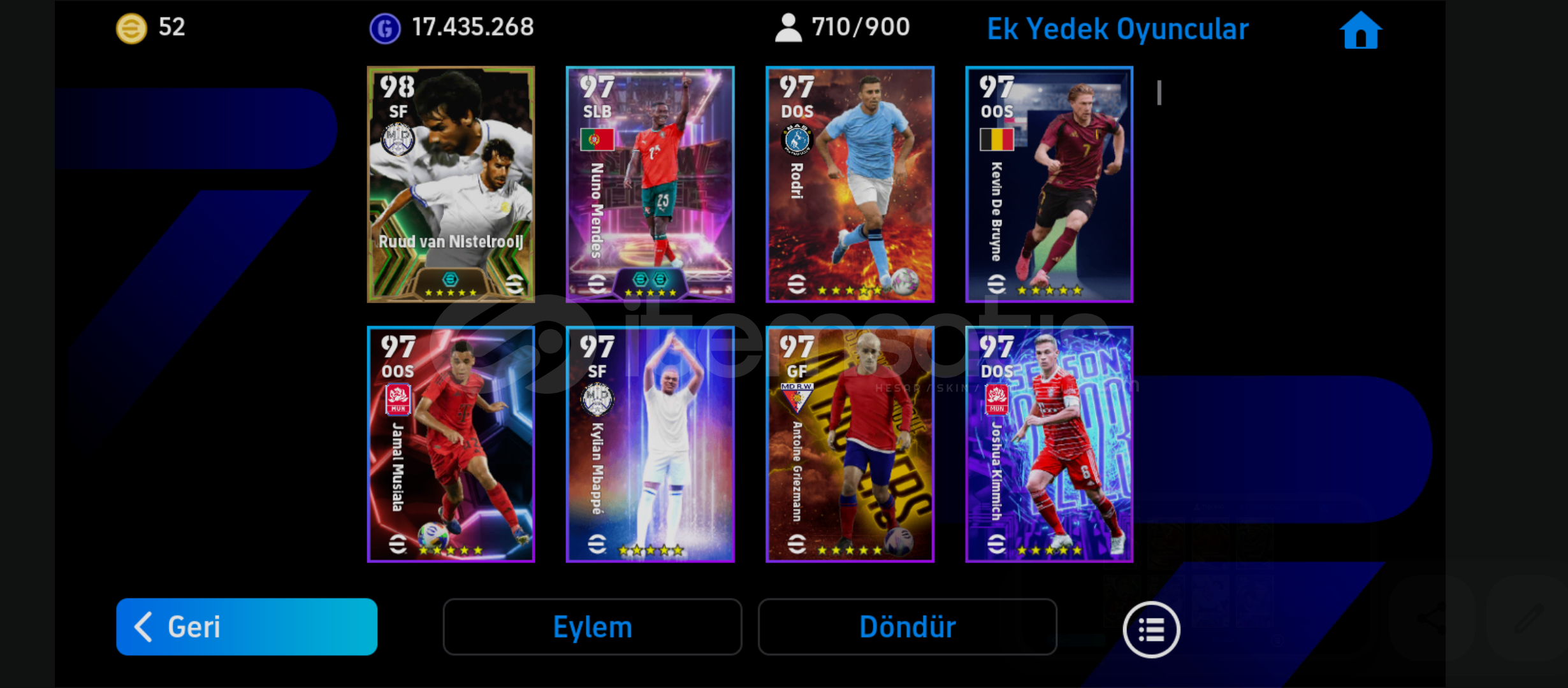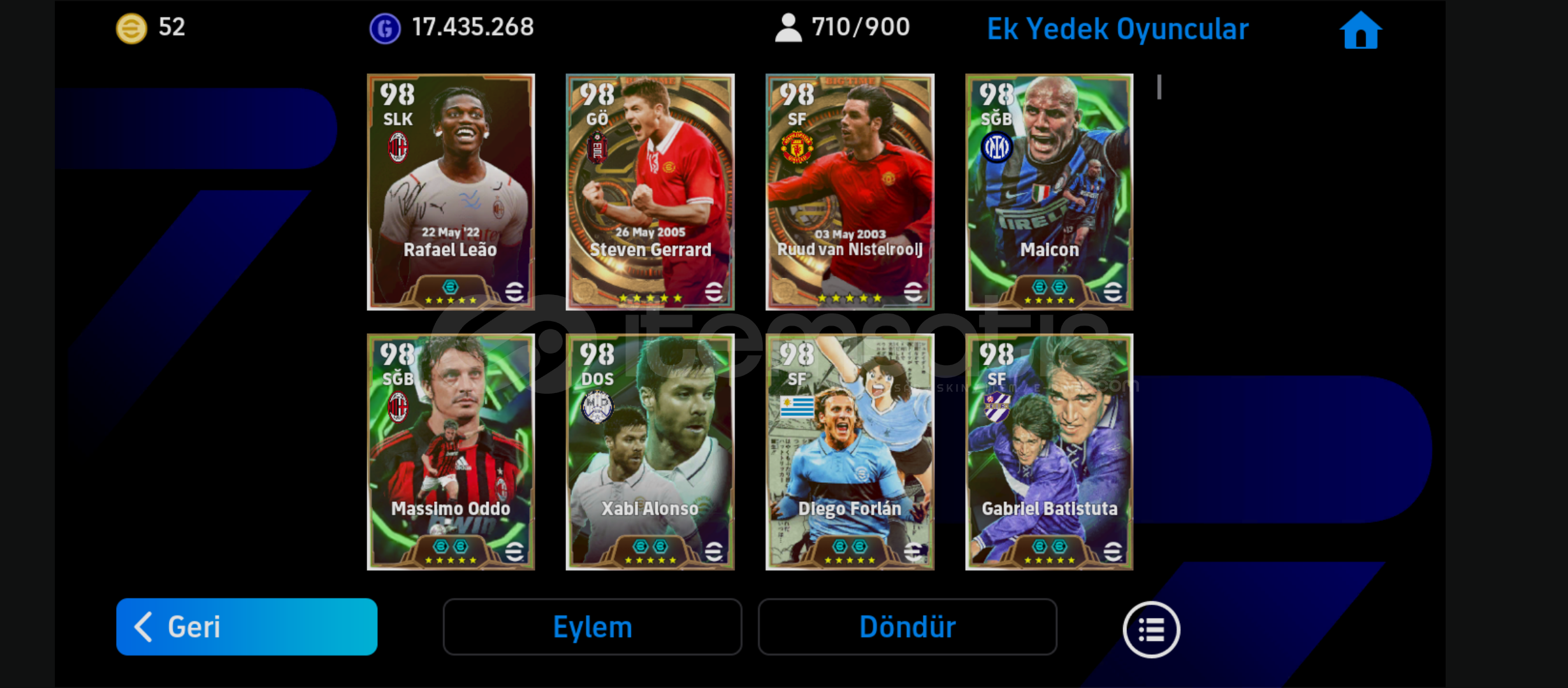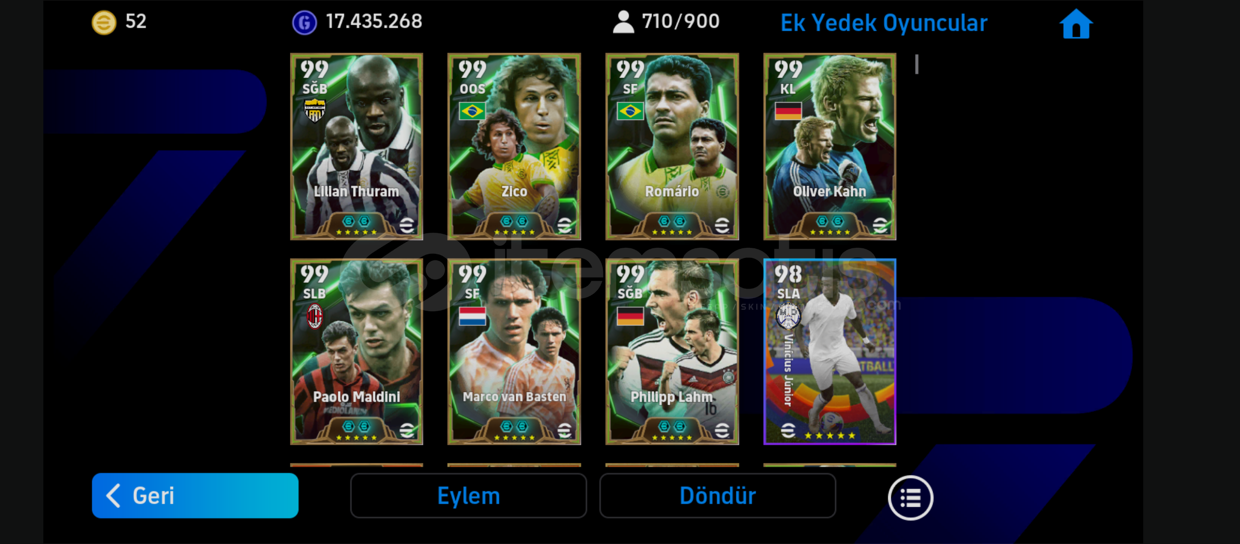 Selam hesapta -mc yok konami id sorunsuz google playi ölü bağ ama Kendi hesabim dolayısıyla sorun yasamazsiniz istediğiniz gibi iletişim kurarız problem olmaz Bombacılar Zico, Rafa Silva, Burak Yılmaz çok nadir oyuncular vardır buffon hazardın en eski kartları
