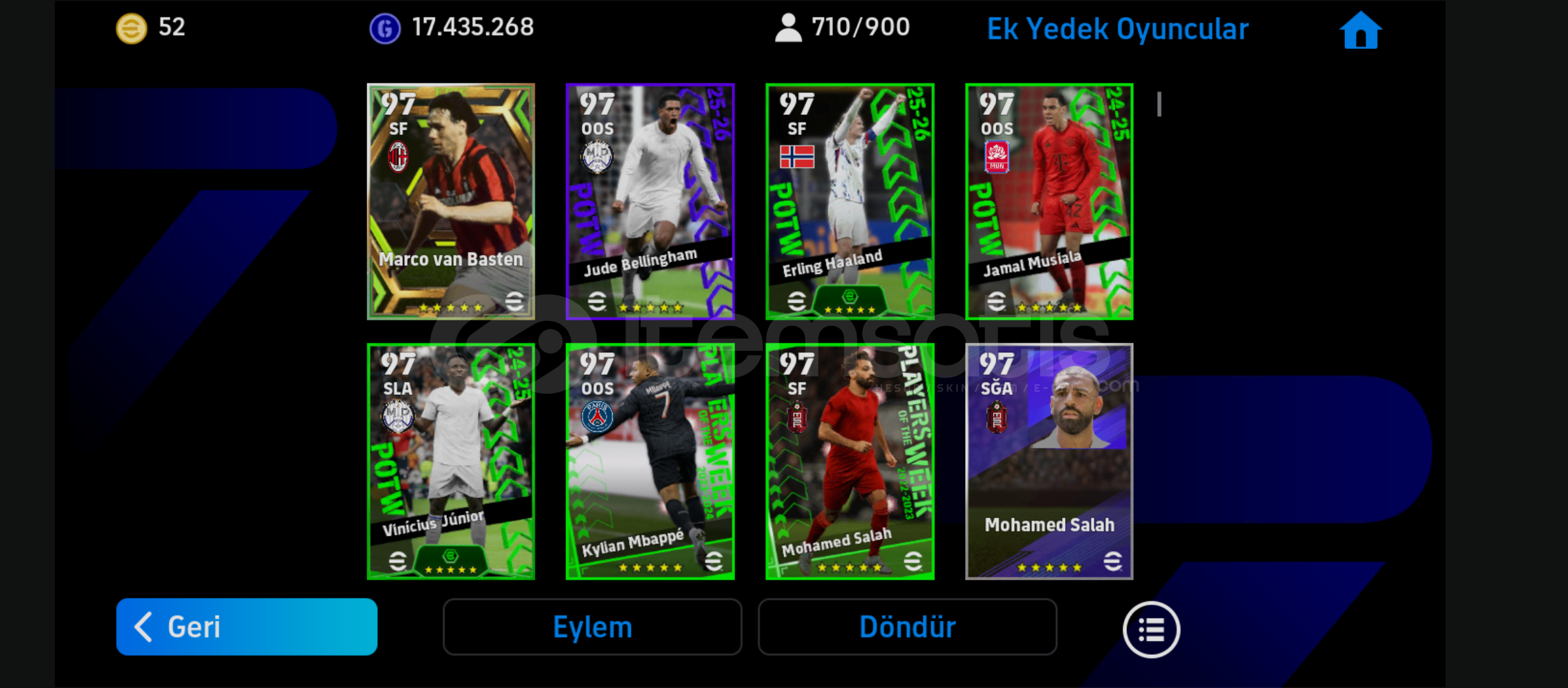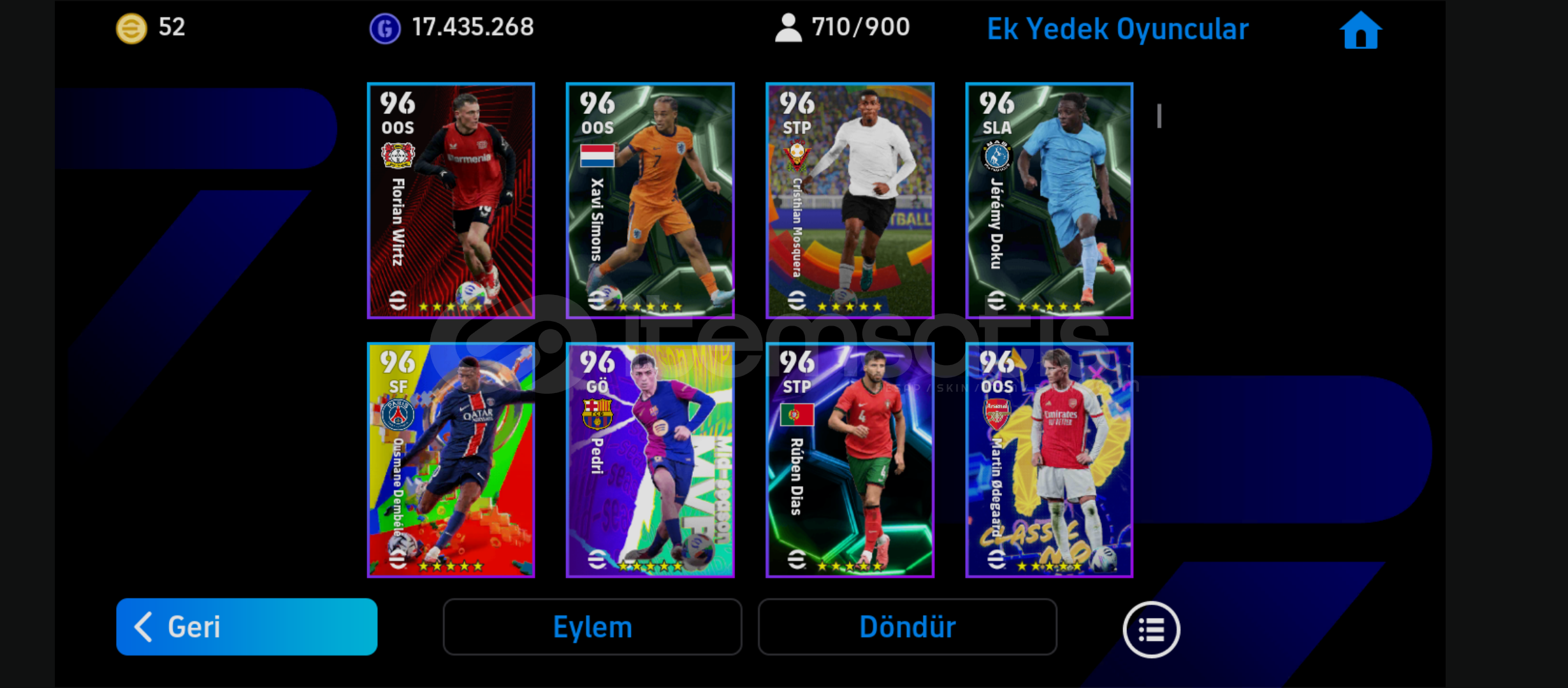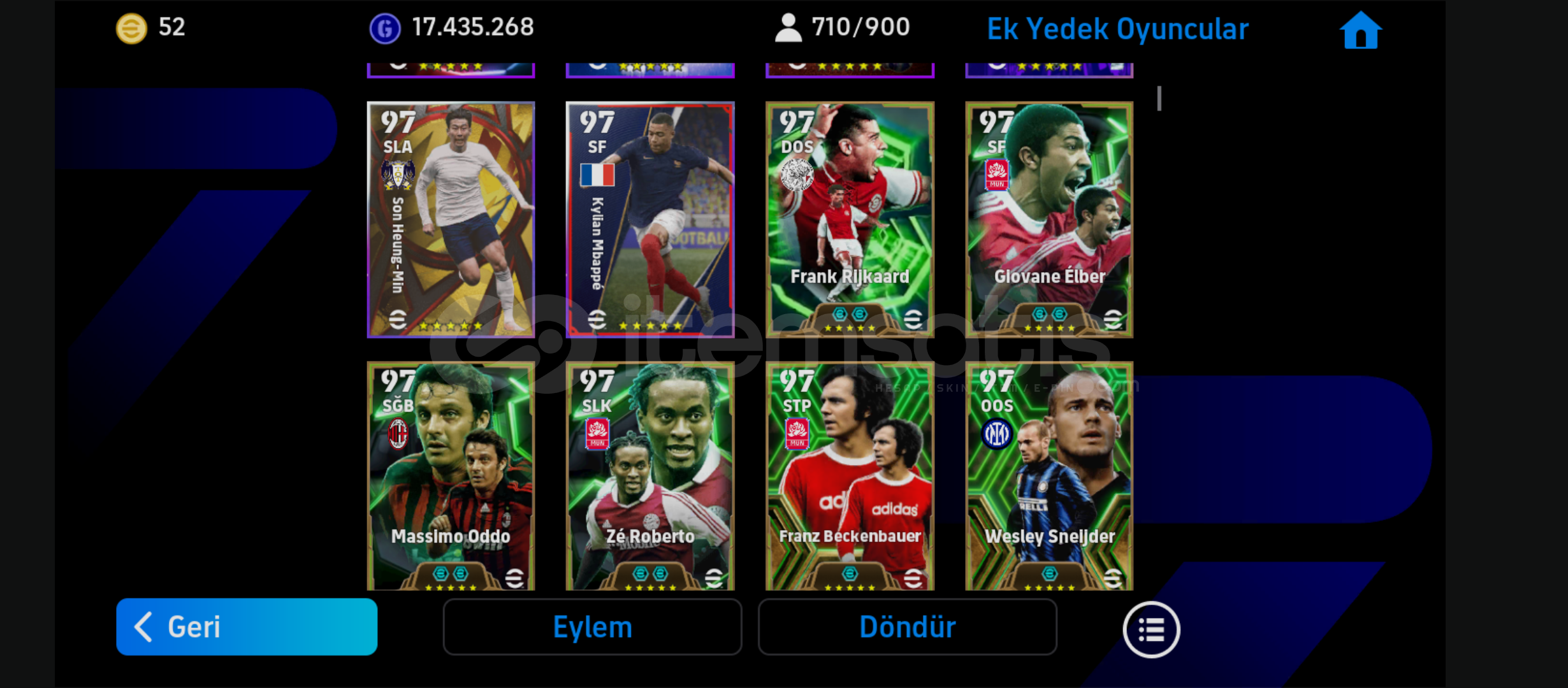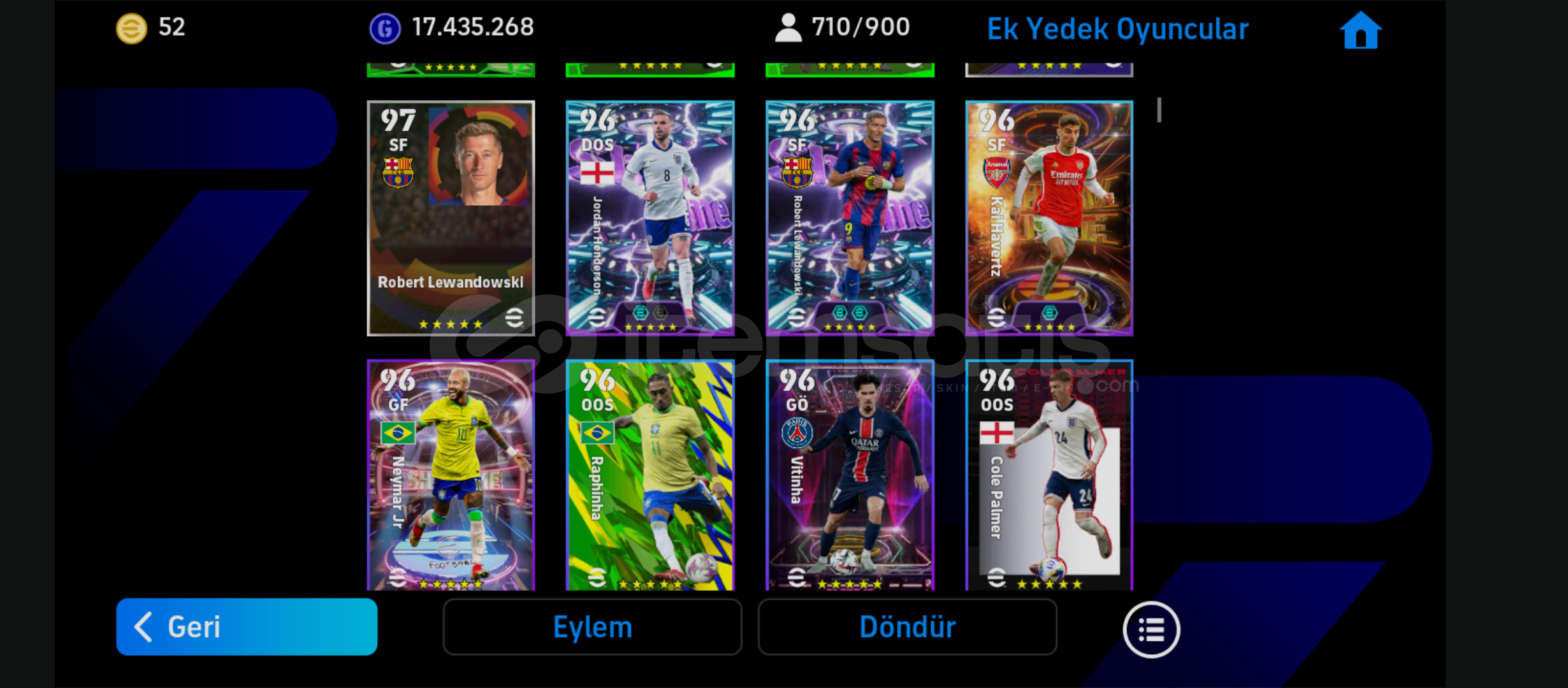 Selam hesapta -mc yok konami id sorunsuz google playi ölü bağ ama Kendi hesabim dolayısıyla sorun yasamazsiniz istediğiniz gibi iletişim kurarız problem olmaz Bombacılar Zico, Rafa Silva, Burak Yılmaz çok nadir oyuncular vardır buffon hazardın en eski kartları