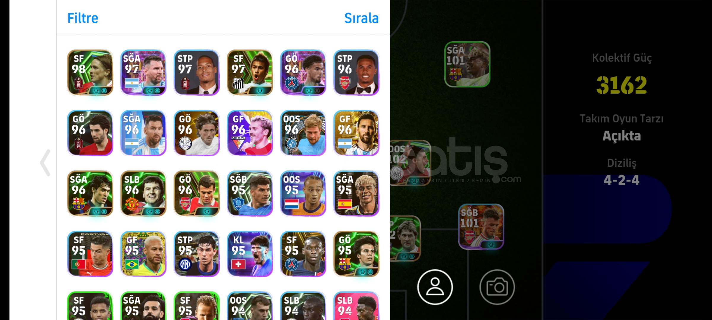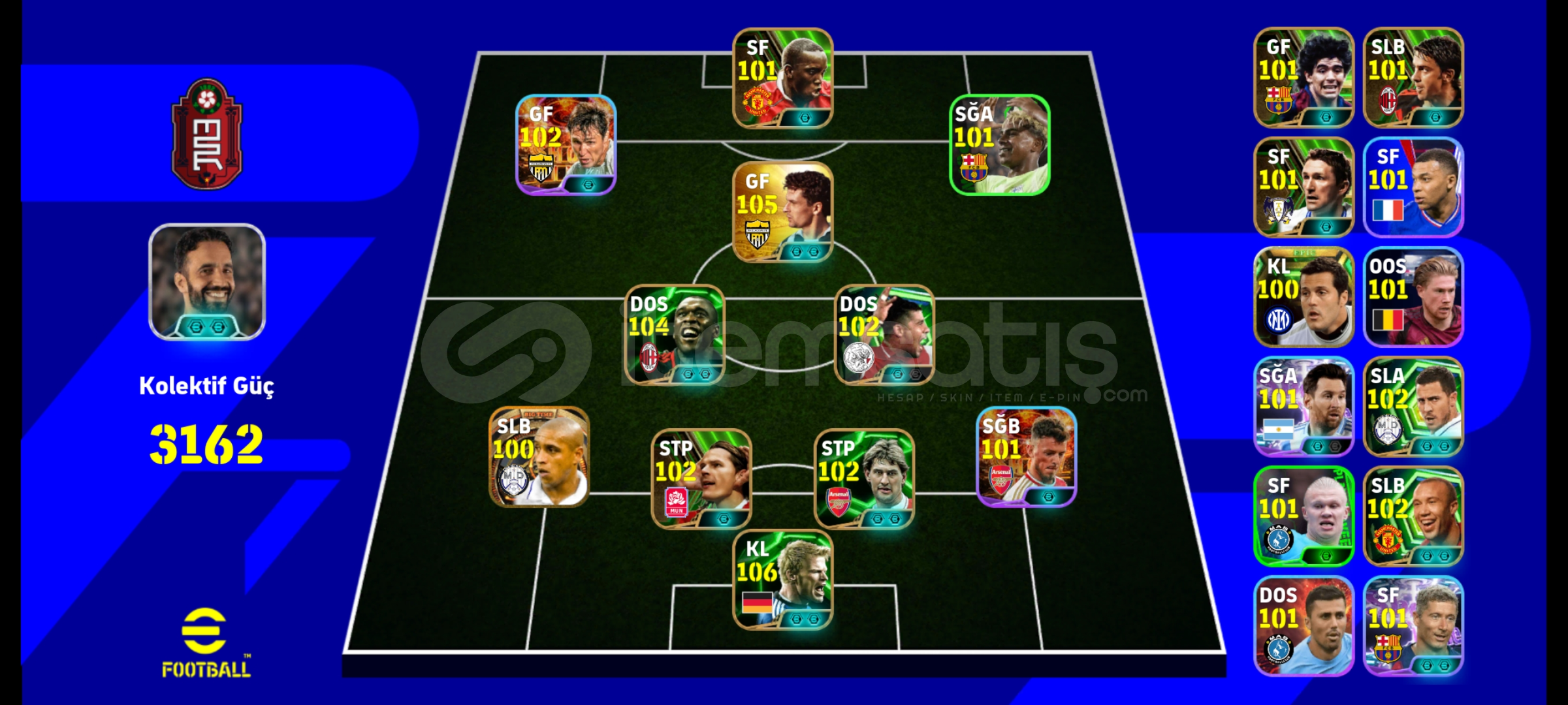 Beyler hesabım 10numara böyle hesabı böyle fiyata zor bulursun!105 Roggerto Baggio102 Chisea(bombacı)104 Clarance Seedrof106 OliverKahn102 KeaneÜSTELİK415 coin vardır