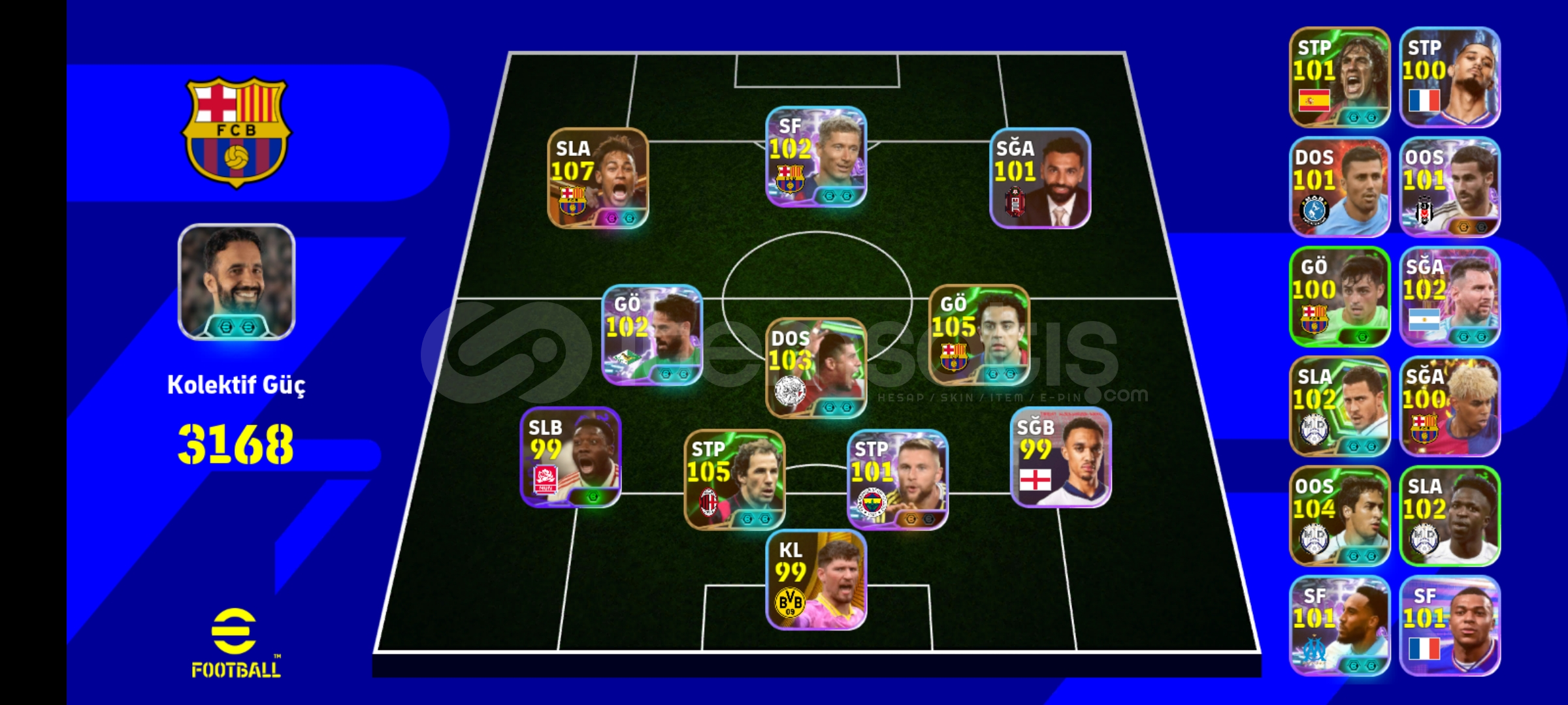 ŞANSLI EFSANE HESAP !!! 3168 TAKIM GÜCÜ !!!TEK BAĞ HESAP !!!3170+ POTANSİYELLİ HESAP !!!PAZARLIK YAPILABİLİR !!!107 NEYMAR105 XAVI105 BARESI104 RAUL103 RIJKAARD102 VINICIUS JR.102 LEWANDOWSKI102 ISCO102 HAZARD